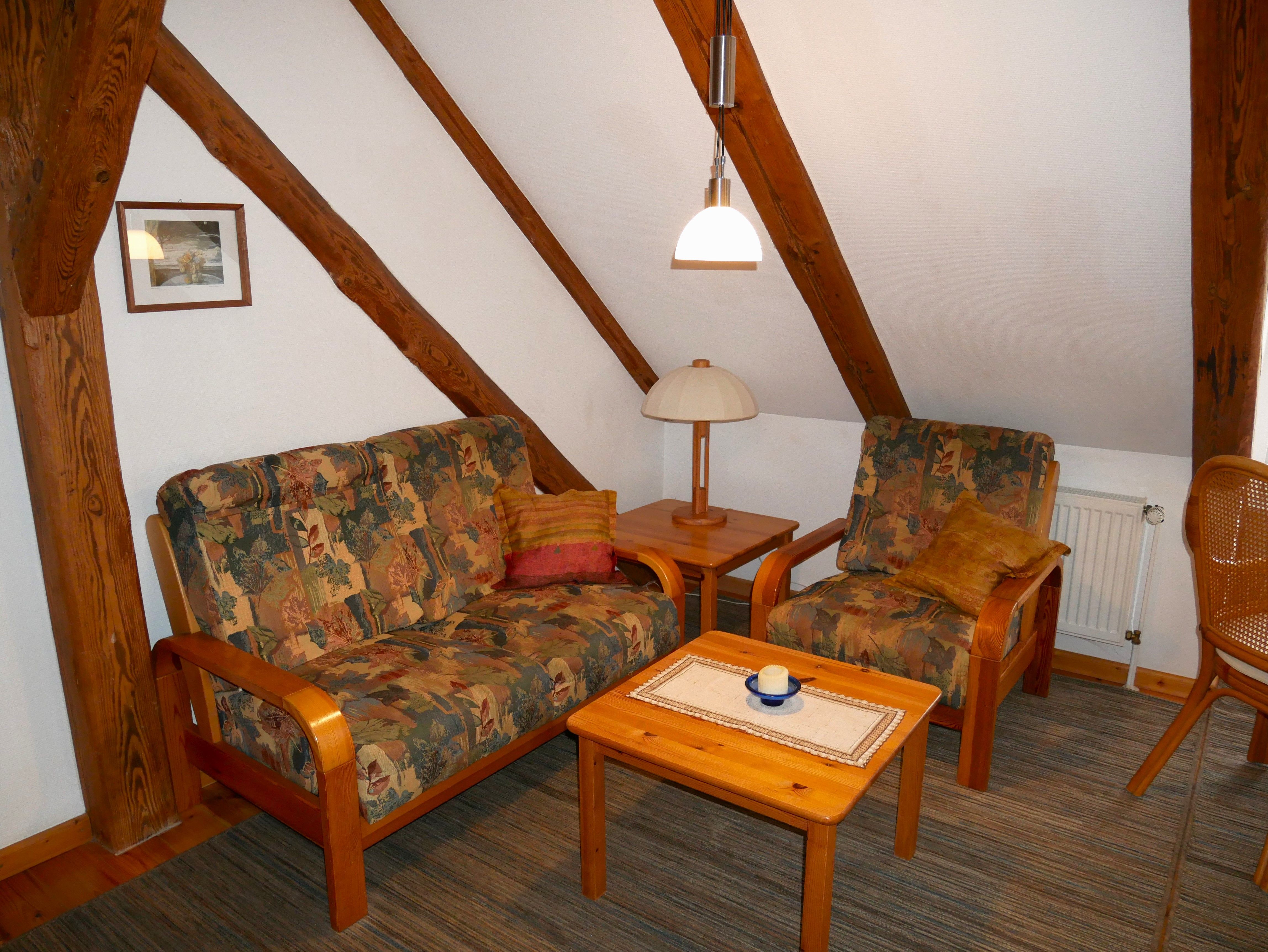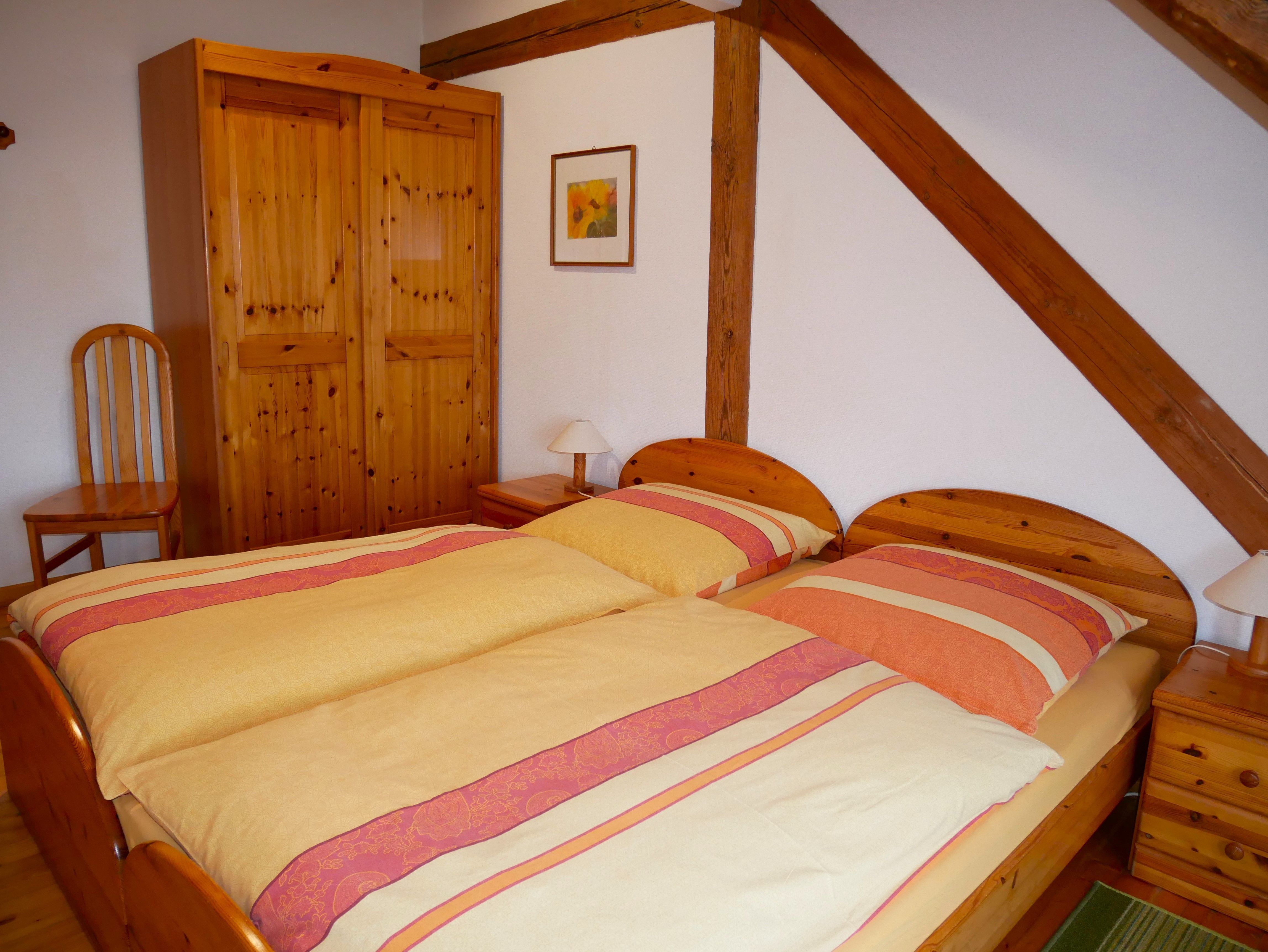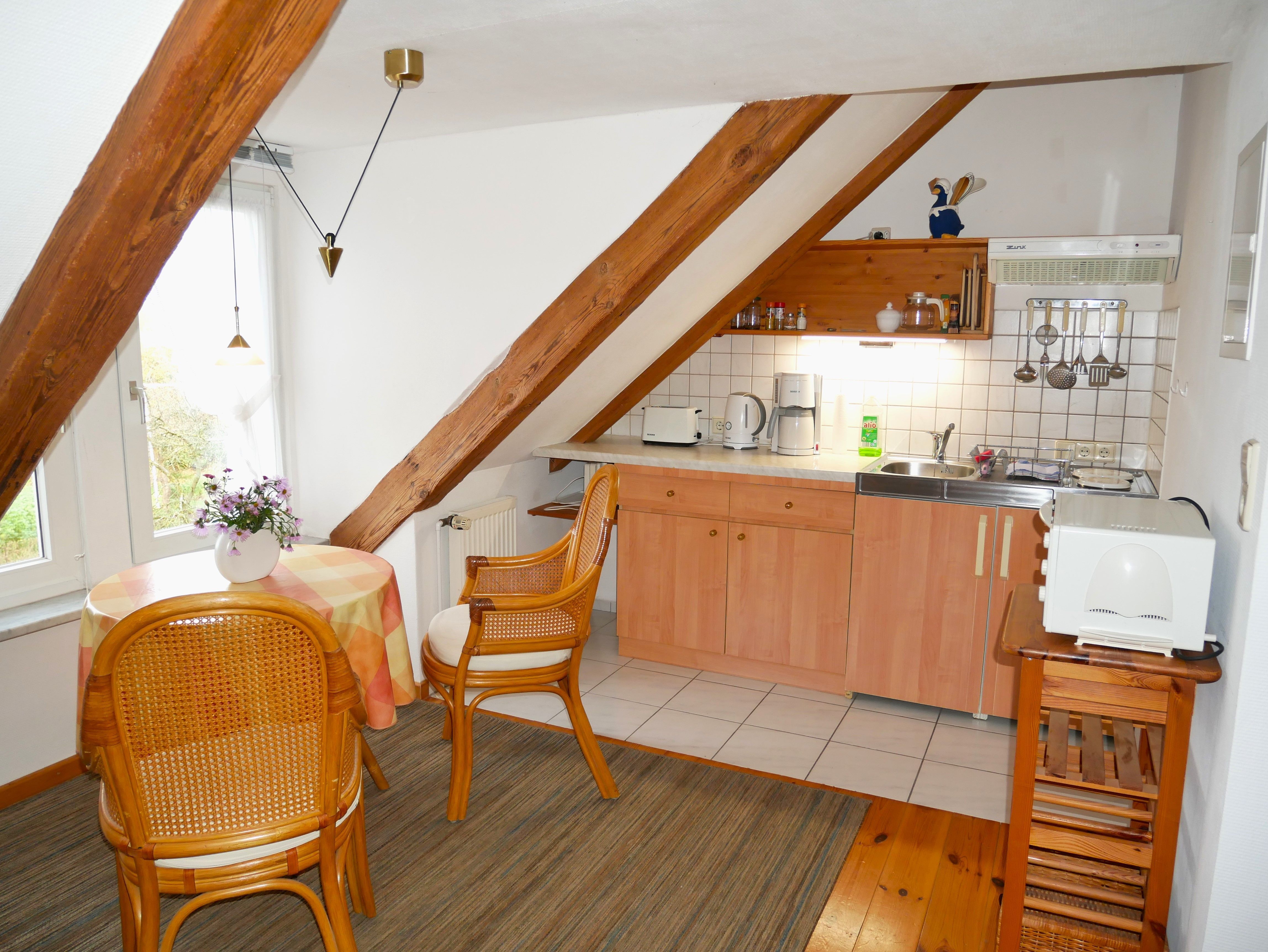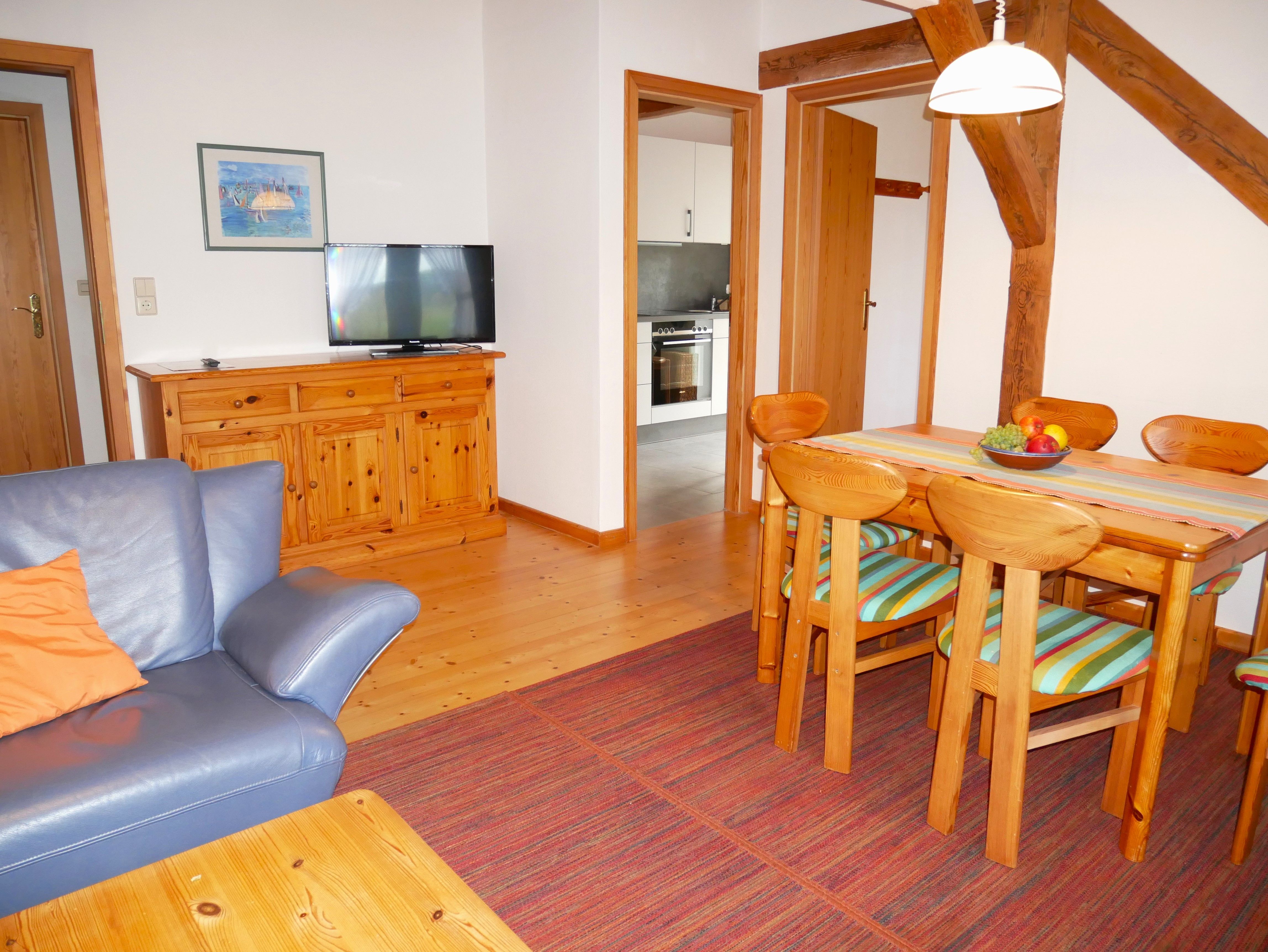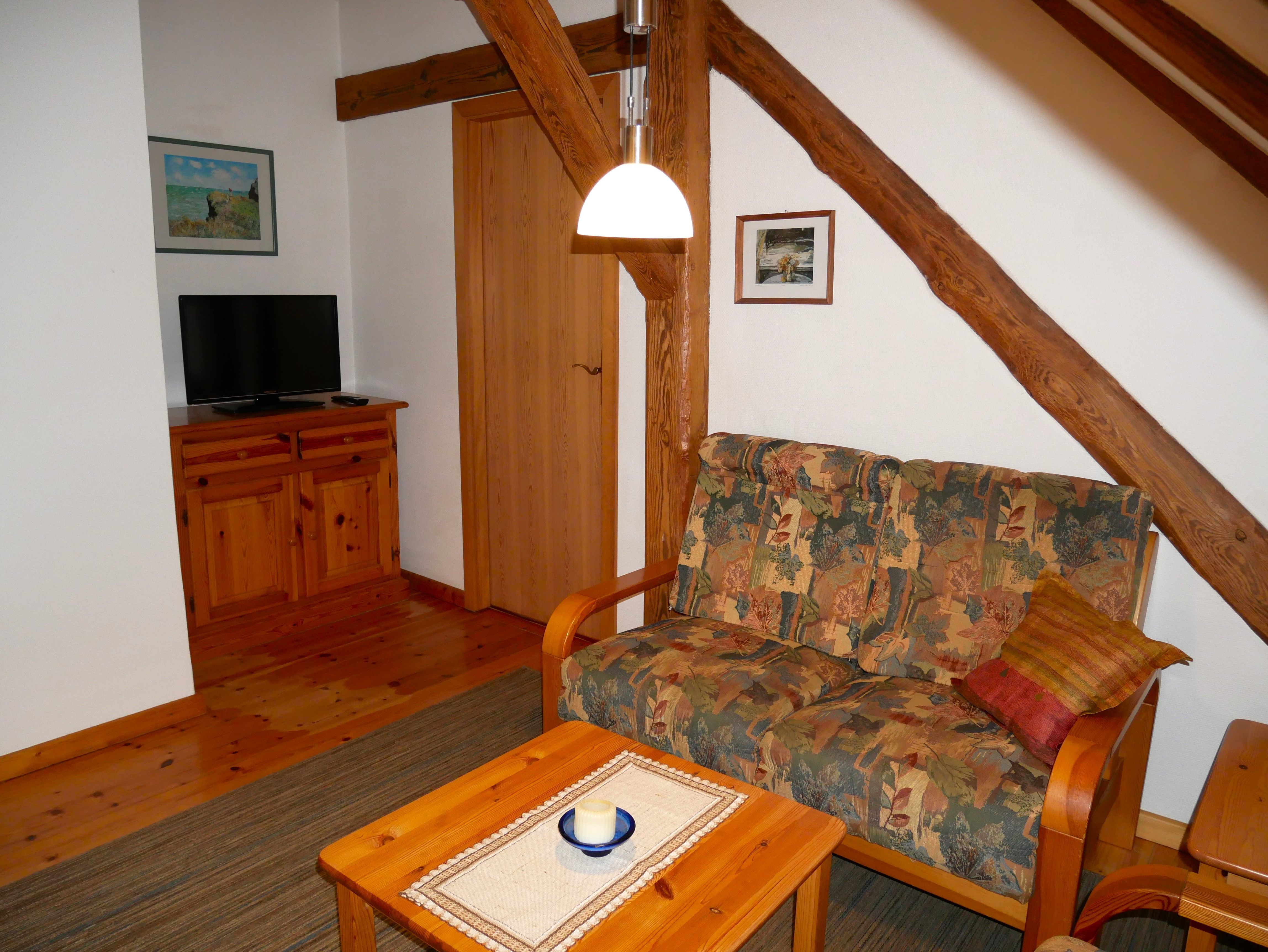 Die Wohnung verfügt über einen kombinierten Wohn- Essraum, mit Couchgarnitur, Sat- TV, Esstisch, Küchenzeile mit Kühlschrank, E- Herd,kleinen Backofen, Kaffeemaschine, Wasserkocher und Toaster. Das Badezimmer ist mit Dusche und WC ausgestattet. Das Schlafzimmer verfügt über ein Doppelbett und Kleiderschrank, eine Aufbettung kann im Kinderbett für 1 Kind bis zu 3 Jahren erfolgen. Ein Babystuhl kann auf Anfrage gestellt werden. Waschmaschinennutzung ist nach Absprache möglich. Die Bettwäsche und Handtücher sind inklusive.