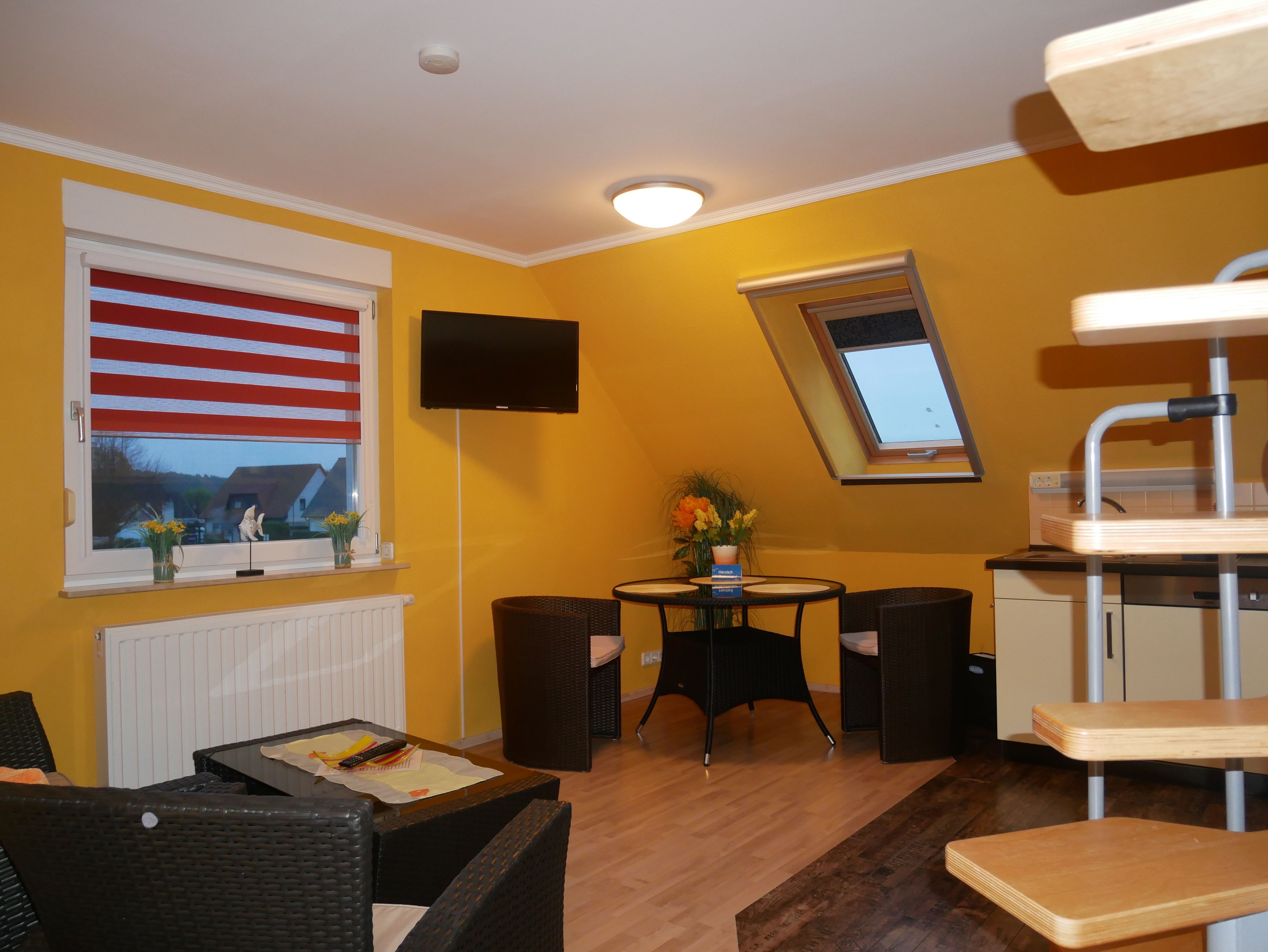 Der kombinierte Wohn- und Essbereich befindet sich in der unteren der zwei Etagen. Dort finden Sie eine gemütliche Sitzecke mit SAT/TV.