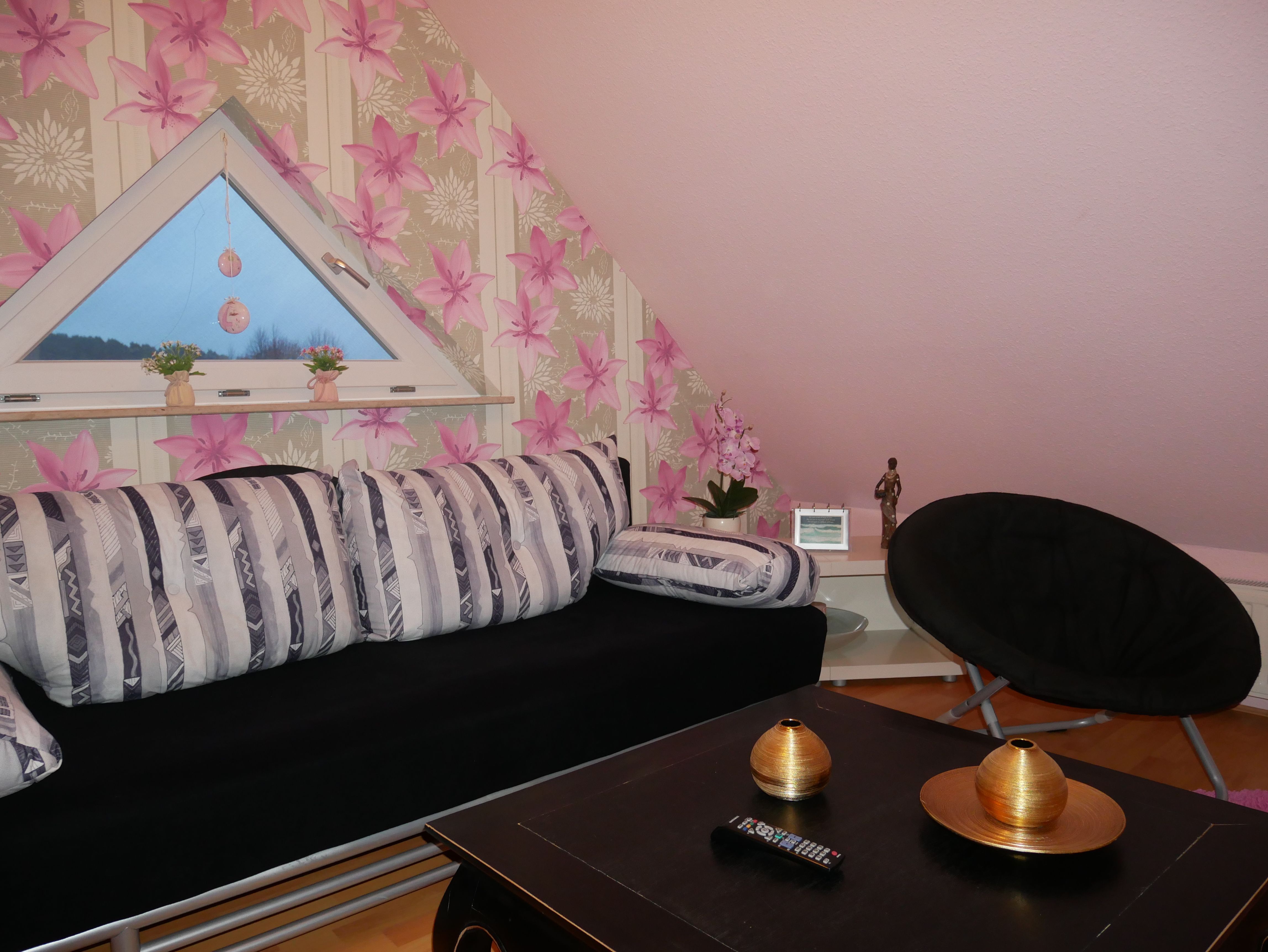 Das Badezimmer ist ausgestattet mit einer Badewanne mit Duschabtrennung, WC und Fön. Eine Etage höher befindet sich ein kleines Wohnzimmer mit einer gemütlichen Couch und einen weiteren Fernseher. Dieser Bereich ist über eine steile Raumspartreppe zu erreichen.