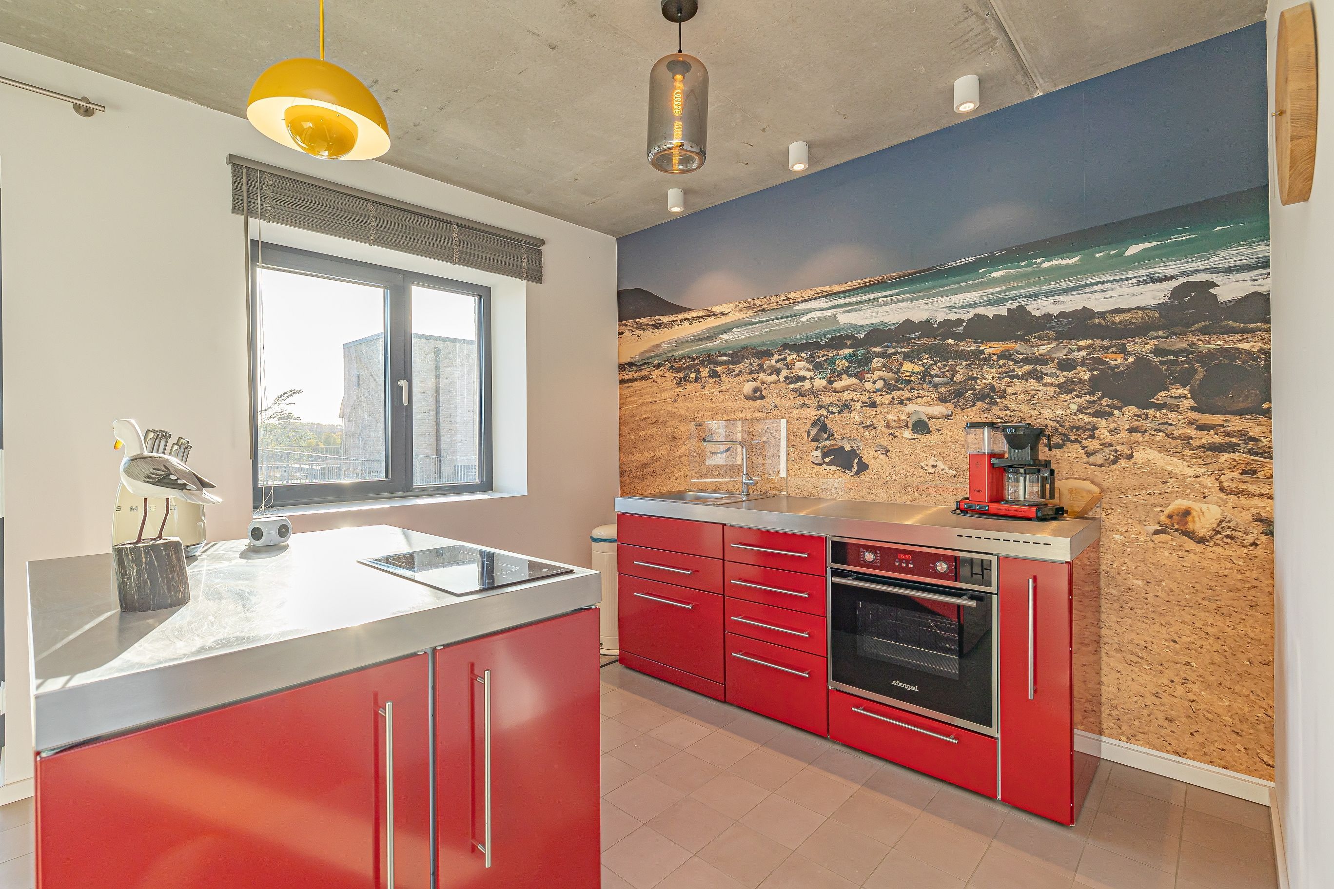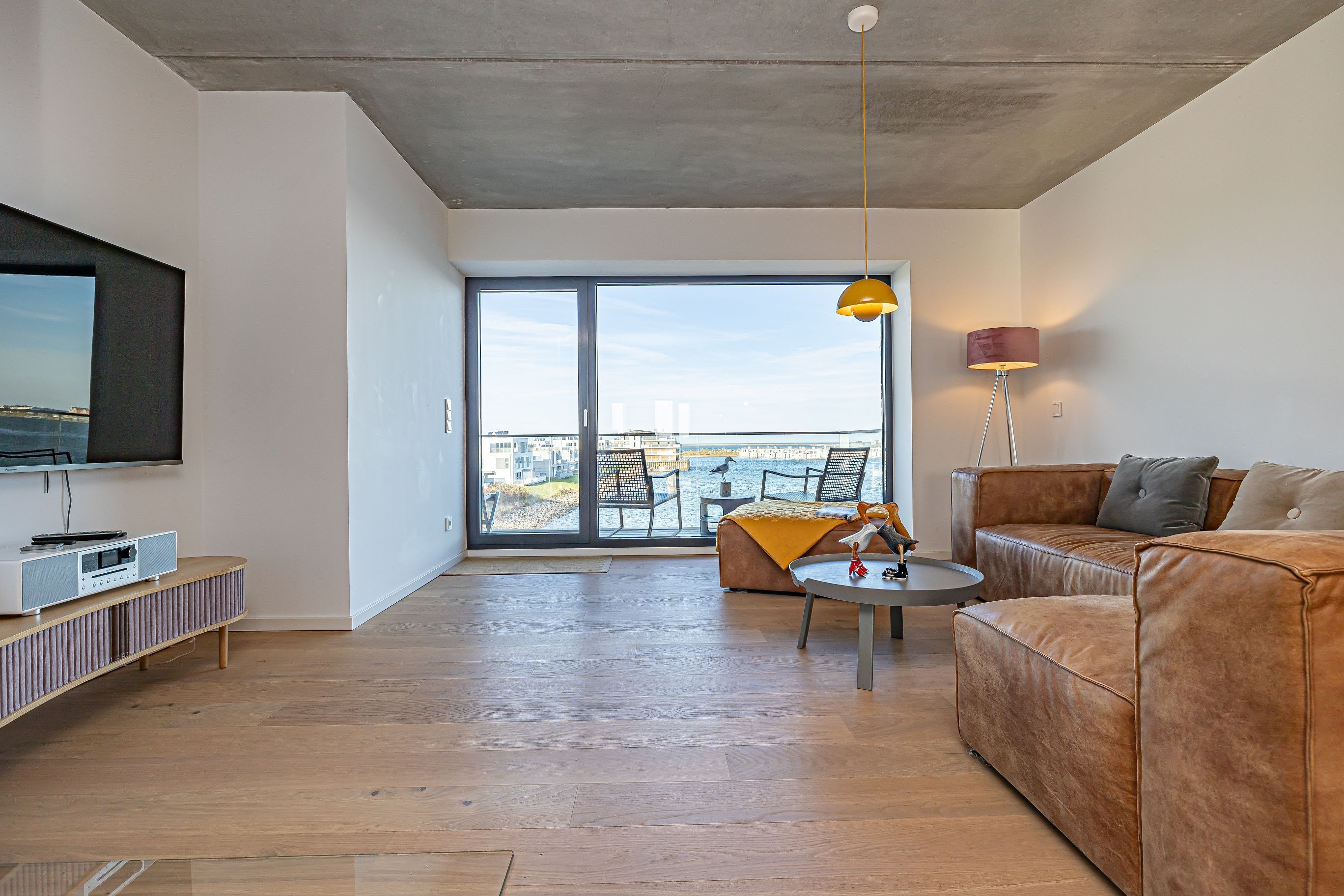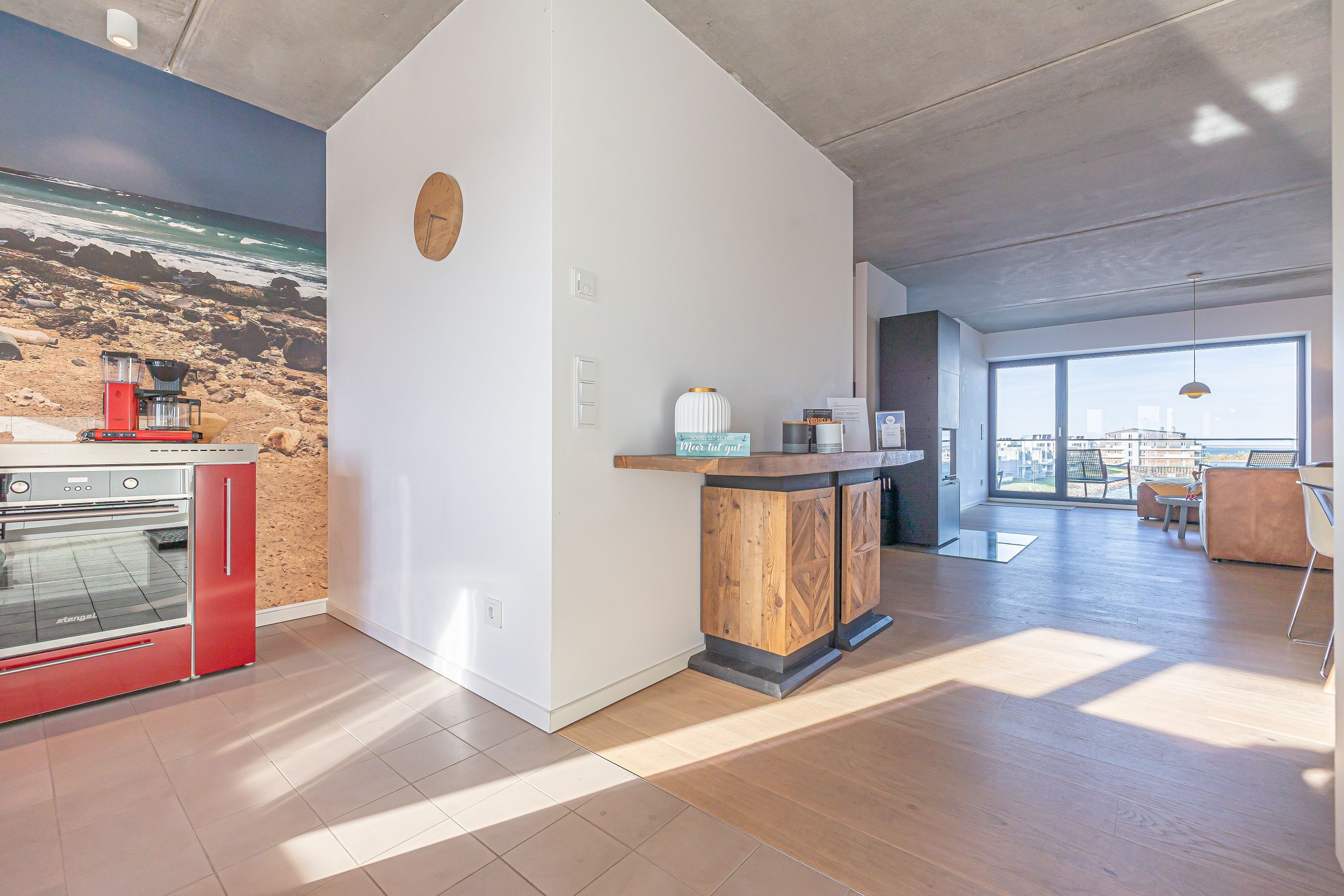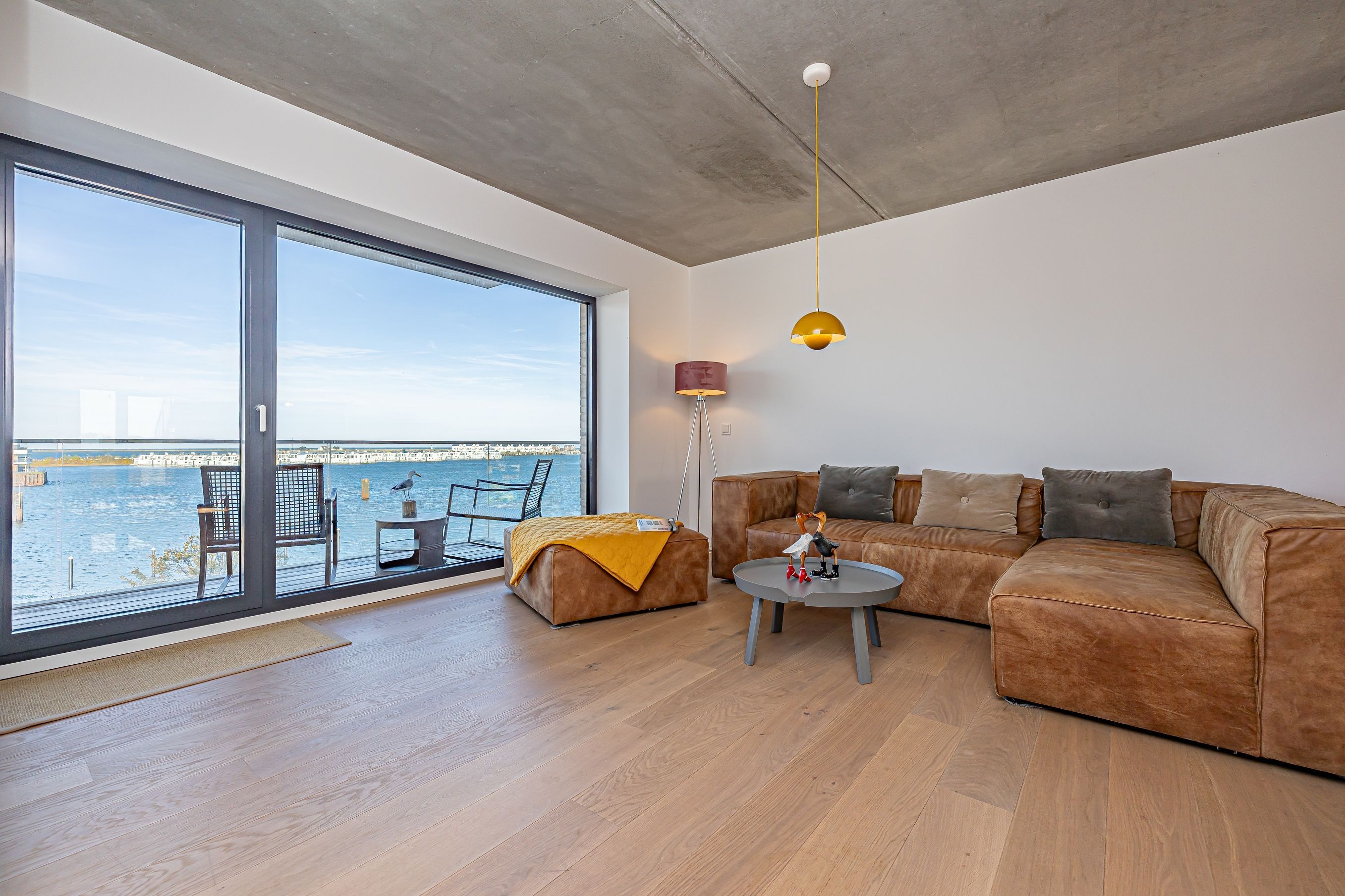 Die offene Designküche, komplett ausgestattet und mit einem inspirierenden Wandbild verziert, lädt zu genussvollen Kochabenden ein. Entspannen Sie im stilvollen Wohnbereich mit Kamin und lassen Sie sich von der traumhaften Aussicht auf den Hafen, die Schleimündung mit Leuchtturm und die Ostsee verzaubern.