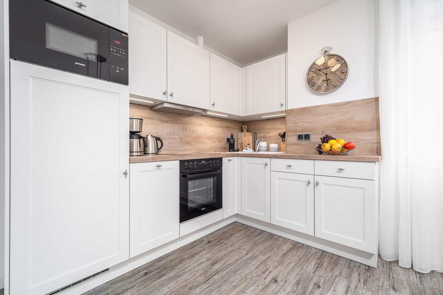 Die über Eck verbaute, gut ausgestattete Einbauküche mit Geschirrspüler, Elektroherd, Mikrowelle und weiteren technischen Geräten lädt zum Kochen mit der ganzen Familie ein.