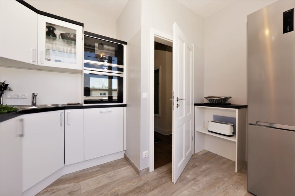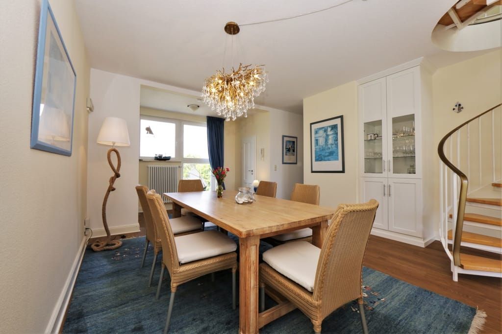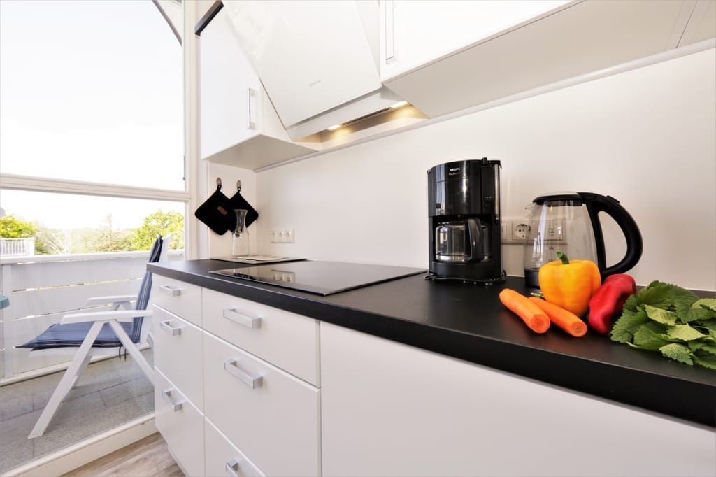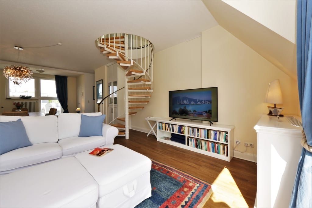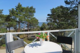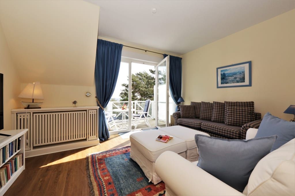 Ein Highlight dieser Wohnung sind die beiden Balkone. Der größere Balkon ist vom Wohnzimmer begehbar und bietet durch die Bäume auf der Düne hindurch einen Blick auf die Ostsee. Das großzügige Wohnzimmer verfügt über eine komfortable Sitzecke mit Flachbildfernseher sowie einen großen Esstisch. Die separate, vollausgestattete Küche ist mit Geschirrspüler, großem Kühlschrank mit Gefriermöglichkeit, Backofen, Mikrowelle und Waschmaschine (gg. Gebühr) ausgestattet. Von der Küche aus gelangt man auf den sonnigen Südbalkon zum Hof des Hauses.