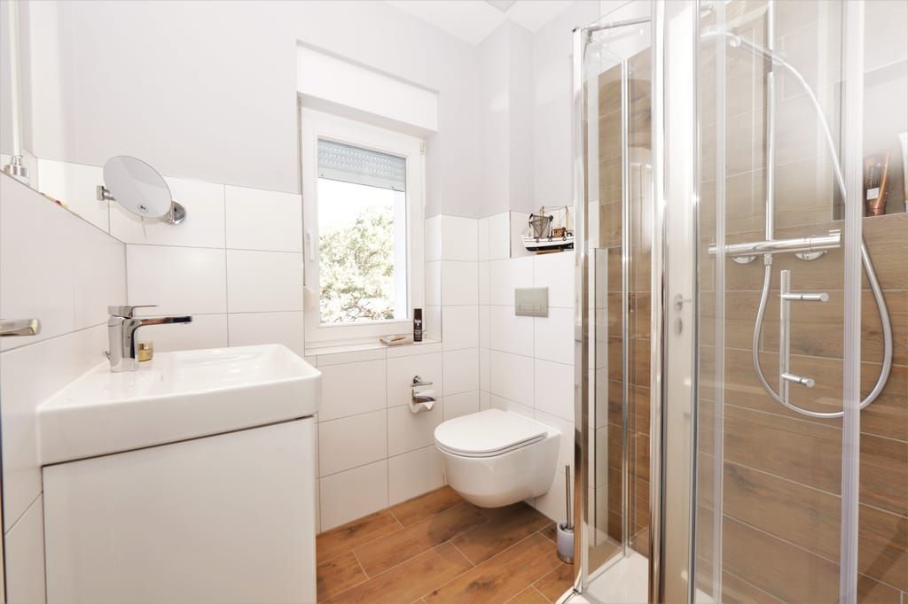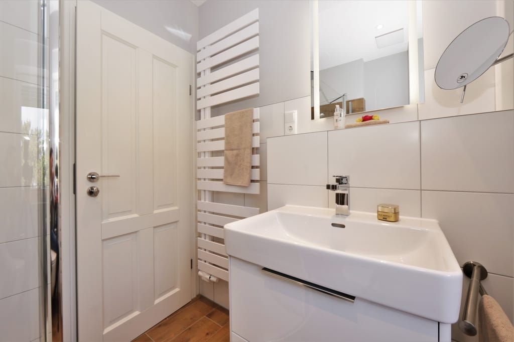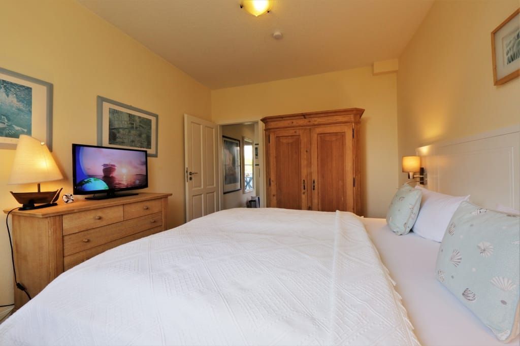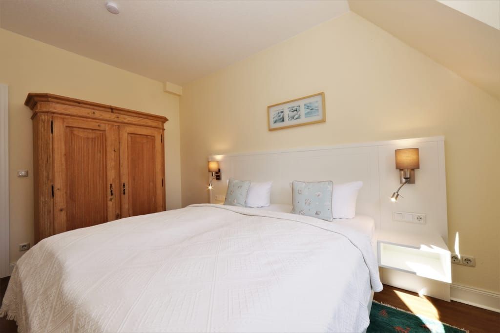 Das Schlafzimmer ist mit einem Doppelbett (180 x 200), Kleiderschrank und zweitem Fernseher ausgestattet. Als Aufbettungsmöglich steht die Couch im Wohnzimmer zur Verfügung (Liegefläche 140 x 195). Die abgebildete Treppe im Wohnzimmer führt zu privat genutzten Räumen und steht den Mietern der Ferienwohnung nicht zur Verfügung. Das Bad ist mit Dusche, Waschbecken und WC ausgestattet.