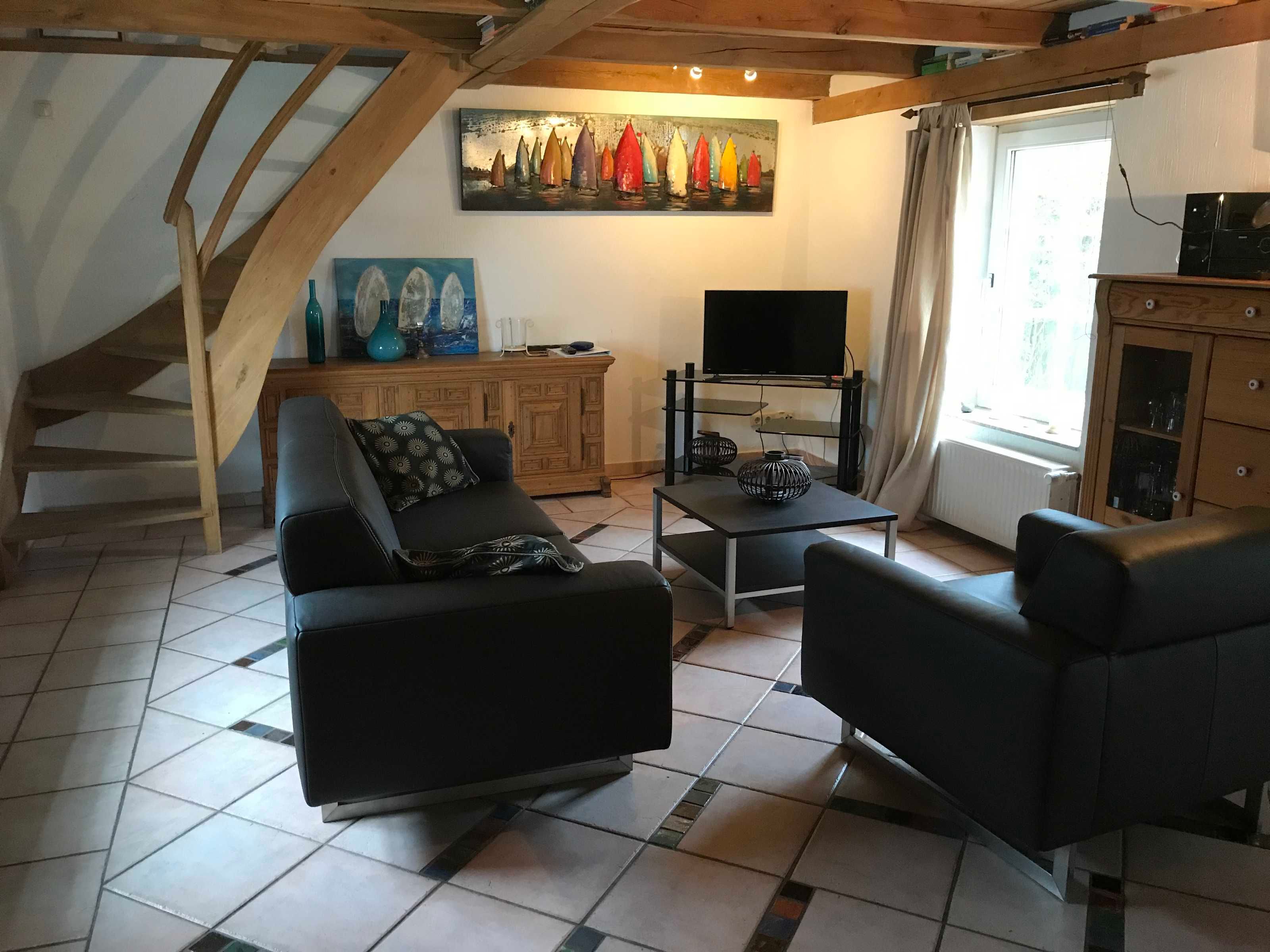 Das sehr geschmackvoll eingerichtete Ferienhaus Gabi 2 liegt im hinteren Teil des Grundstücks und bietet auf 75 m2 und zwei Etagen Schlafgelegenheiten für 3 Personen in zwei getrennten Schlafräumen sowie einen grossen Wohn- und Essbereich mit integrierter offener Küche. Das helle Bad mit Dusche und Waschmaschine befindet sich oben. Auch das Ferienhaus Gabi 2 bietet eine großzügige Terrasse und direkten Zugang zum grossen Garten.