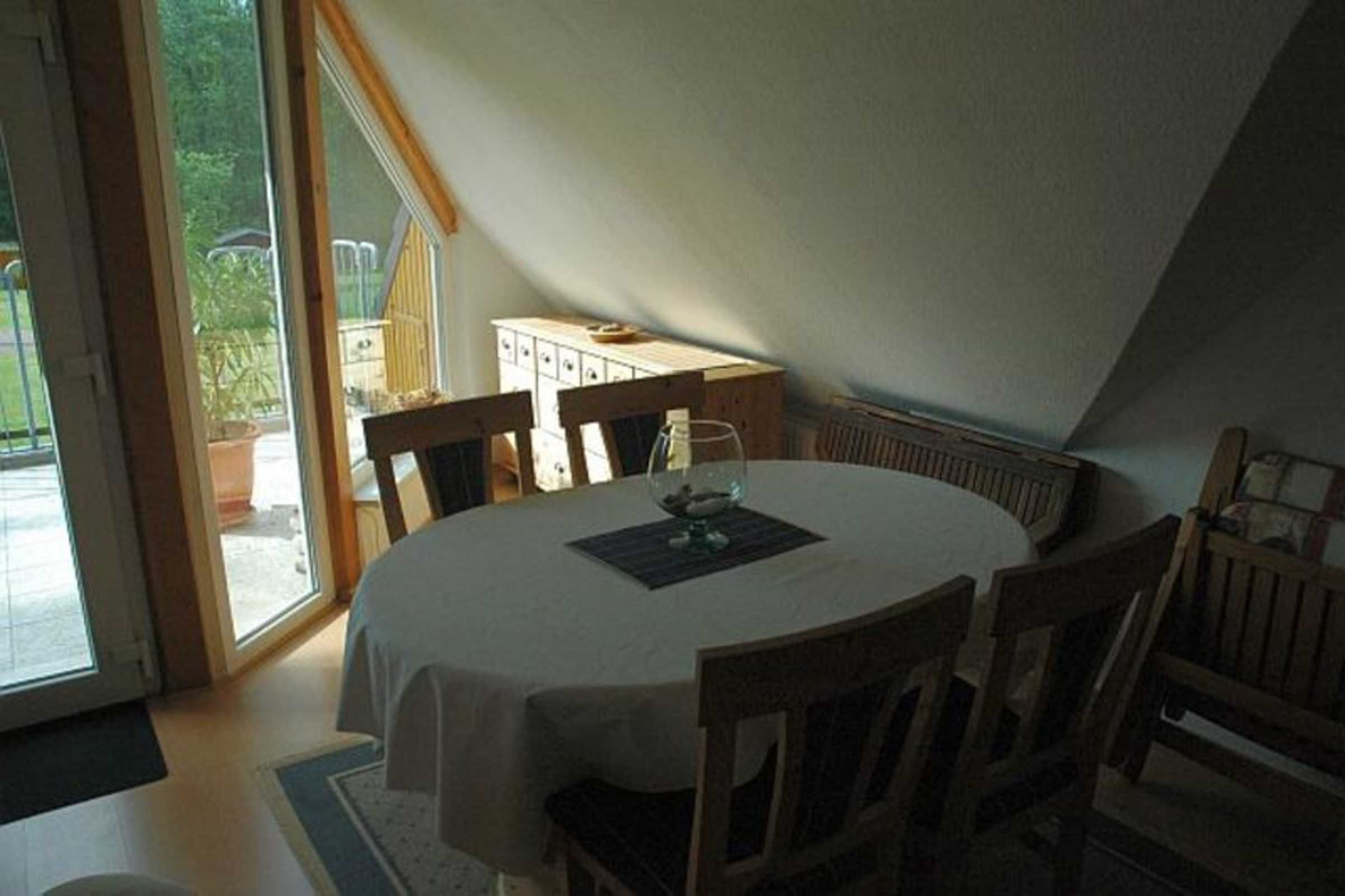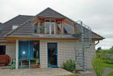 Die Ferienwohnung besitzt einen separaten Eingang über eine Wendeltreppe an der Rückseite des Hauses. Hier haben Sie sehr viel Ruhe und einen wunderschönen Blick auf die Landschaft. Sie ist ausgestattet mit einem großen Wohnzimmer mit gemütlicher Eckcouch, Radio und TV-Satellitenanlage, sowie einem Esstisch. An den Wohnbereich schließt sich eine komfortabel ausgestattete Küche mit Kühl-und Gefrierkombination, Microwelle, E-Herd und Geschirrspüler an. Bad mit Dusche und WC. Das Schlafzimmer hat ein Doppelbett und eine Kinderaufbettung ist auf einer Klappmatratze möglich. Zur Ferienwohnung gehört eine großzügige Sonnenterasse mit Blick auf den Garten.
