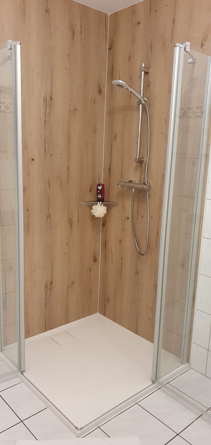 Das Badezimmer hat eine moderne Dusche in Komfortgröße und WC.