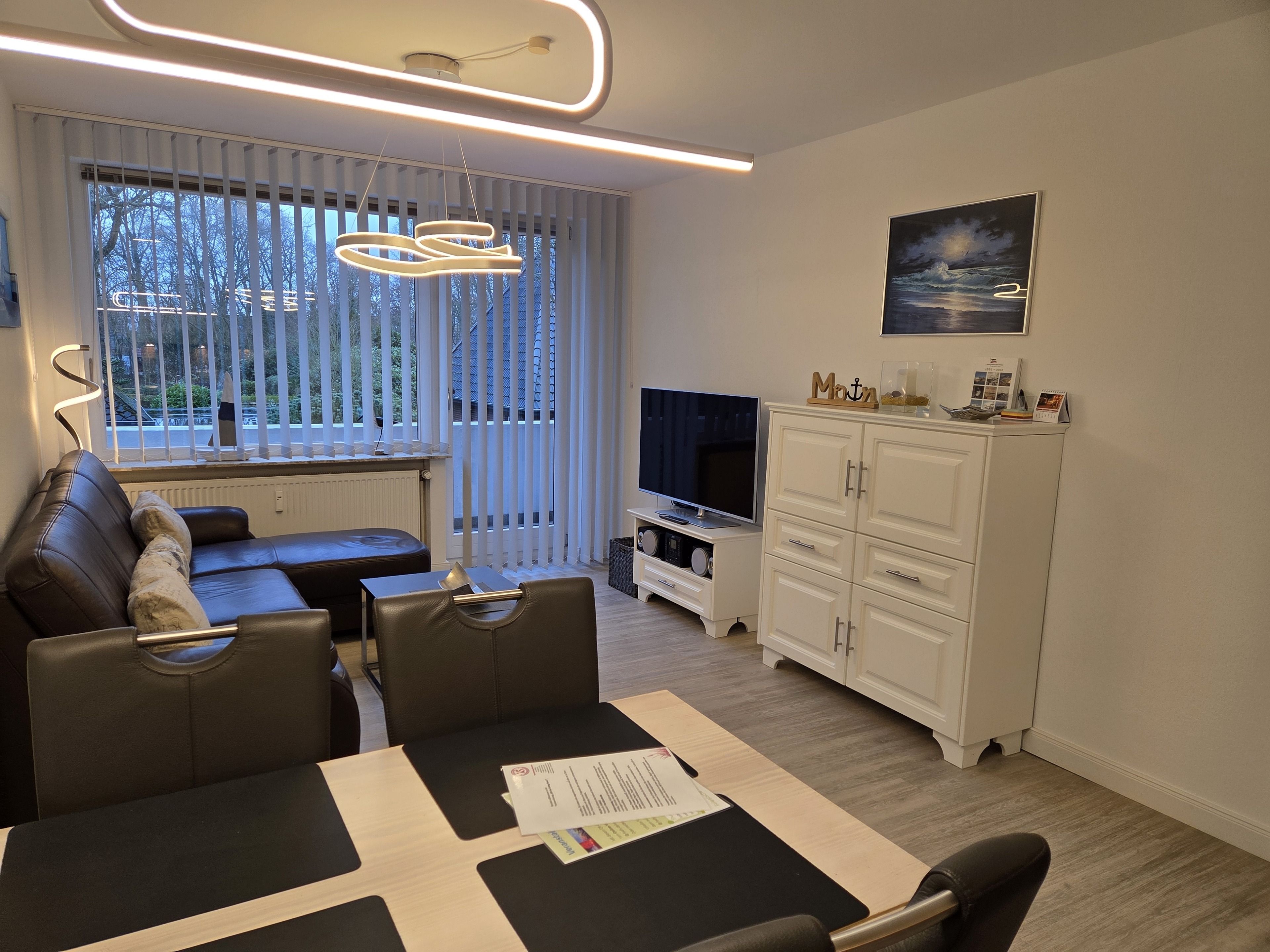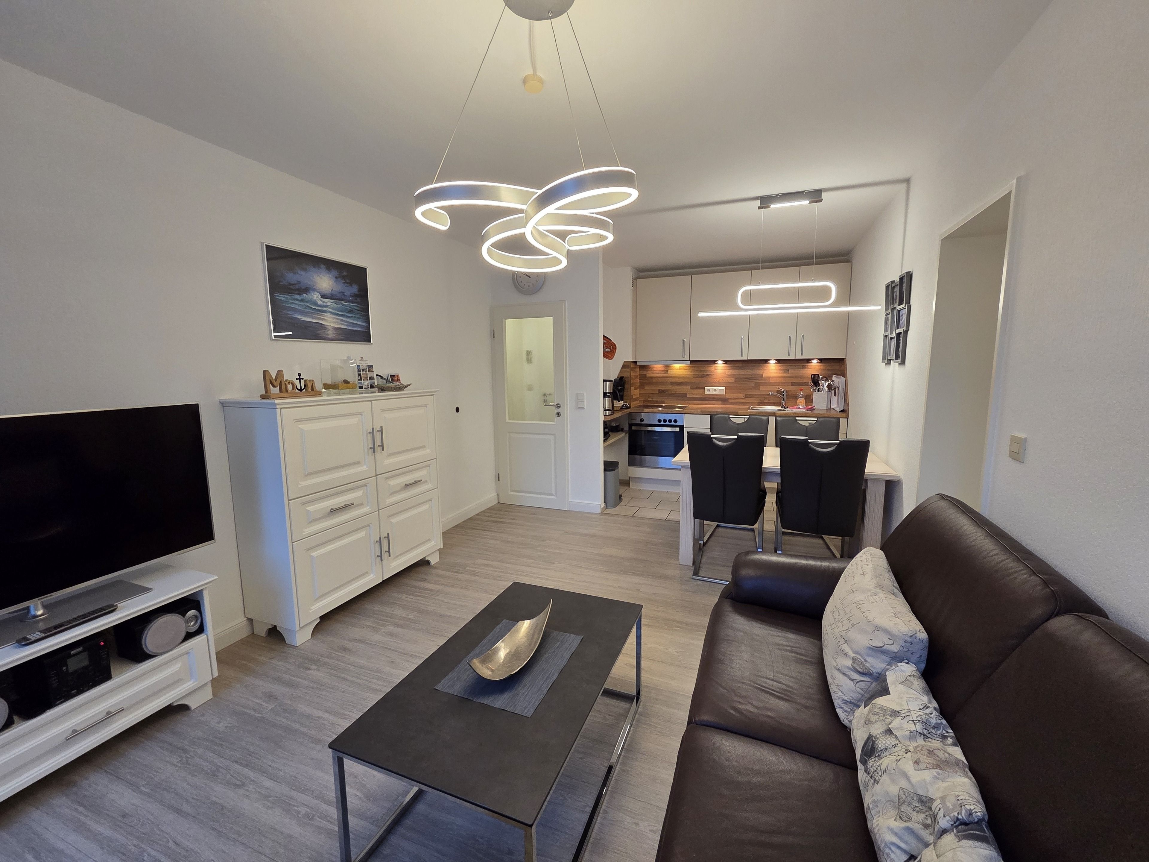 Der großzügige Wohn- und Essbereich mit gut ausgestatteter Einbauküche bildet das Herzstück der Wohnung. Von hier aus gelangen Sie direkt auf den sonnigen Südbalkon, der sich ideal für entspannte Stunden nach einem Strandtag eignet.