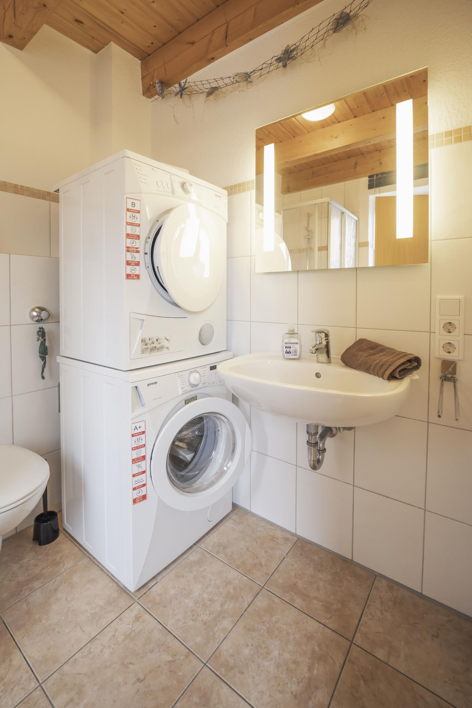 Bad mit Fenster im EG mit Dusche, Waschmaschine und Wäschetrockner.