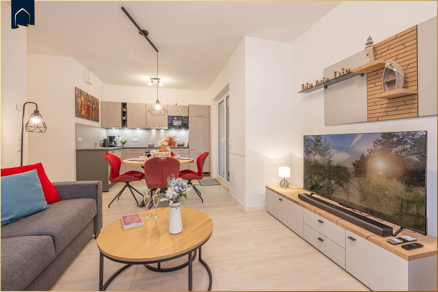 Diese stilvolle Ferienwohnung auf 75 m² bietet alles, was das Urlaubsherz begehrt. Ideal geeignet für Familien oder kleine Reisegruppen finden hier bis zu vier Personen bequem Platz. Zwei separate Schlafzimmer und zwei moderne Badezimmer sorgen für maximalen Komfort – vor allem, wenn man mit Kindern oder Freunden reist. Der lichtdurchflutete Wohnbereich mit gemütlicher Sofaecke, großem Esstisch und offener Küche lädt zum Entspannen ein. Besonderes Highlight: die moderne Heimkinoanlage sowie ein überdachter Balkon, der zu jeder Jahreszeit genutzt werden kann.