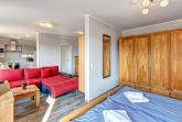Der offen gestaltete Raum vereint Wohn-, Schlaf- und Küchenbereich auf harmonische Weise. Zwei gemütliche Sessel laden zum Verweilen ein, während das Doppelbett im Schlafbereich erholsame Nächte verspricht. Von hier aus gelangen Sie direkt auf den eigenen Balkon, der sich ideal für eine Kaffeepause an der frischen Luft eignet. Die angrenzende offene Küche ist voll ausgestattet und verfügt über einen Essplatz für zwei Personen.