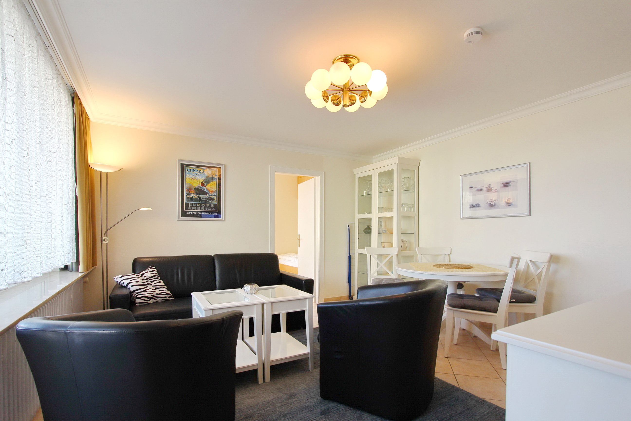 Gemütliche 2 Zimmer-Wohnung in der 2. Etage im Haus Atlantik mit vorgelagertem Nordbalkon mit Balkonmöbeln. Das hell und freundlich eingerichtete Wohnzimmer verfügt über eine Schlafcouch (140 x 200 cm), 2 Sessel und einem Essplatz mit 4 Stühlen. Die angrenzende moderne Küche ist mit Geschirrspüler, Mikrowelle und 2-Platten-Cerankochfeld ausgestattet. Im separaten Schlafzimmer befinden sich 2 Einzelbetten (100 x 200 cm und 90 x 190 cm). Das freundliche Duschbad/WC ist mit Handtuchtrockner ausgestattet. Zur technischen Ausstattung gehört weiterhin ein Flachbild-TV, ein DVD-Player und ein Radio mit CD-Player. Zur Wohnung gehört ein Außenstellplatz, welcher sich ca. 50 m vom Objekt entfernt, Steinmannstraße/Ecke Bürgermeister-Kapp-Weg, befindet - es handelt sich um den Stellplatz Nr. 10. Diese Nichtraucherwohnung hat eine Größe von ca. 34 m².