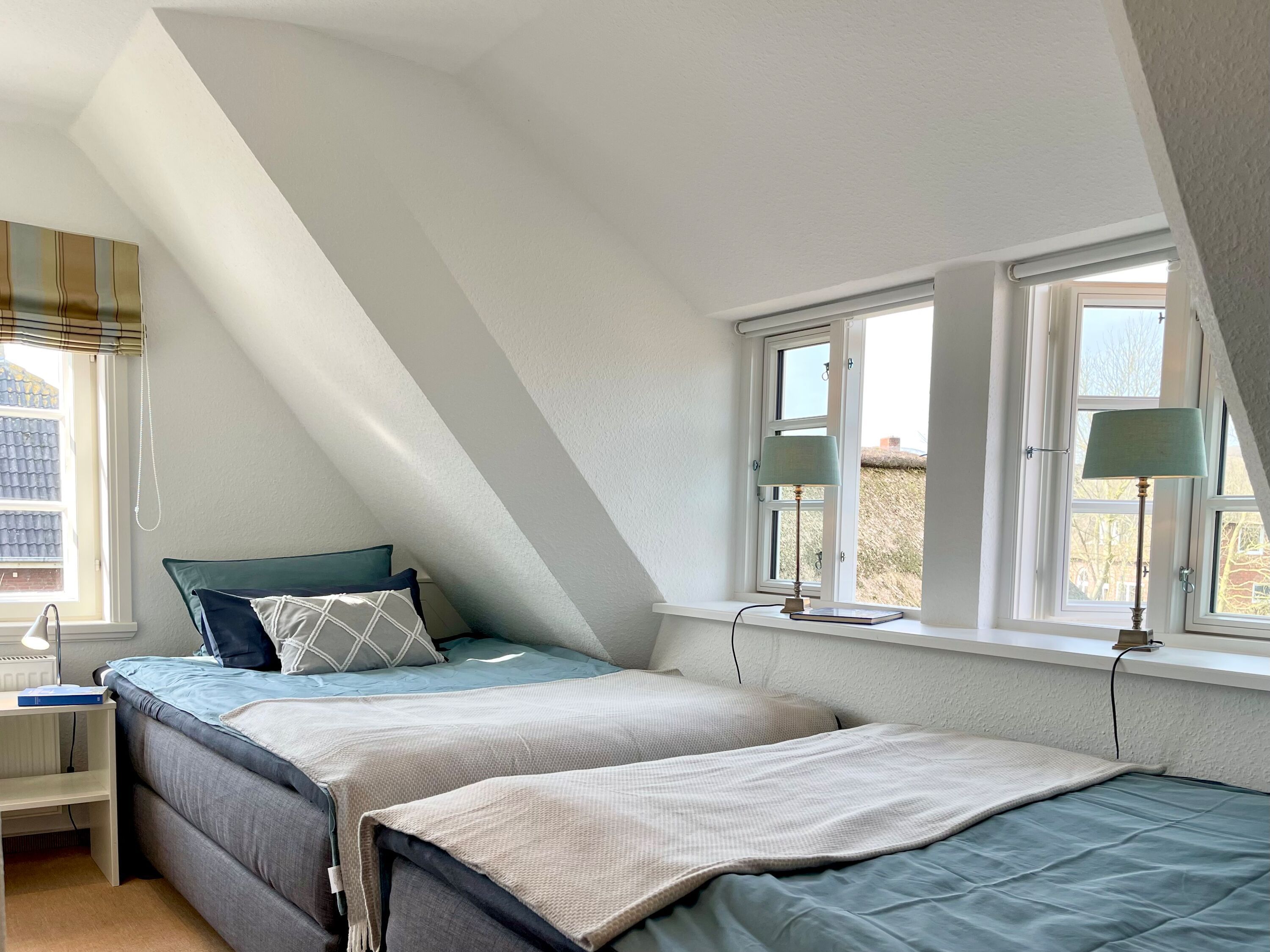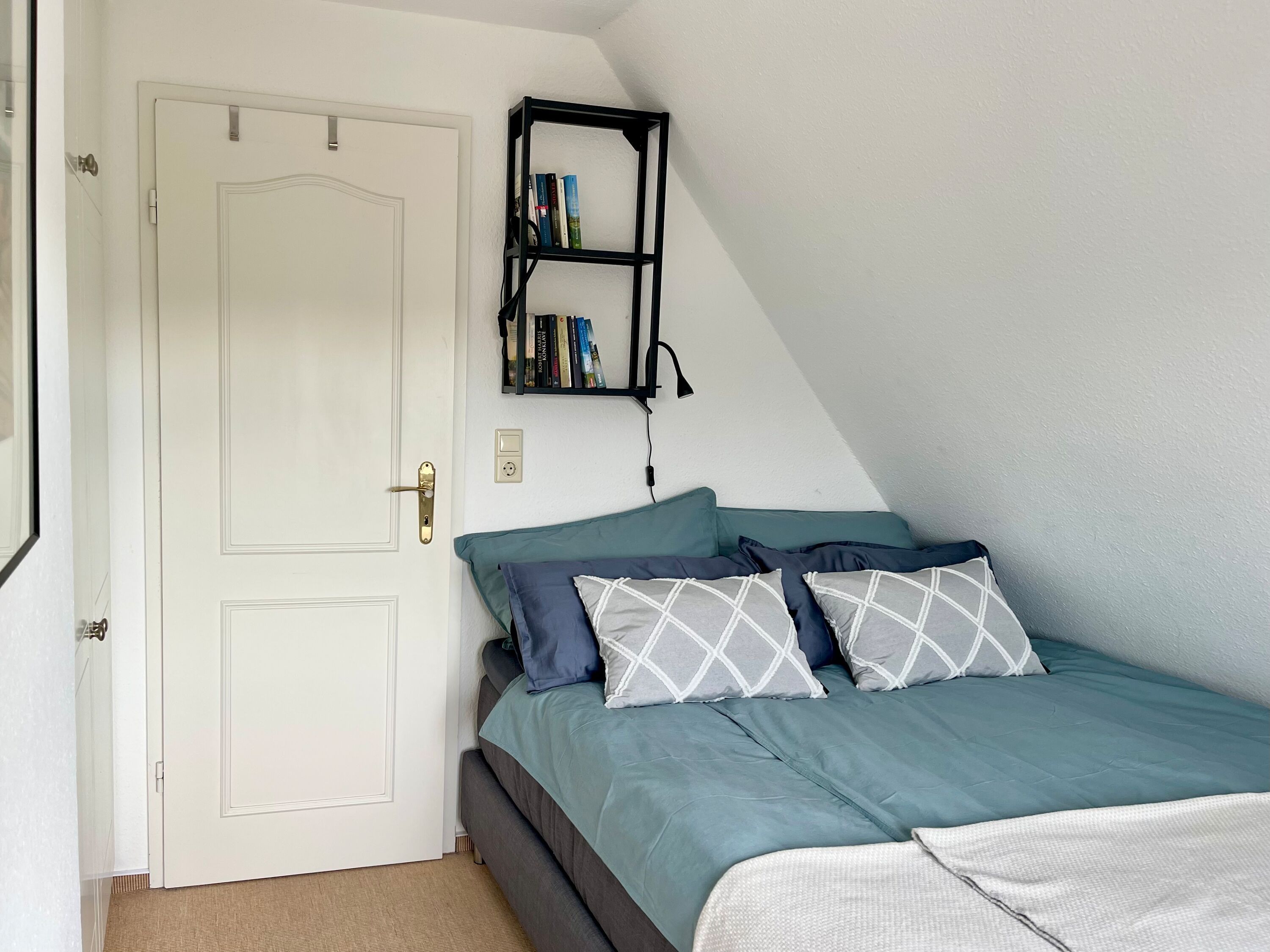 Im Obergeschoss: 1 Schlafzimmer mit Doppelbett , 1 Schlafzimmer mit 2 breiten Einzelbetten, Duschbad/WC.