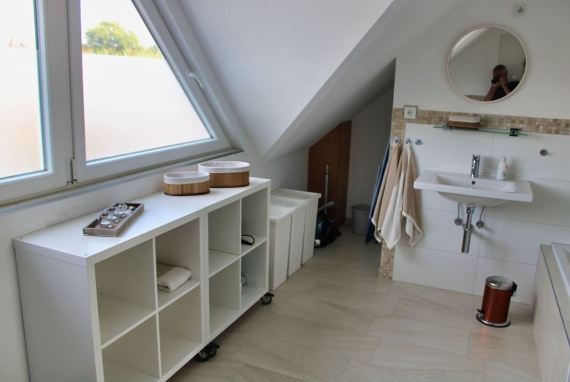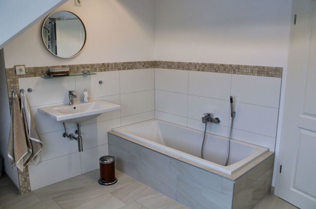 Im modernen Bad spülen Dusche (ebenerdig) und Badewanne Sand und Salz von der Haut.