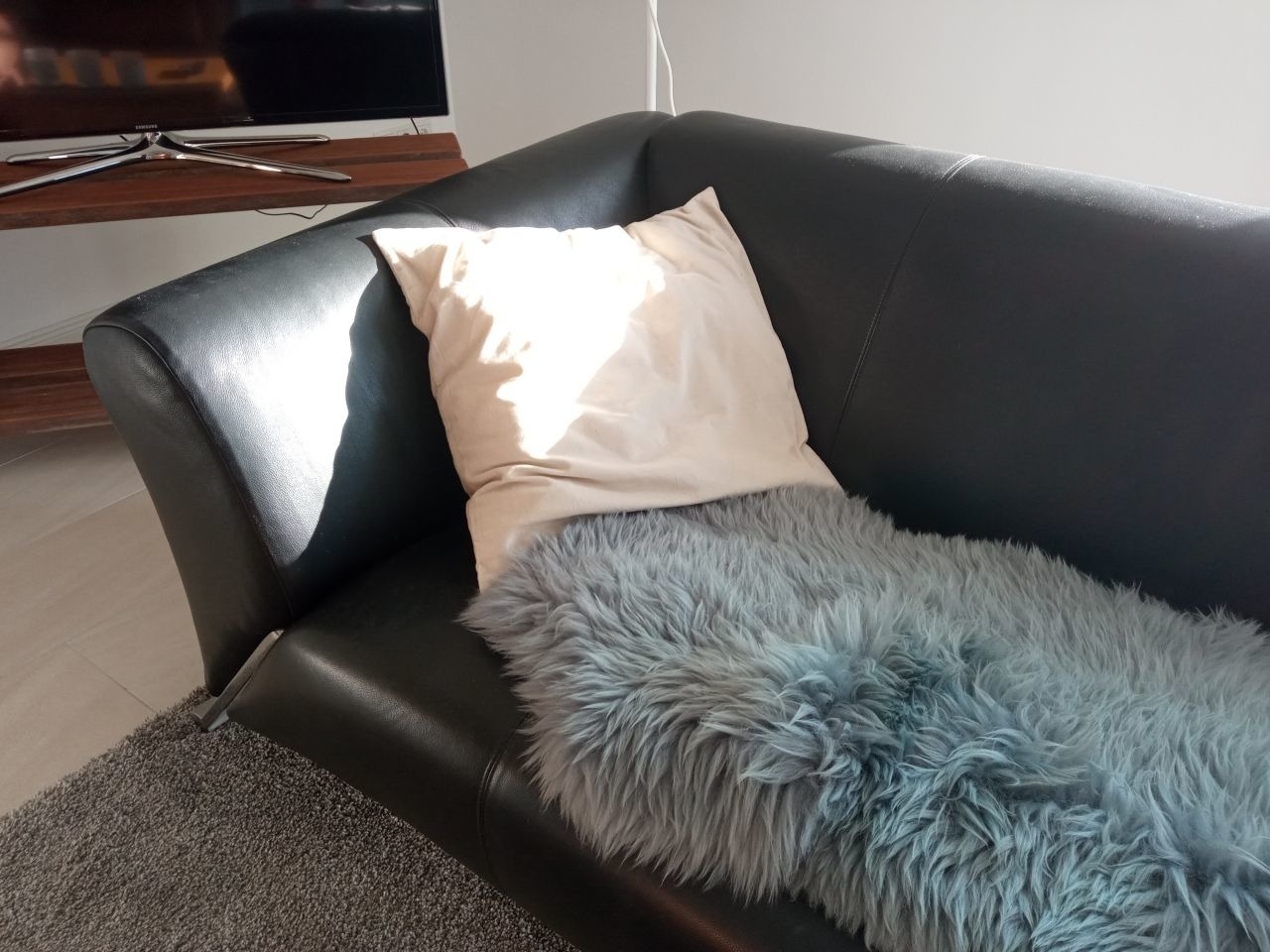 Bodentiefe Fenster und der verglaste Süd-Balkon lassen viel Licht hinein. Die Fußbodenheizung sorgt für Behaglichkeit. Ledersofa (Rolf Benz) und -sessel laden zum Entspannen ein.