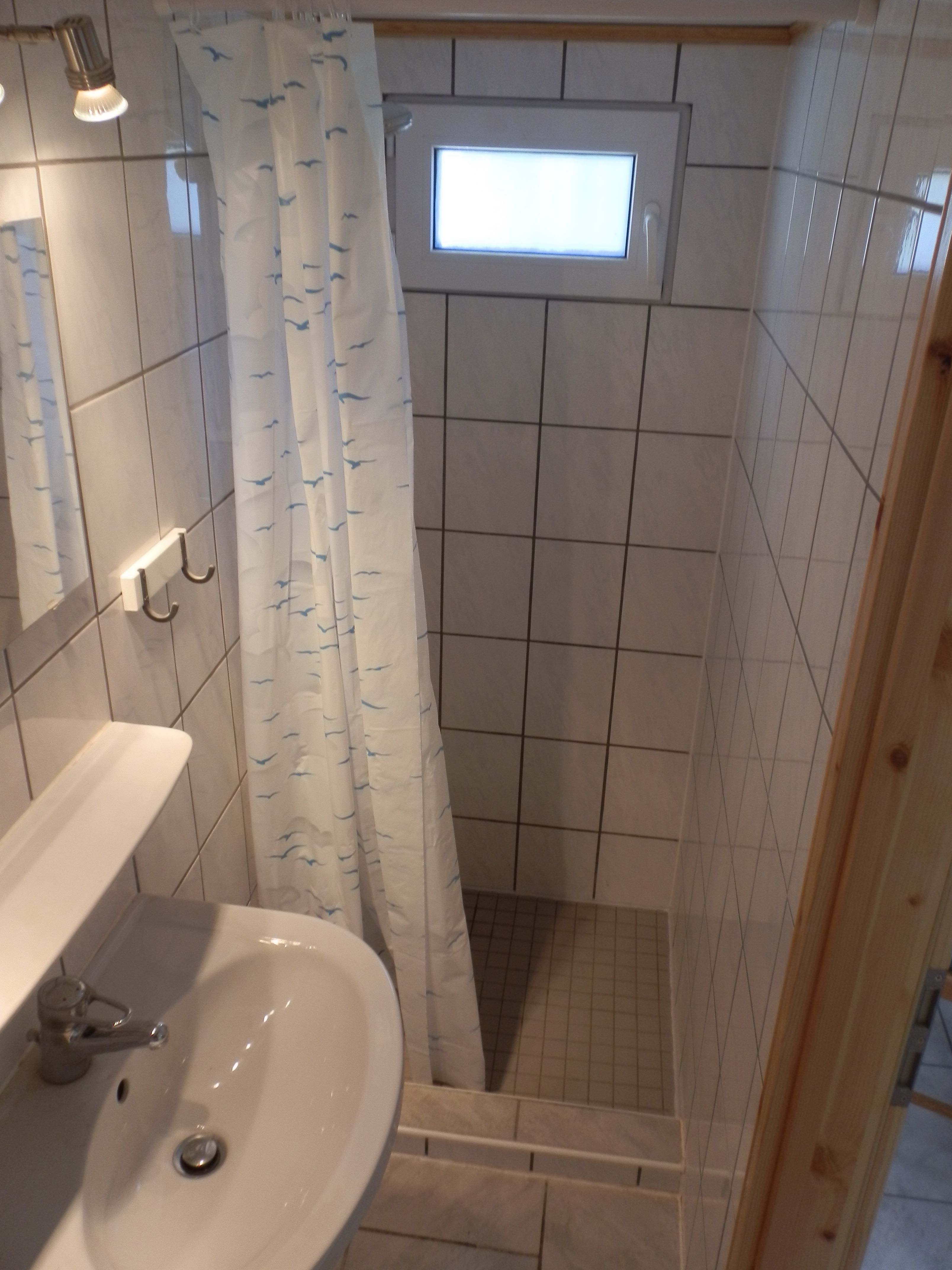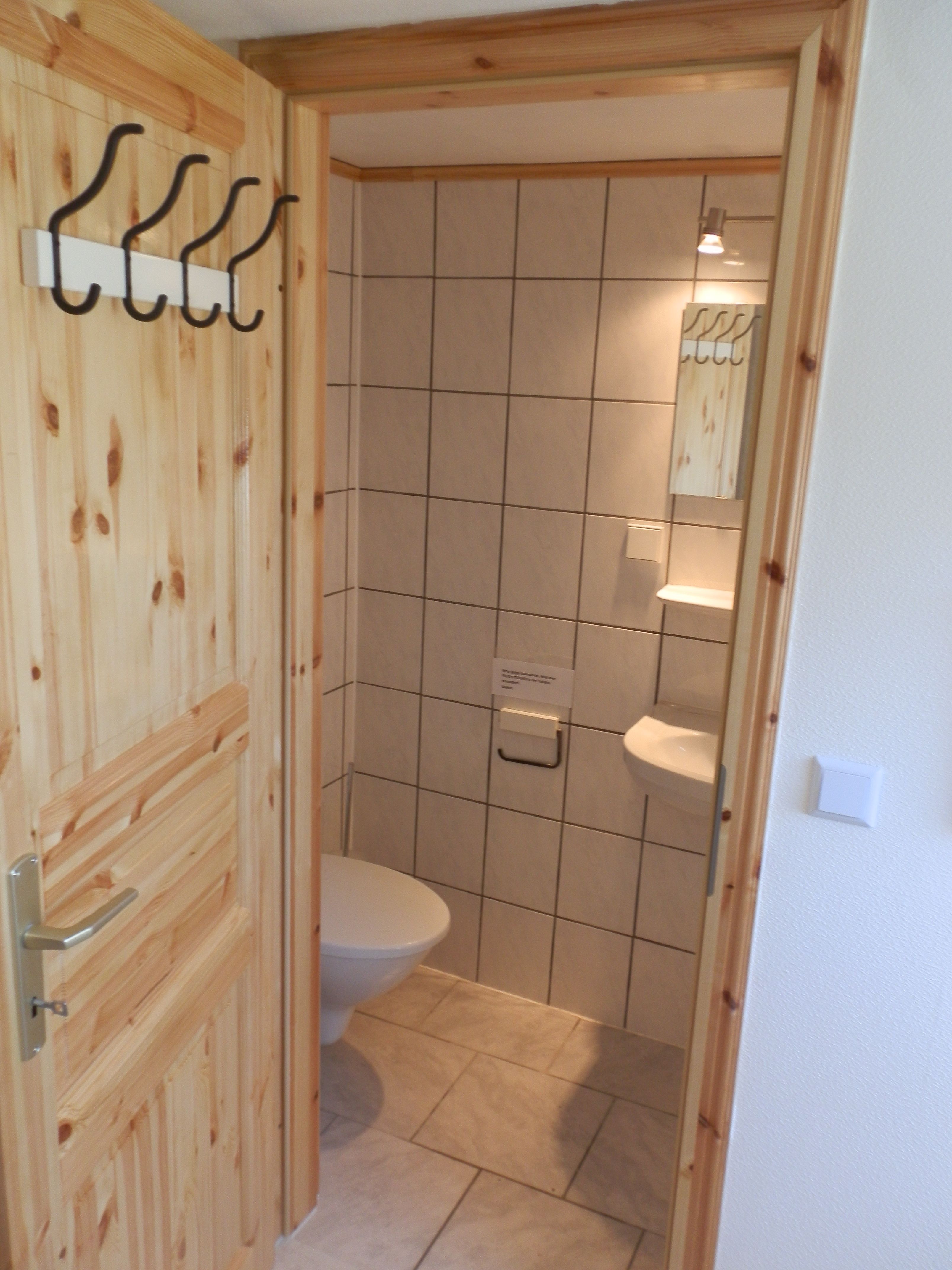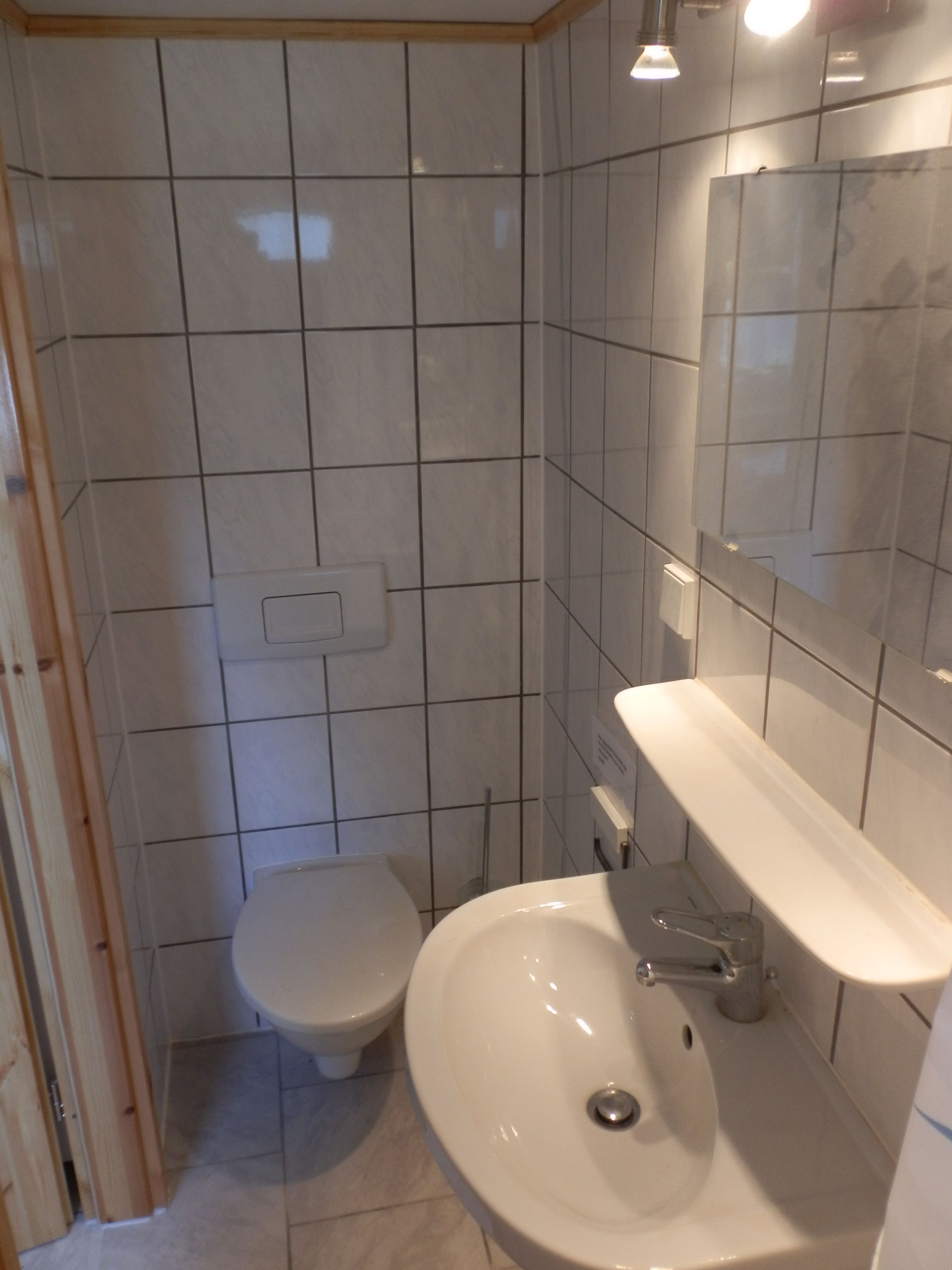 Das kleine Bad ist mit Dusche und WC ausgestattet. Handseife und eine Rolle Toilettenpapier stehen als Erstausstattung zur Verfügung. Föhn und Bügeleisen sind auf Nachfrage erhältlich.