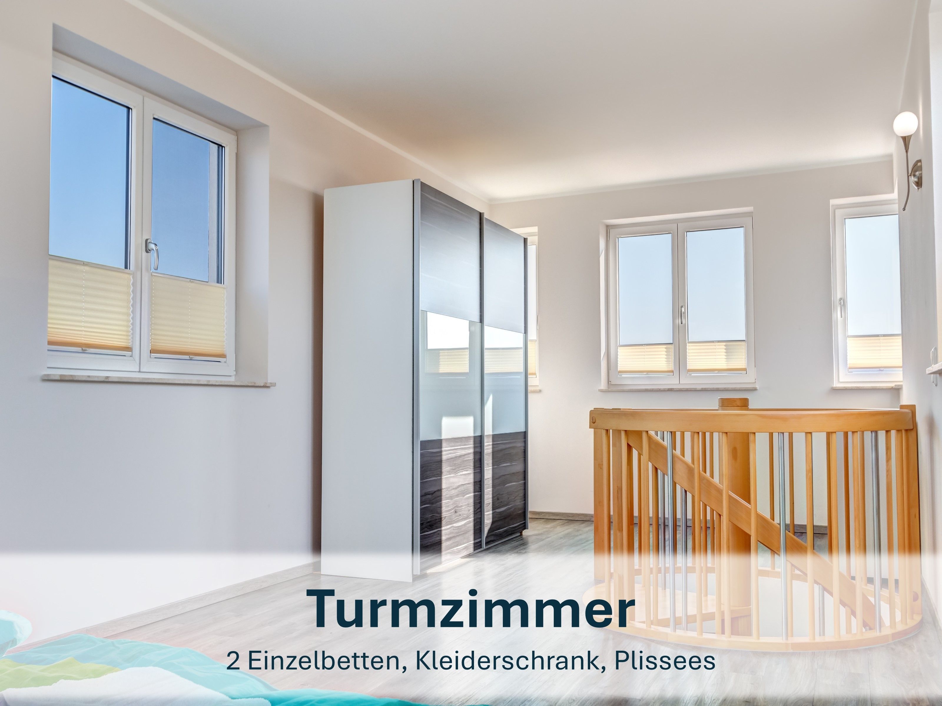 Im Obergeschoss befinden sich zwei Schlafzimmer: eines mit zwei zusammenschiebbaren Einzelbetten, das zweite im charmanten Turmzimmer ist über eine Wendeltreppe erreichbar und ebenfalls mit zwei Einzelbetten ausgestattet. Beide Zimmer verfügen über Kleiderschränke.