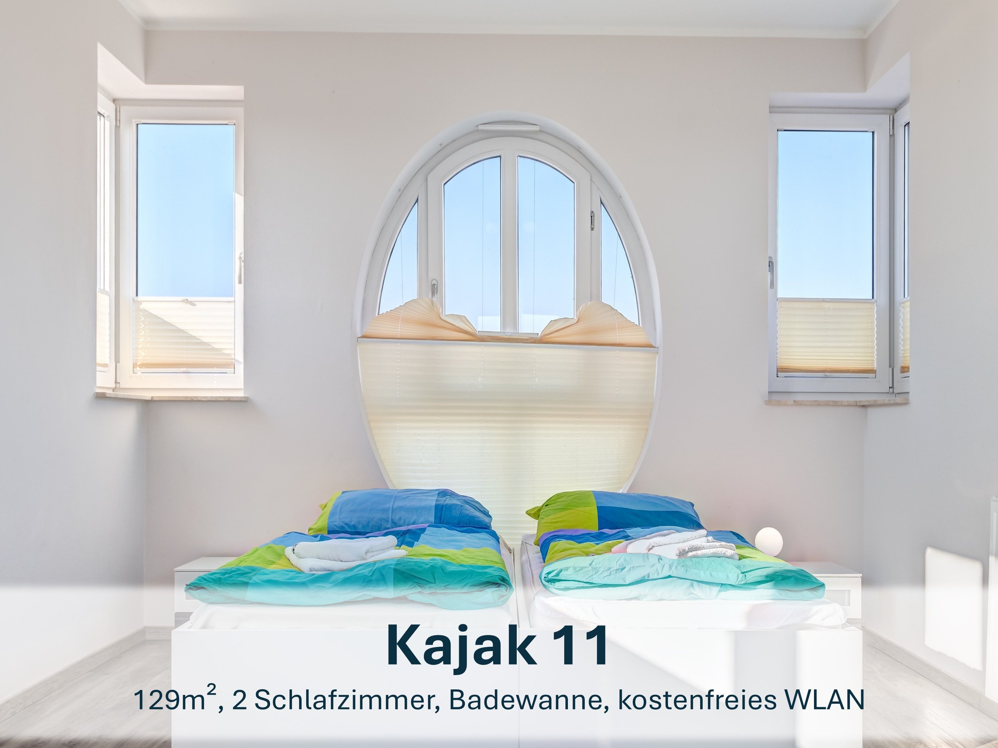 Willkommen in der stilvollen Maisonettewohnung „Kajak 11“ Ihrer großzügigen Ferienunterkunft über drei Etagen! Auf 129m² bietet die Wohnung Platz für bis zu 5 Erwachsene und ein Kleinkind bis 3 Jahre ideal für Familien oder Freunde.