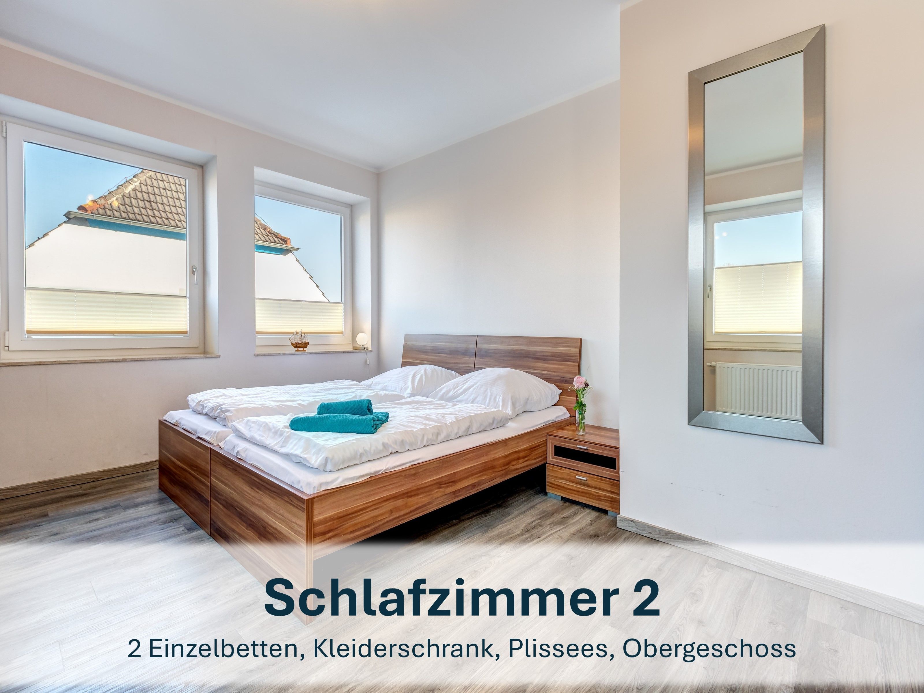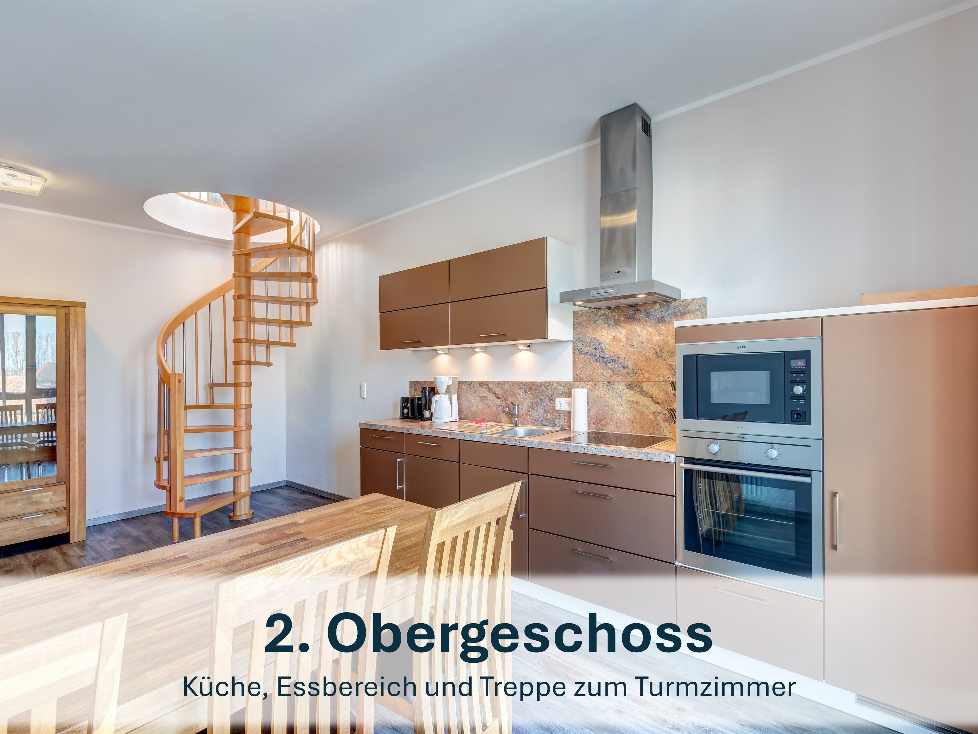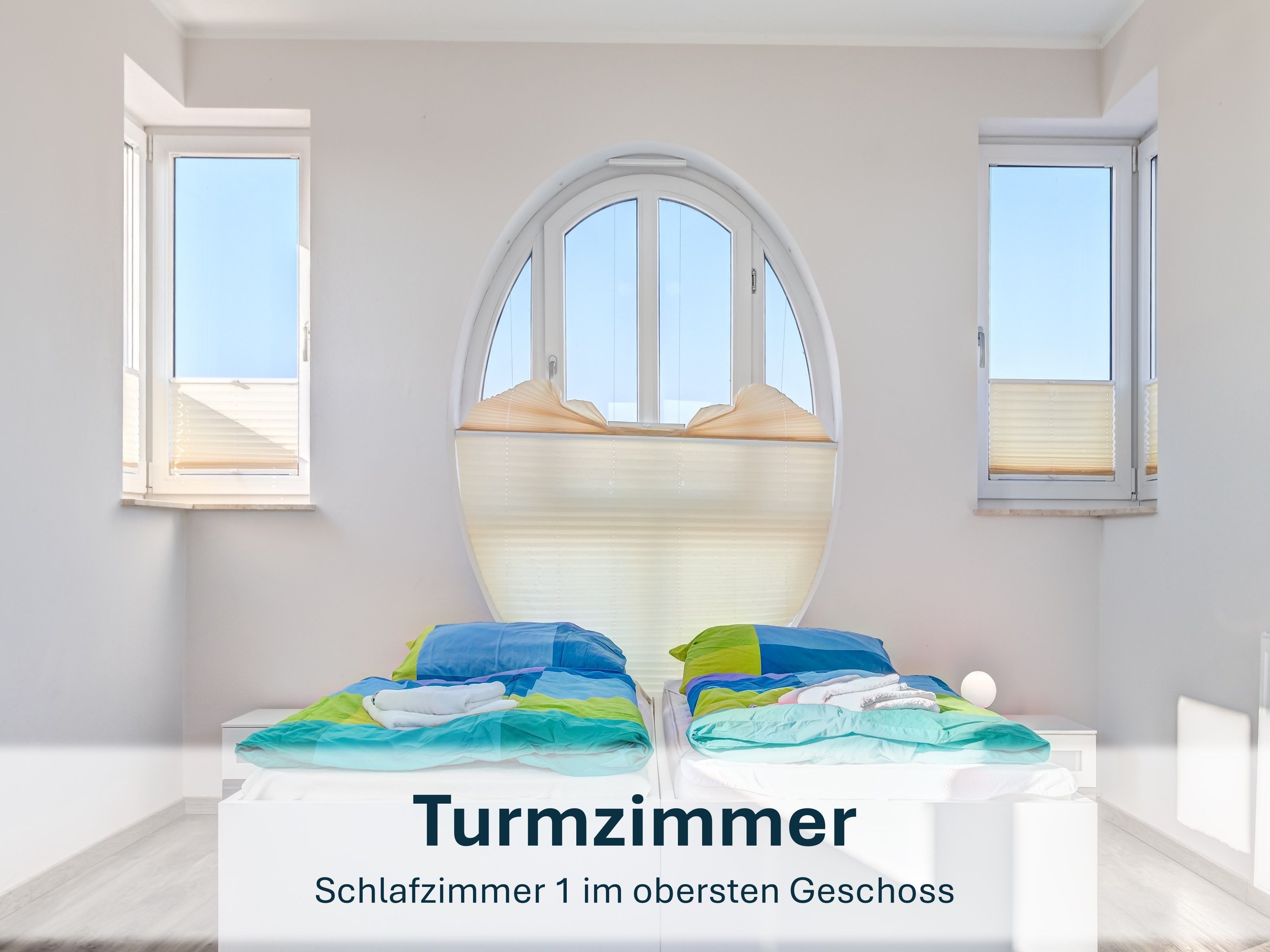 Im Obergeschoss befindet sich ein Schlafzimmer mit zwei Einzelbetten, die zusammengeschoben werden können. Über eine Wendeltreppe erreichen Sie das zweite Schlafzimmer im Turmzimmer ebenfalls mit zwei Einzelbetten. Beide Zimmer verfügen über Kleiderschränke.