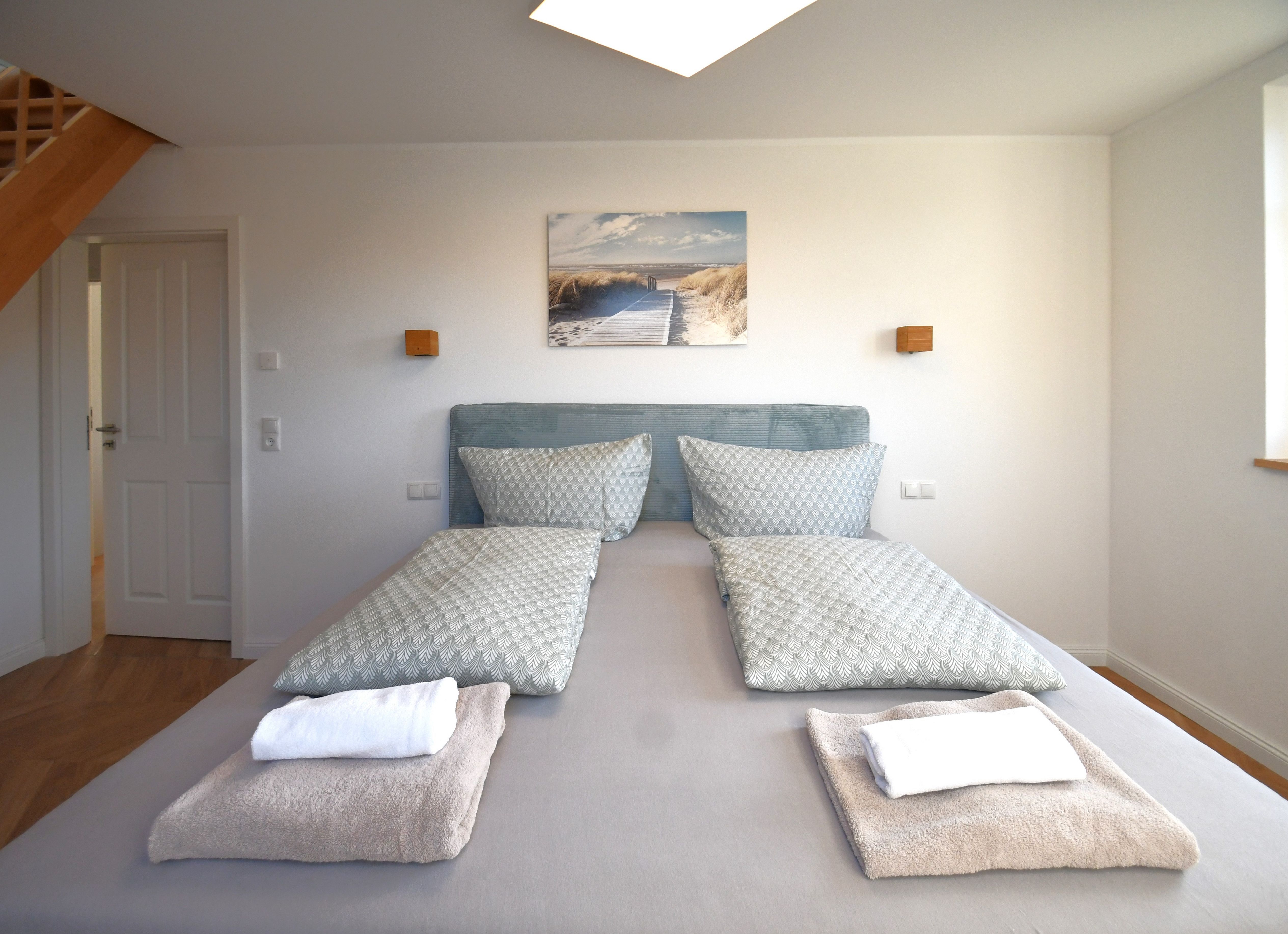 In dieses großzügig geschnittene Ferienhaus befinden sich die 3 Schlafzimmer mit Boxspringbetten sowie das Badezimmer mit grosser Dusche / Badewanne und Doppelwaschbecken im Obergeschoss.