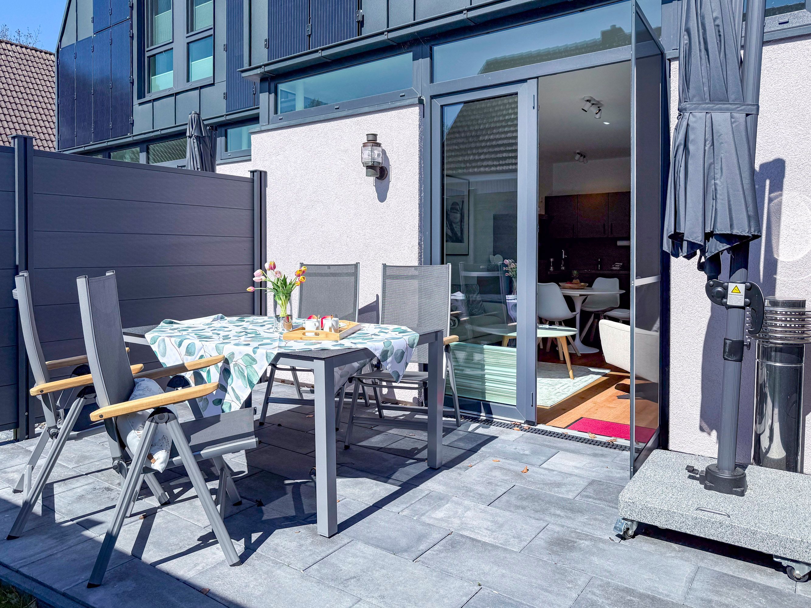 • Private Terrasse mit Gartenmöbeln und Sonnenschirm perfekt für entspannte Stunden im Freien
