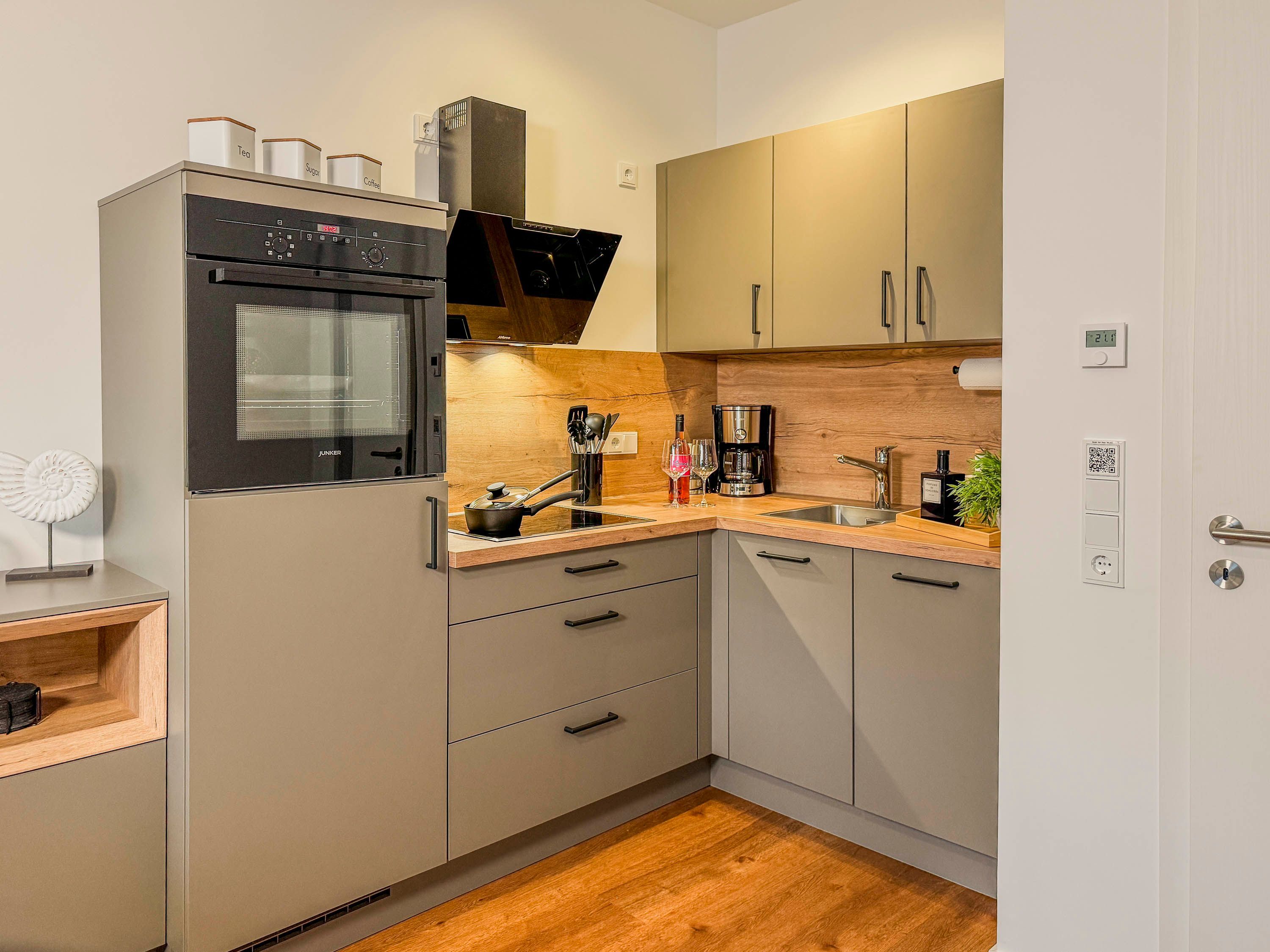 • Voll ausgestattete Küchenzeile mit Geschirrspüler, Backofen, Kochfeld, Kühlschrank, Filterkaffeemaschine, Kapsel-Kaffeemaschine, Toaster und Wasserkocher