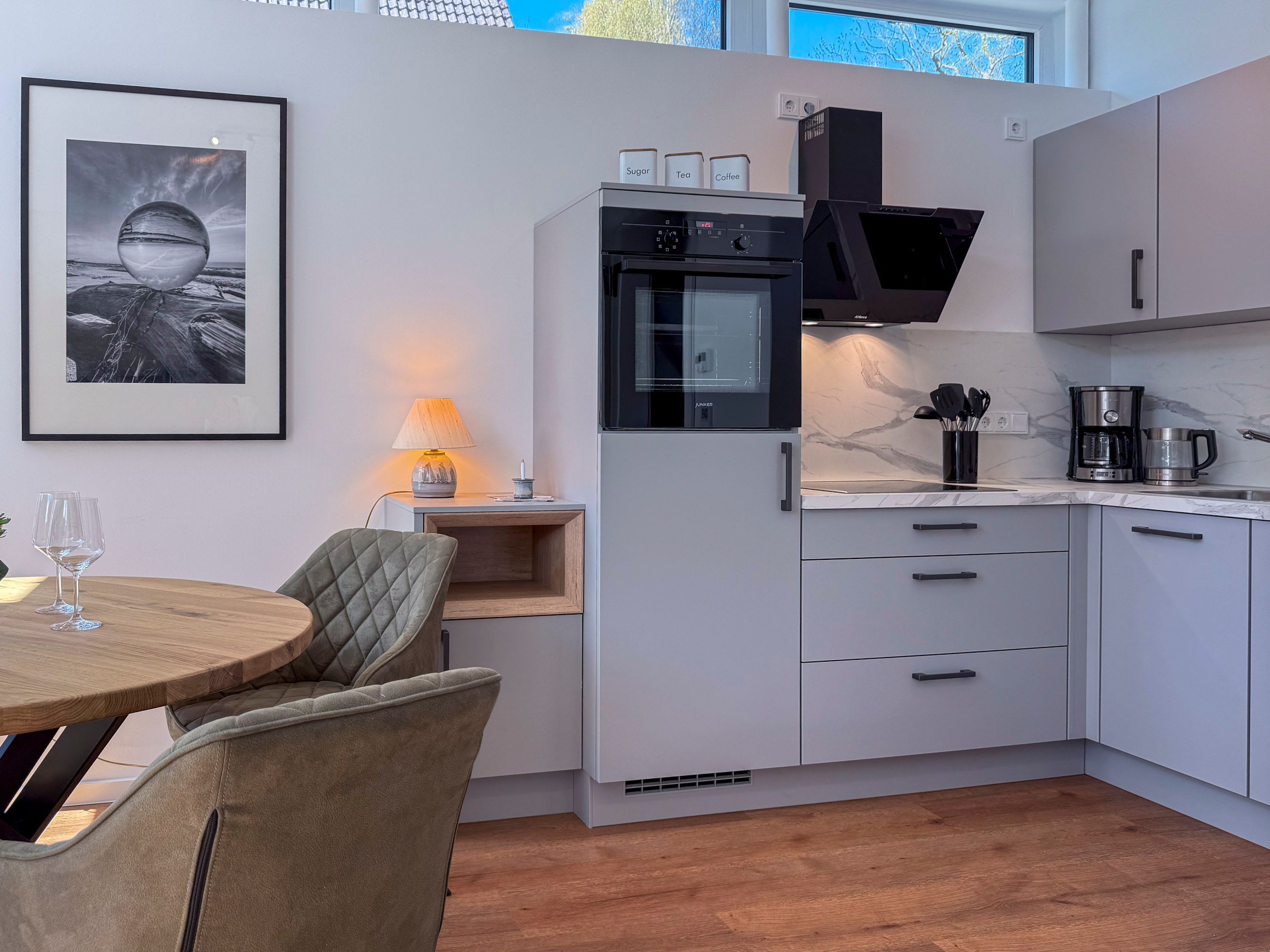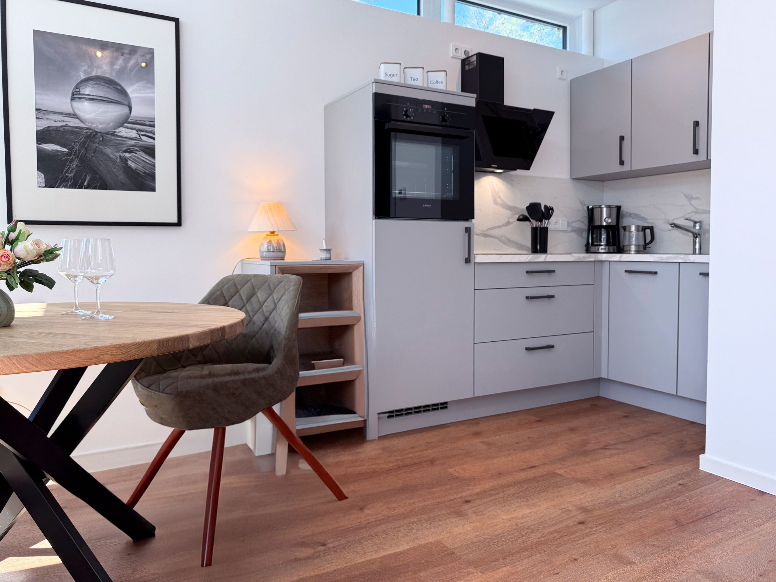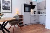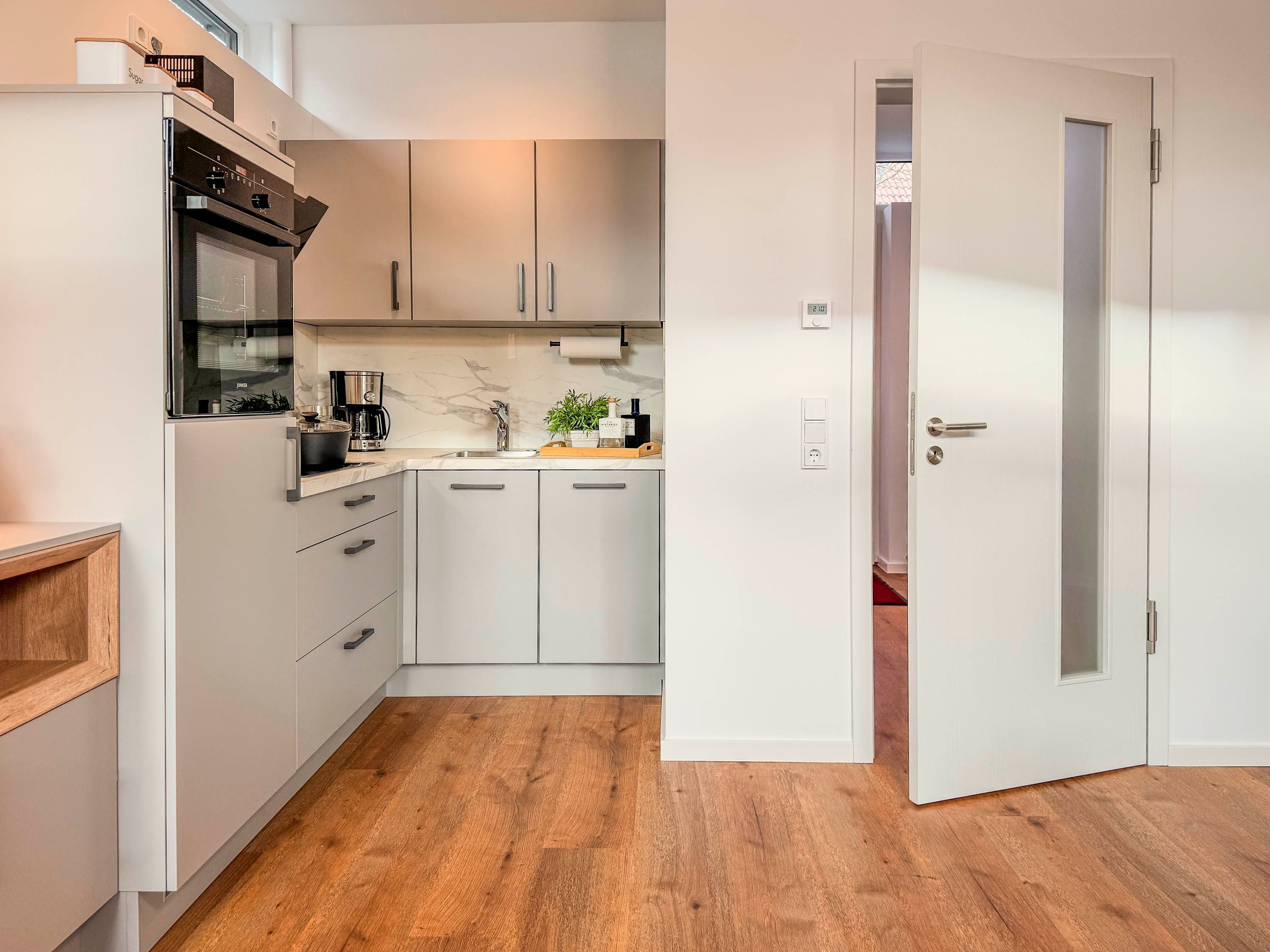 • Voll ausgestattete Küchenzeile mit Geschirrspüler, Backofen, Kochfeld, Kühlschrank, Filterkaffeemaschine, Toaster und Wasserkocher