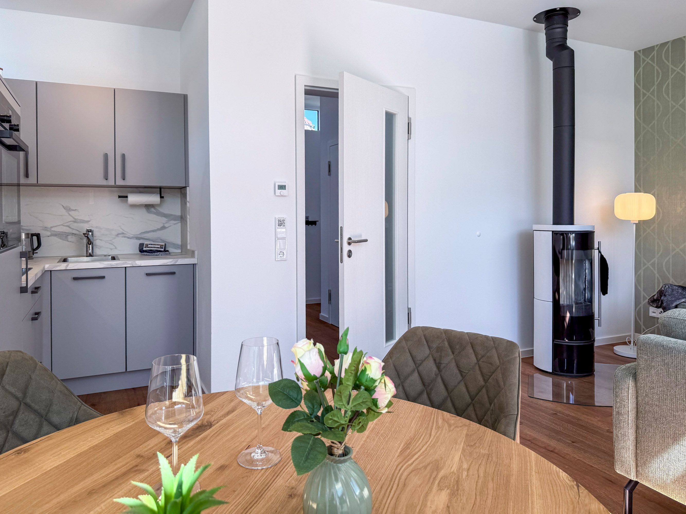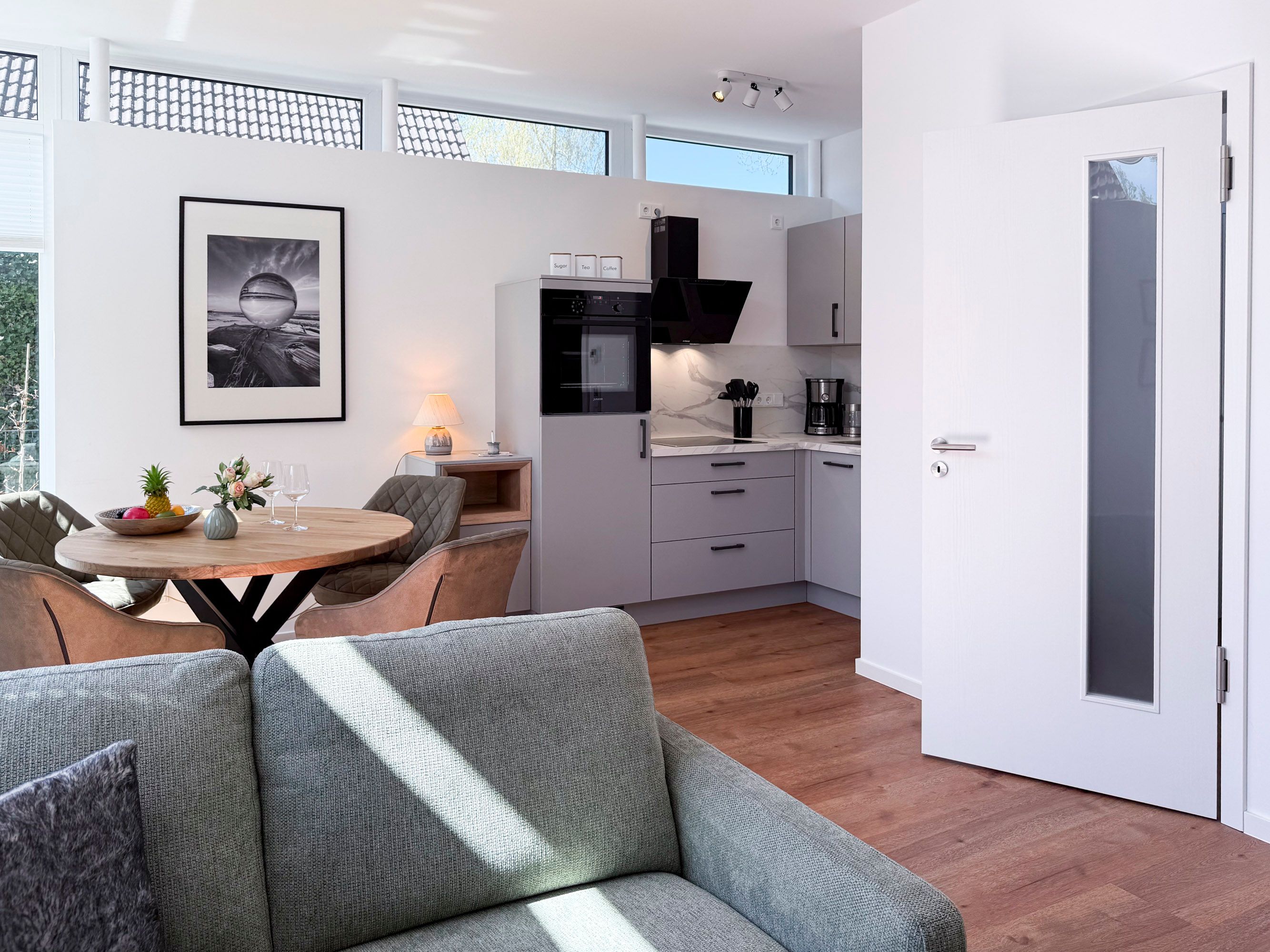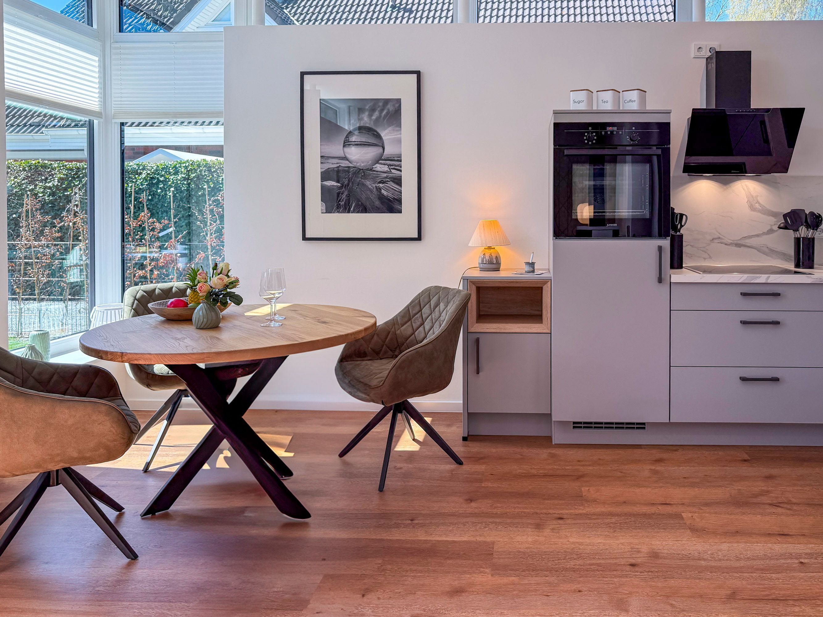 • Voll ausgestattete Küchenzeile mit Geschirrspüler, Backofen, Kochfeld, Kühlschrank, Filterkaffeemaschine, Toaster und Wasserkocher