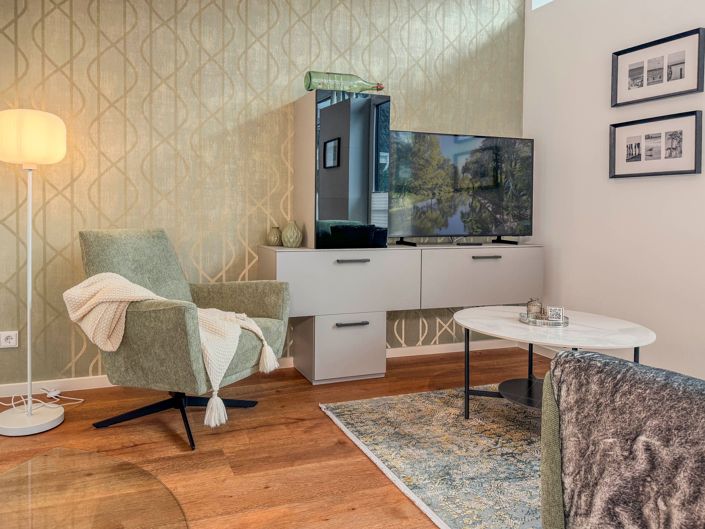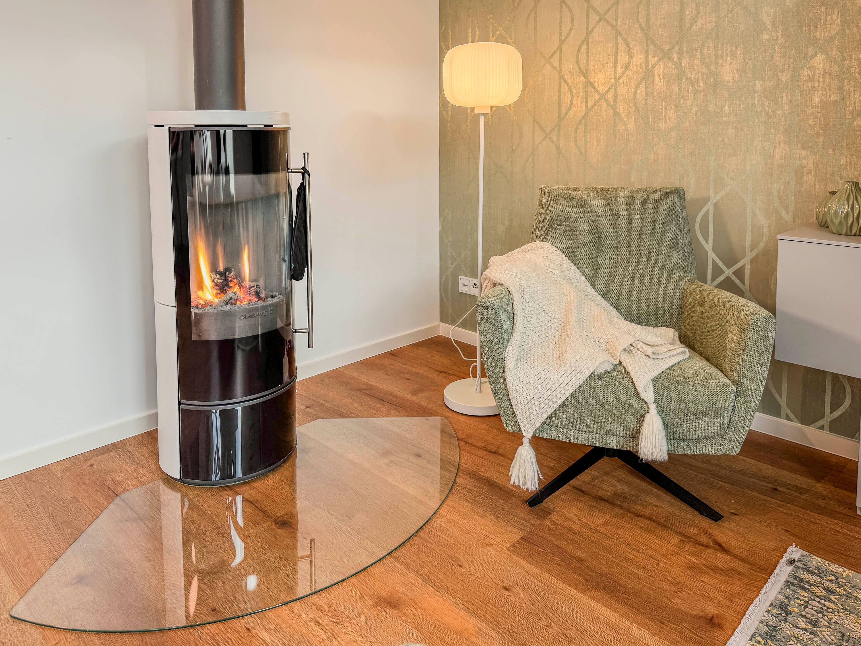 • Gemütlicher Wohnbereich mit Kamin, bequemer Sitzgruppe und Flachbild-TV