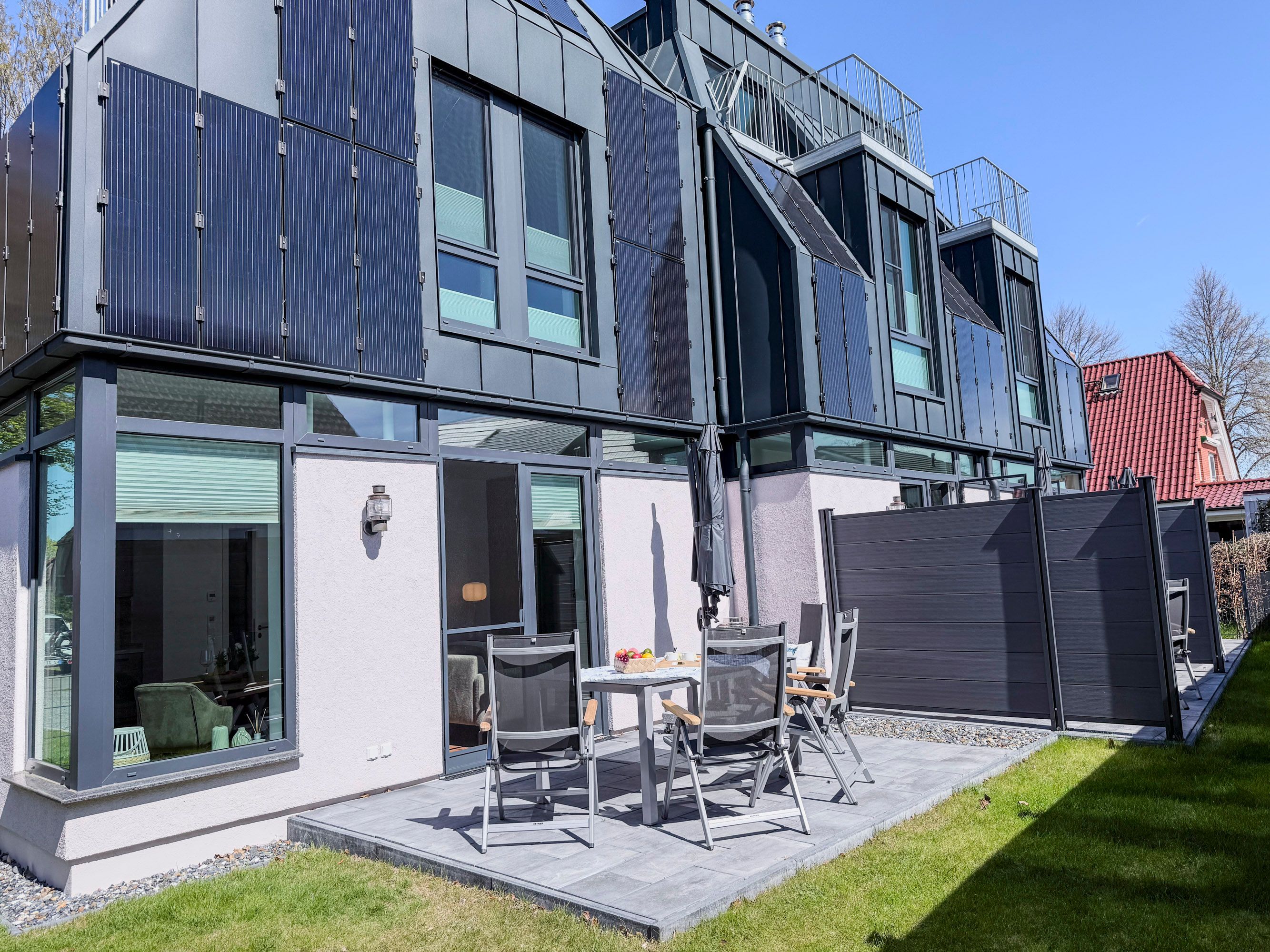 • Private Terrasse mit Gartenmöbeln und Sonnenschirm perfekt für entspannte Stunden im Freien