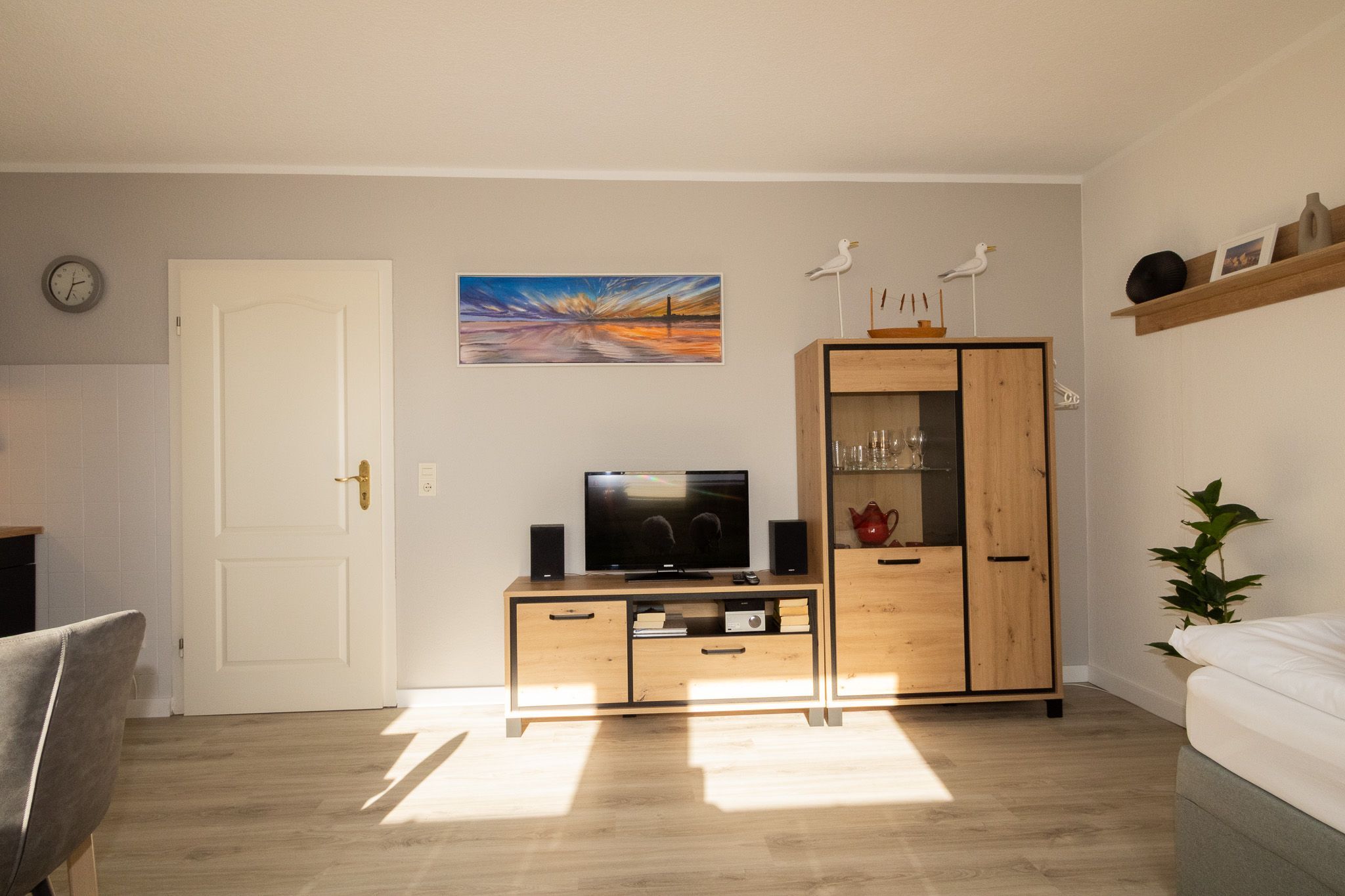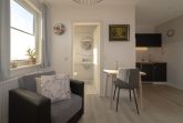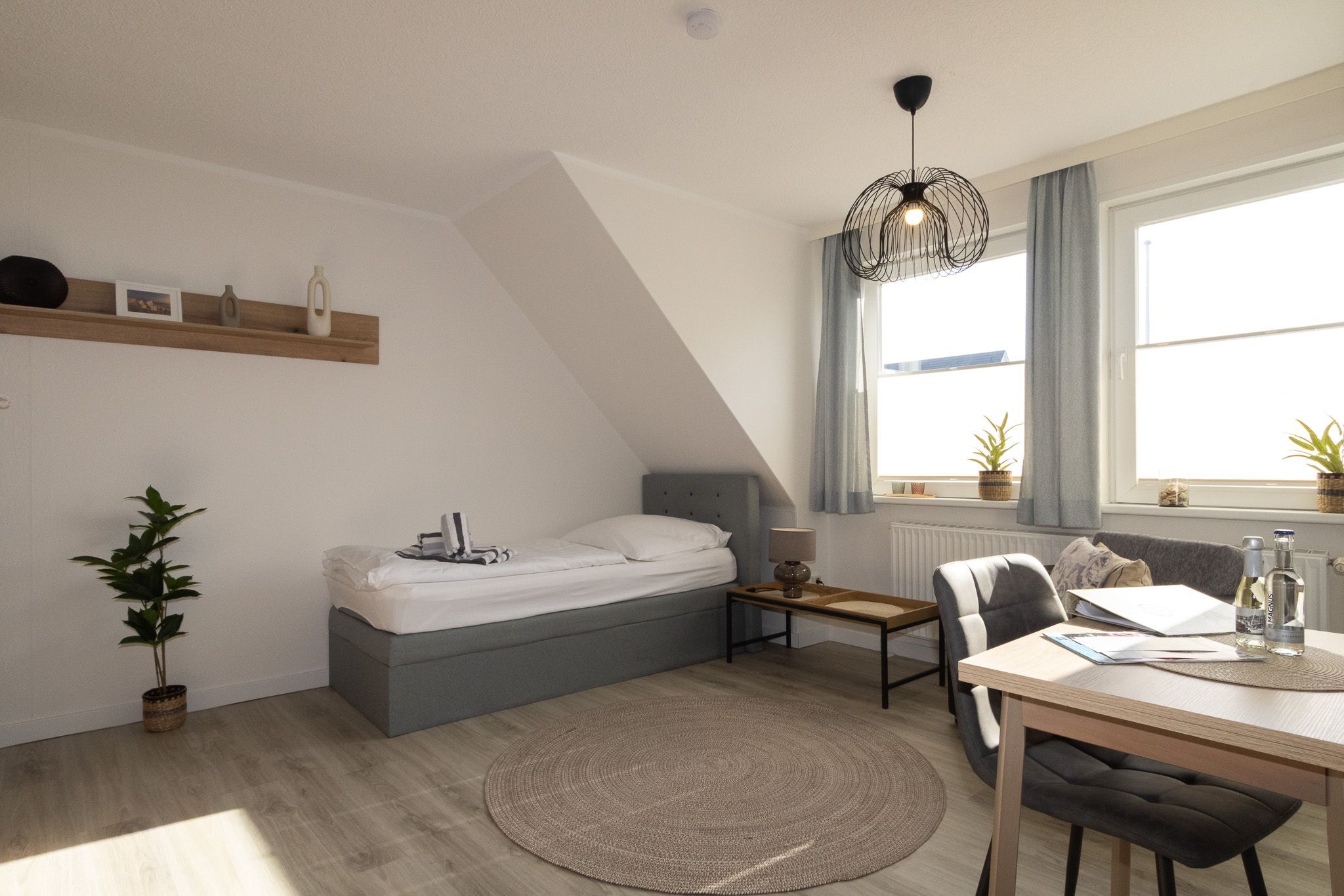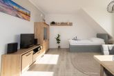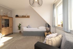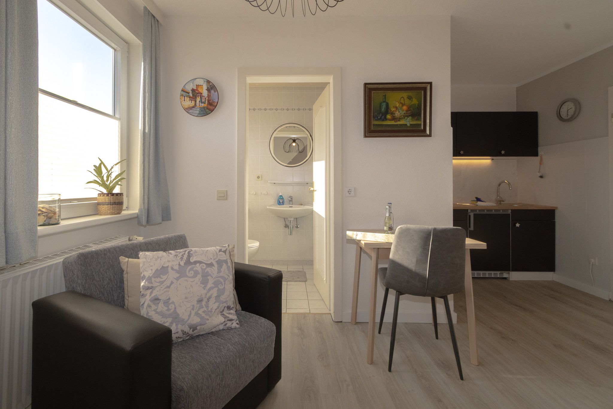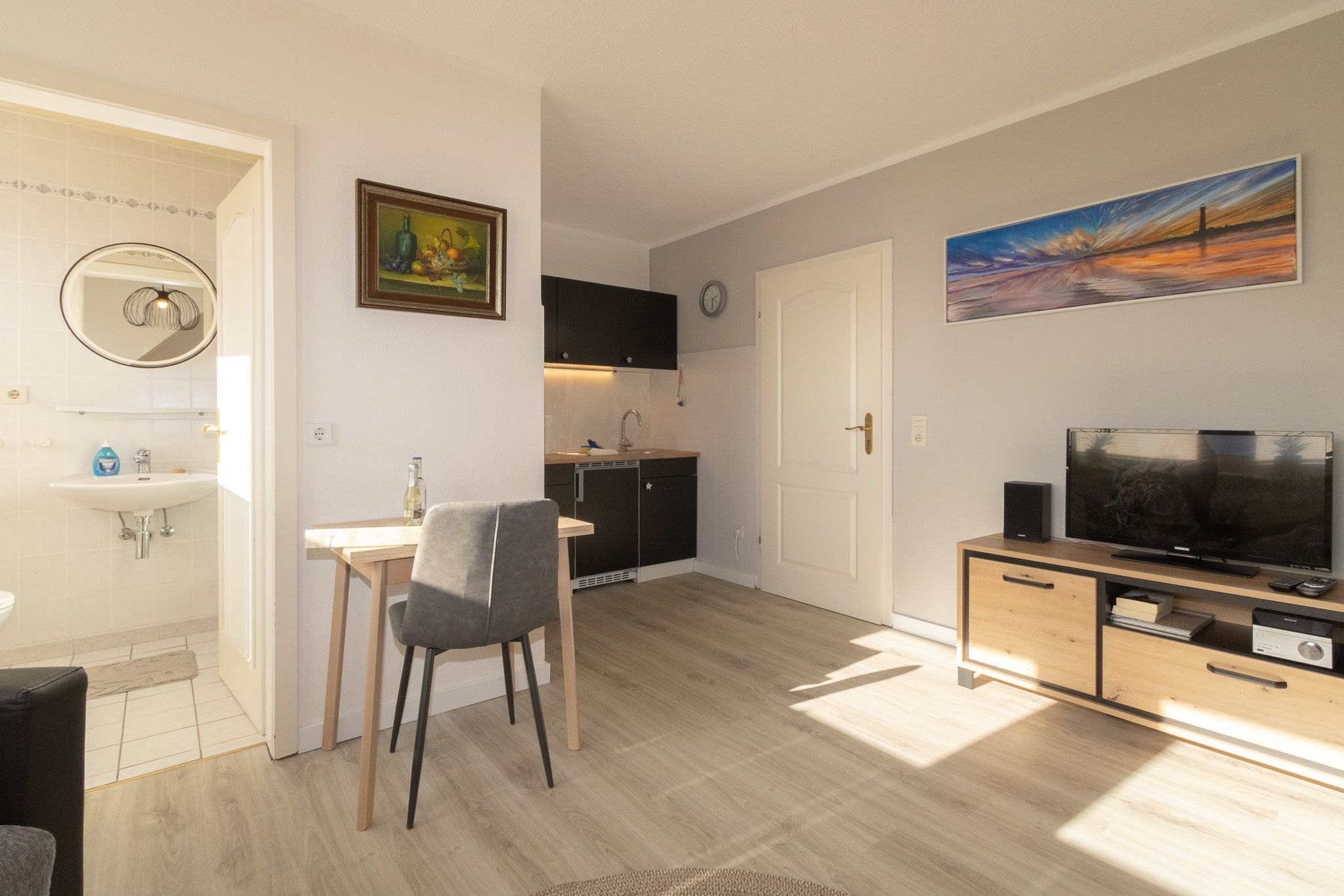 Die Wohnung befindet sich im Obergeschoss des Hauses. Sie verfügt über 1 Einzelboxspringbett ist. Die Pantryküche ist mit Allem ausgestattet für den täglichen Bedarf. Kaffeemaschine, Toaster und Wasserkocher sind ebenfalls vorhanden. Das Badezimmer verfügt über ein WC und eine Dusche und ist hell ausgestattet.