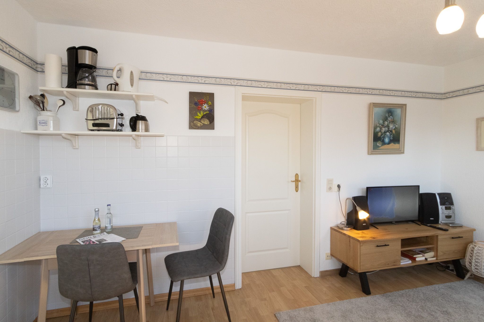 Gemütliche 2-Raum Ferienwohnung mit 2 nebenander stehenden Einzelbetten und einer Pantryküche für den täglichen Bedarf.