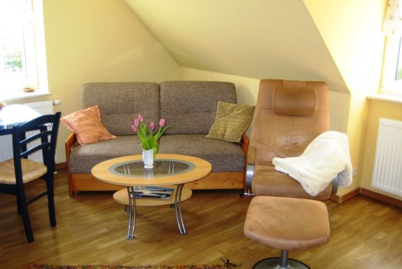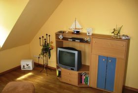 Unsere moderne Ferienwohnung liegt im Dachgeschoss eines im Jahre 2005 neu gebauten Hauses. Über einen separaten Aufgang erreichen Sie die 48 m² größe Wohnung mit einem Wohnraum mit Pantryküche, Essecke und Couchecke (Aufbettung für ein Kind bis 12 Jahre), Fernseher und Radio. Ein Schlafzimmer mit Doppelbett gehört ebenso zur Wohnung wie ein Bad mit Dusche und WC. Die Erstaustattung Bettwäsche ist inklusive.