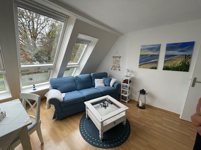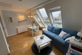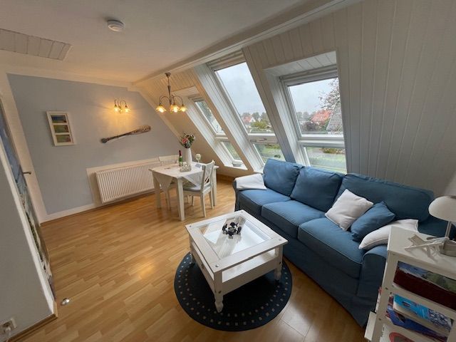 Das Wohnzimmer ist hell und freundlich, hat 3 große Dachfenster und ist gemütlich maritim eingerichtet.