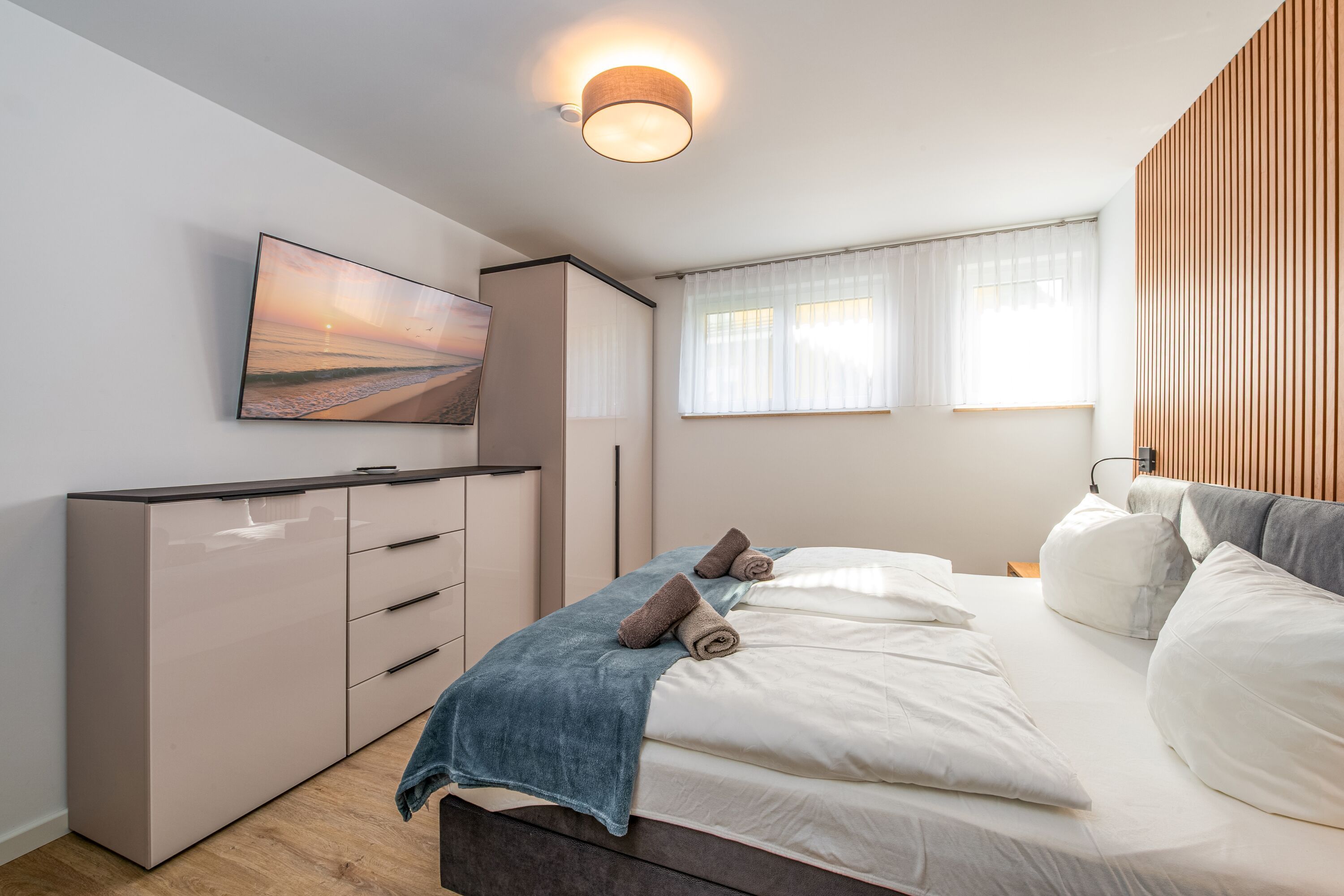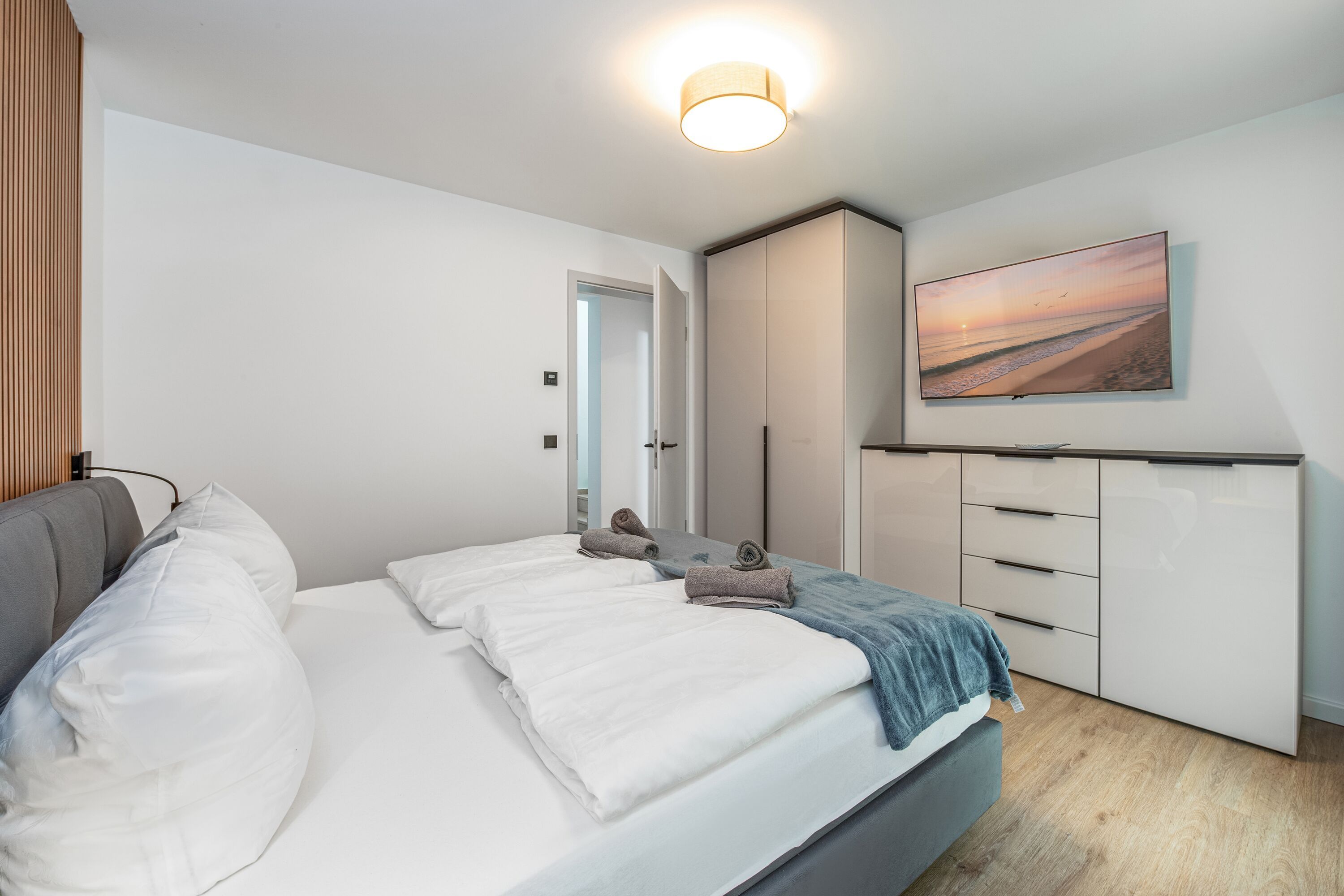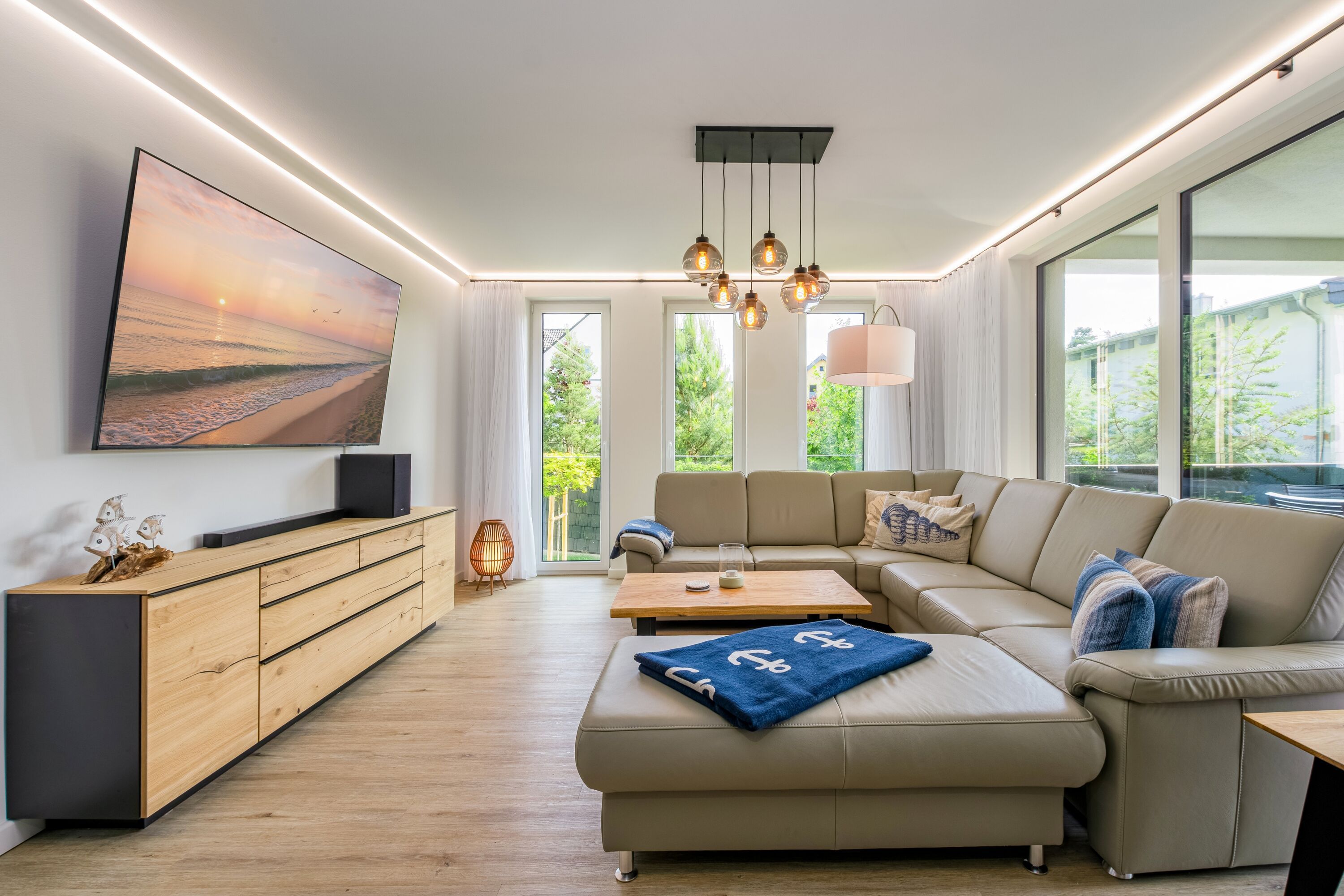 Erleben Sie unvergessliche Tage in der stilvollen Ferienwohnung 1 der Villa Stella Maris in Sellin! Mit großzügigen 173 m² bietet sie Platz für bis zu 8 Personen perfekt für Familien oder Gruppen, die höchsten Komfort suchen. Die Wohnung verfügt über 4 geschmackvoll eingerichtete Schlafzimmer, von denen jedes mit einem eigenen Fernseher, einem modernen Badezimmer mit Dusche und einem Sonnenschutz ausgestattet ist. Ein Schlafzimmer befindet sich im Erdgeschoss ideal für Gäste, die kurze Wege bevorzugen während sich die drei weiteren Schlafzimmer sowie die private Sauna im ruhig gelegenen Untergeschoss befinden. Dies garantiert jedem Gast maximale Privatsphäre und höchsten Komfort.