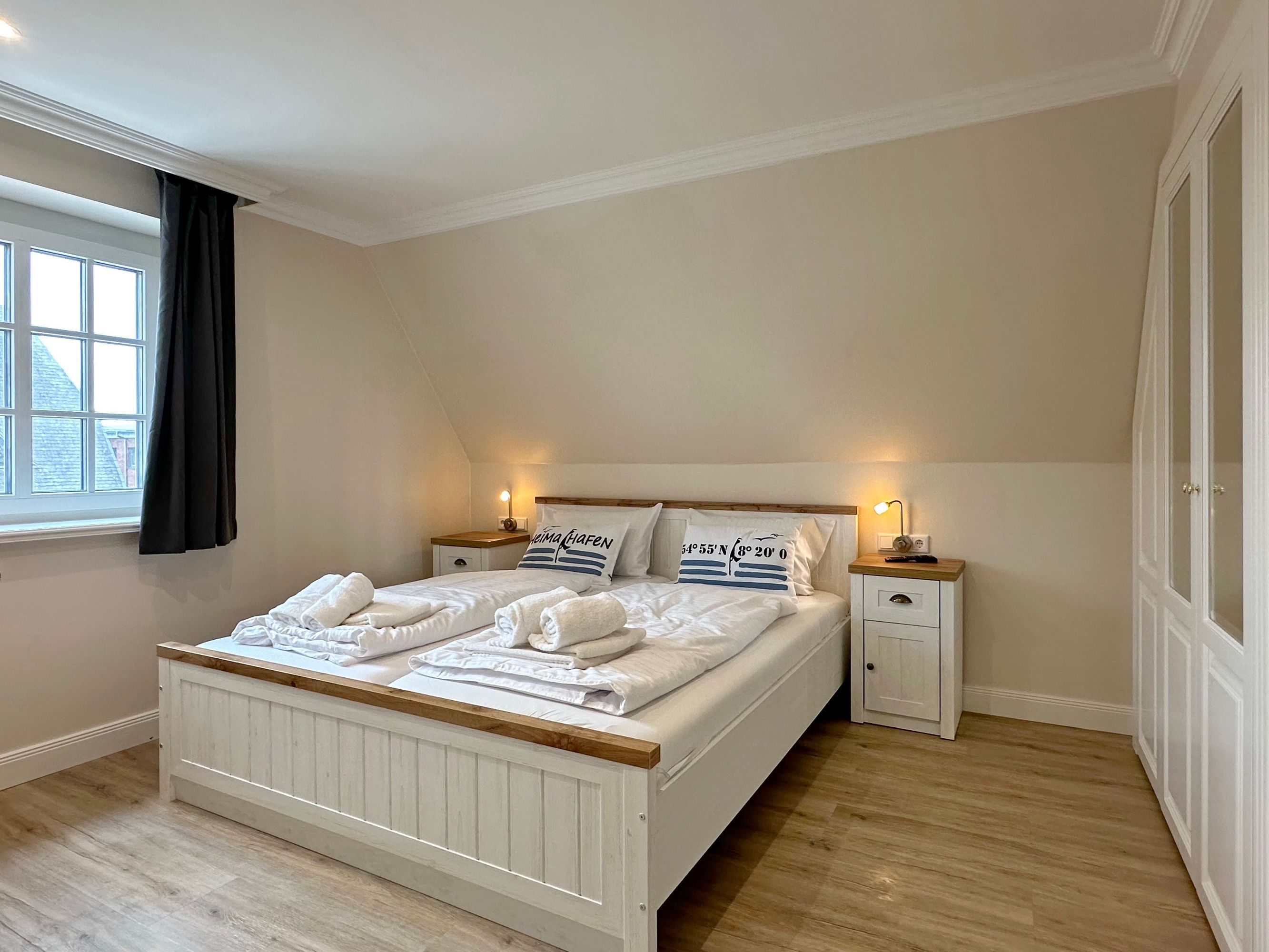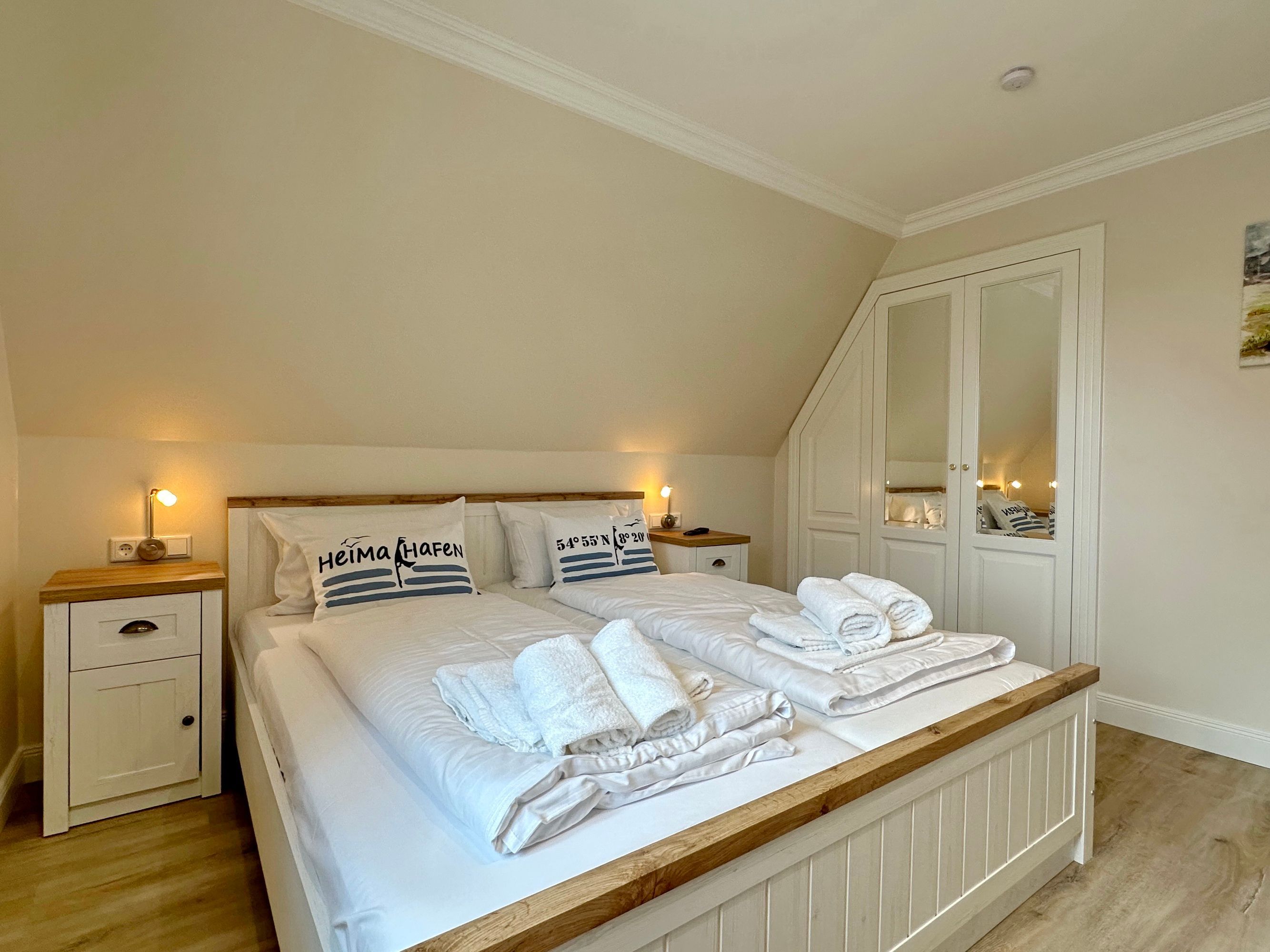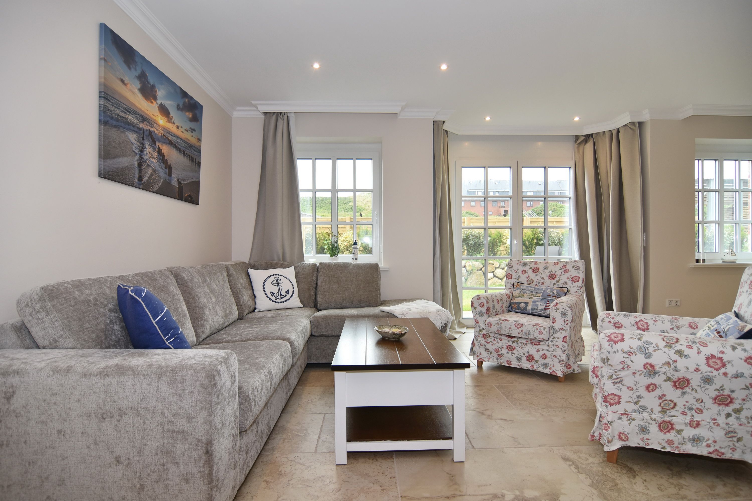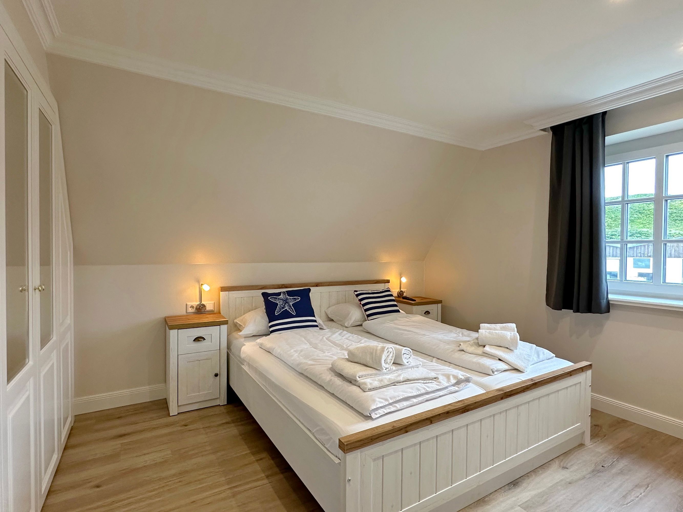 Großzügige Doppelhaushälfte in zentaler und strandnaher Lage Westerlands. EG: Wohnraum mit Essplatz, Sitzecke, TV, Kamin, offene Küche mit Kühlschrank, Backofen, Mikrowelle, Ceranfeld, Geschirrspüler, Kühlschrank und Gefrierschrank. Garten mit Südterrasse und Terrassenmöbeln. Gäste-WC, Heizungs-/Abstellraum mit Kinderreisebett (120x60, ohne Matratze und Bettzeug) und Kinderhochstuhl. OG: 2 Schlafzimmer mit Doppelbetten (180x200, 2 Matratzen), 1 Schlafzimmer mit 2 Einzelbetten (je 90x200). Alle Schlafzimmer mit Kleiderschrank und TV. Ein Bad ensuite mit großer bodentiefer Dusche, Waschmaschine und Trockner, ein Bad mit Wanne mit Duschvorrichtung, das vom Flur aus begehbar ist. Parkmöglichkeiten am Haus für maximal 2 Pkws. Fahrräder können derzeitig im Garten, später auch in der Garage abgestellt werden. Tierhaltung ist gestattet und muss kostenpflichtig angemeldet werden. Der Garten ist komplett eingezäunt. Rauchen im Objekt ist nicht gestattet.