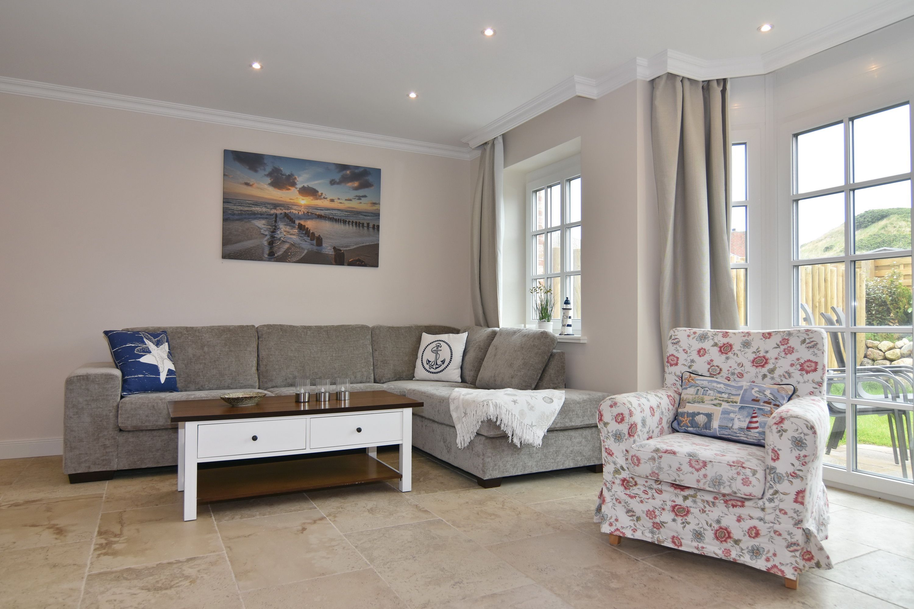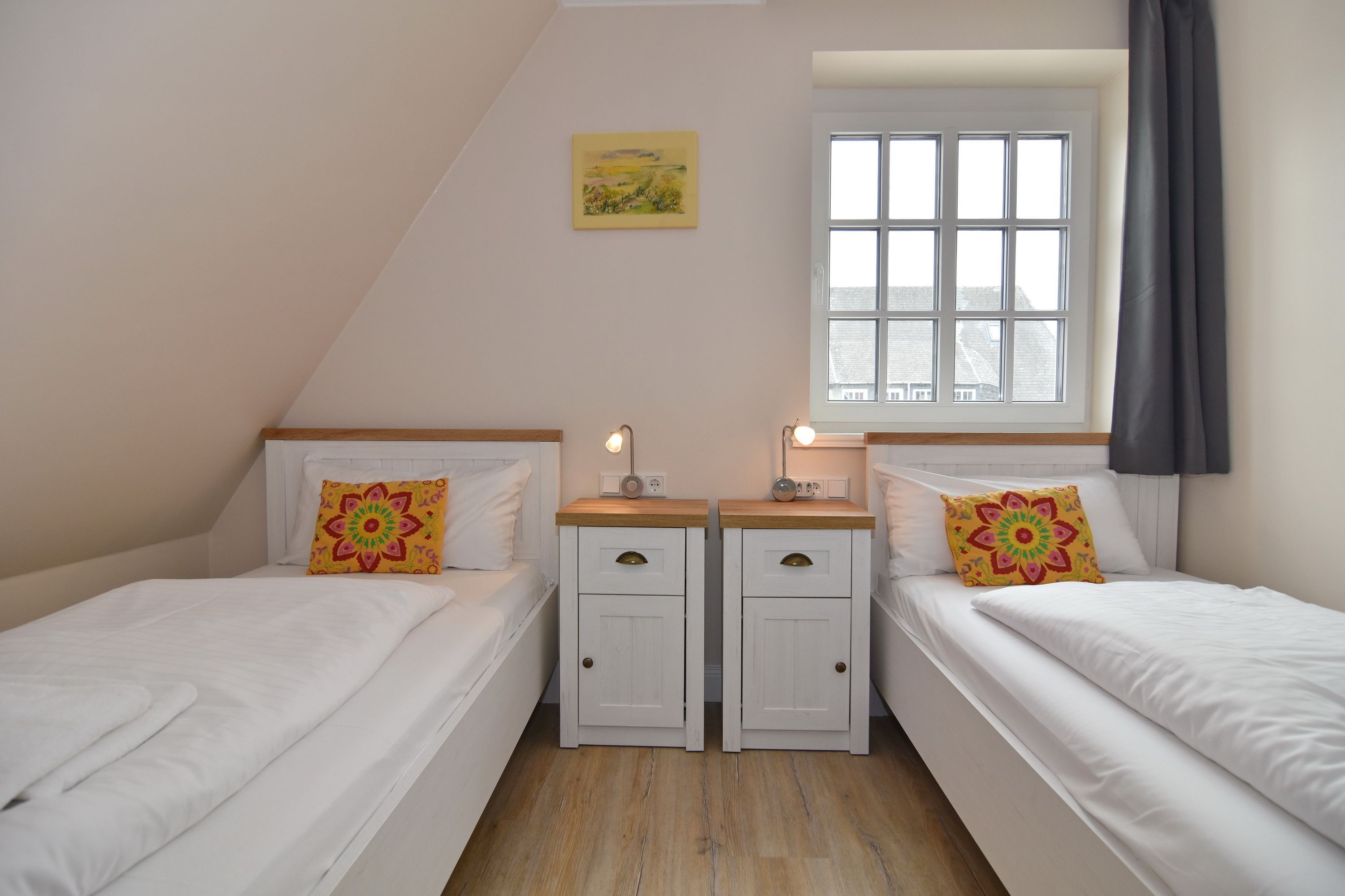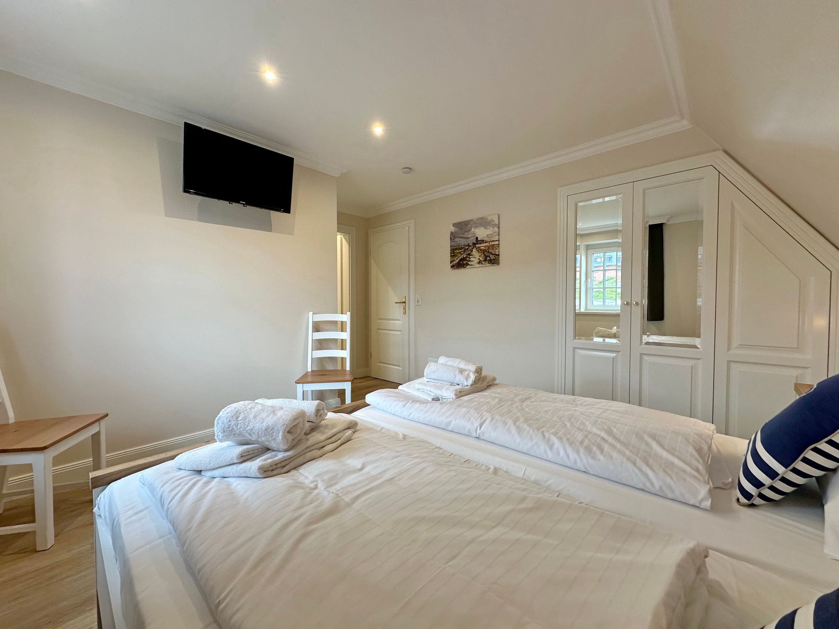 Großzügige Doppelhaushälfte in zentaler und strandnaher Lage Westerlands. EG: Wohnraum mit Essplatz, Sitzecke, TV, Kamin, offene Küche mit Kühlschrank, Backofen, Mikrowelle, Ceranfeld, Geschirrspüler, Kühlschrank und Gefrierschrank. Garten mit Südterrasse und Terrassenmöbeln. Gäste-WC, Heizungs-/Abstellraum mit Kinderreisebett (120x60, ohne Matratze und Bettzeug) und Kinderhochstuhl. OG: 2 Schlafzimmer mit Doppelbetten (180x200, 2 Matratzen), 1 Schlafzimmer mit 2 Einzelbetten (je 90x200). Alle Schlafzimmer mit Kleiderschrank und TV. Ein Bad ensuite mit großer bodentiefer Dusche, Waschmaschine und Trockner, ein Bad mit Wanne mit Duschvorrichtung, das vom Flur aus begehbar ist. Parkmöglichkeiten am Haus für maximal 2 Pkws. Fahrräder können derzeitig im Garten, später auch in der Garage abgestellt werden. Tierhaltung ist gestattet und muss kostenpflichtig angemeldet werden. Der Garten ist komplett eingezäunt. Rauchen im Objekt ist nicht gestattet.