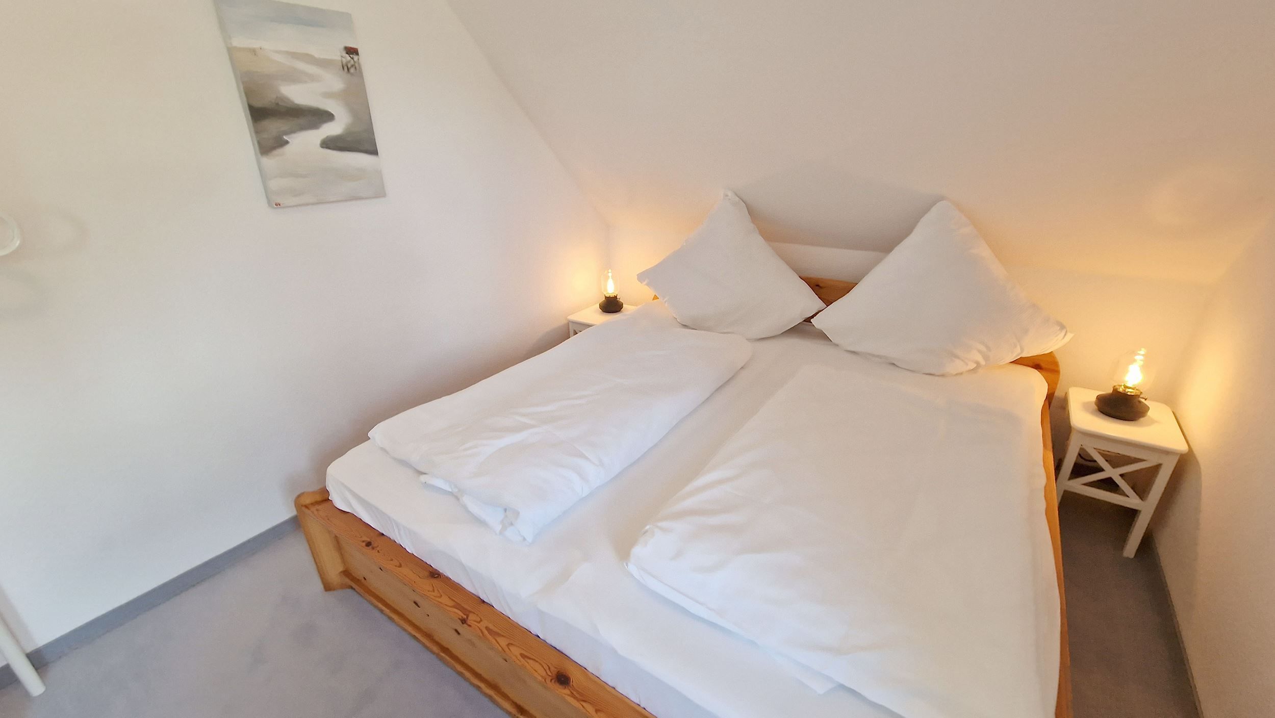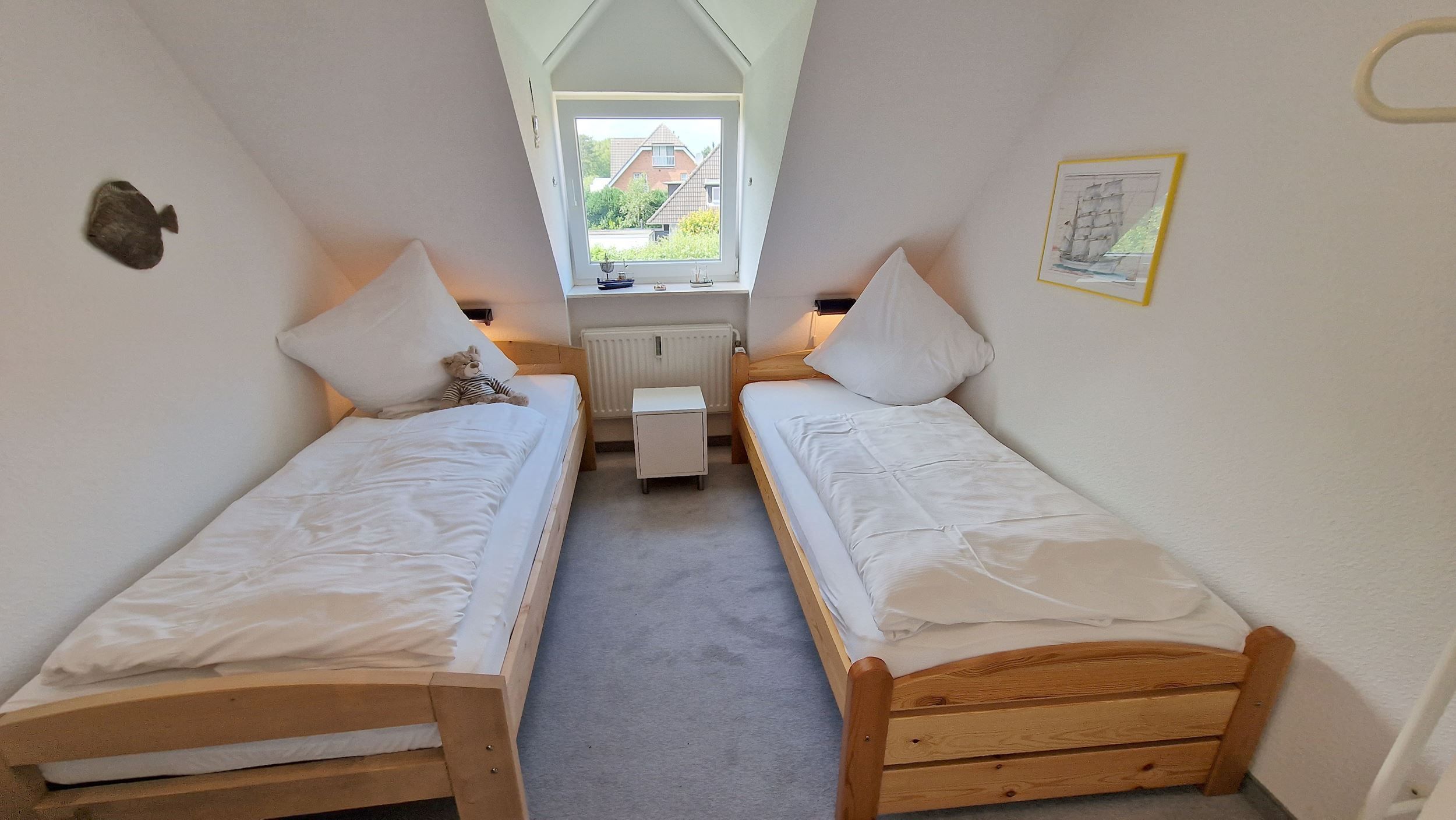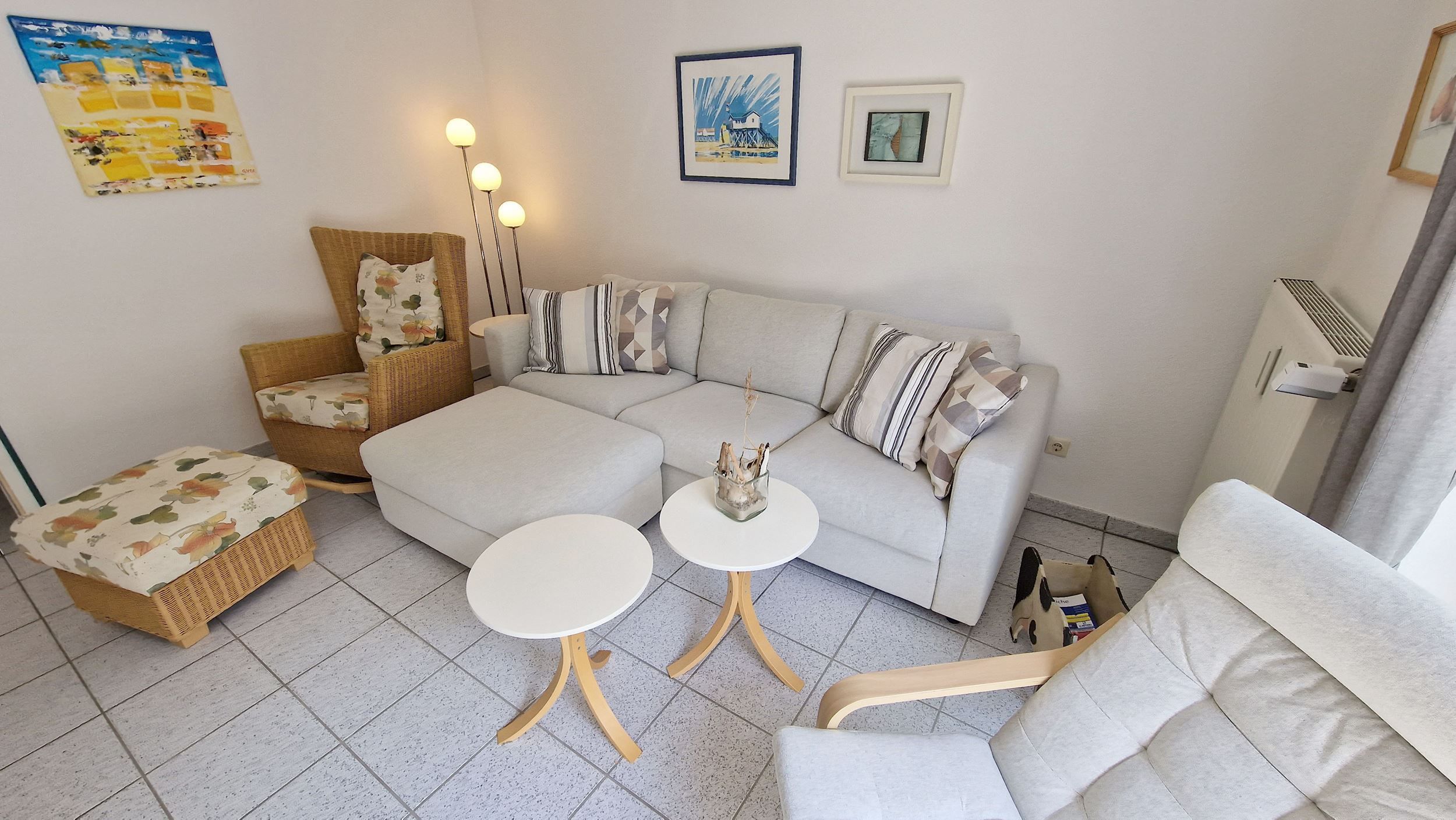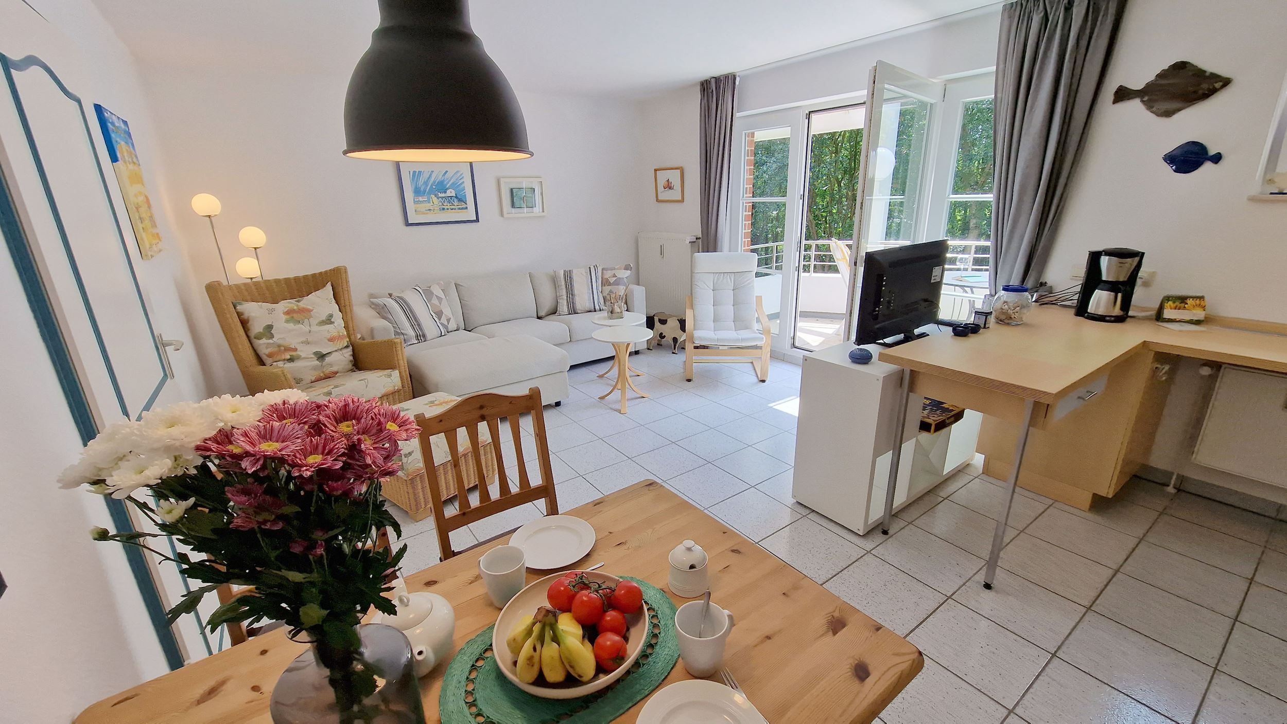 Das 60 Quadratmeter große Ferien-Appartement ist für einen Urlaub an der Nordsee die ideale Ruhe-Oase. Dazu passt der Spruch Ihres Domizils ideal: Gönne dir einen Augenblick der Ruhe und achte auf das, was dir Freude macht. Bis zu vier Personen können es sich hier gut gehen lassen. Das Urlaubsdomizil ist hell und modern eingerichtet und liegt im 2ten Obergeschoß. Frische Farben, Bilder und Accessoires sorgen für Akzente. Das Wohnzimmer ist großzügig geschnitten, bietet viel Platz zum Kuscheln auf dem Sofa. Genießen Sie darüber hinaus den großen Südbalkon oder essen Sie entspannt am Esstisch. Die Küche ist offen und mit Geräten wie Herd, Kühlschrank, Spülmaschine, Toaster etc. voll ausgestattet. Den großen Südbalkon mit Strandkorb können Sie vom Wohnzimmer aus betreten. Ob beim Sonnenbaden im Strandkorb oder beim Frühstück im Freien die frische Nordseeluft erfrischt so oder so Körper und Seele. Großer Fahrradkeller, Stellplatz Nr.05 & WLAN sind ebenfalls kostenlos enthalten.