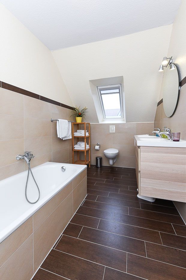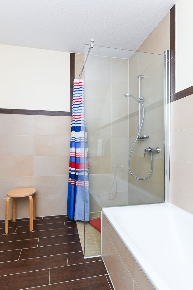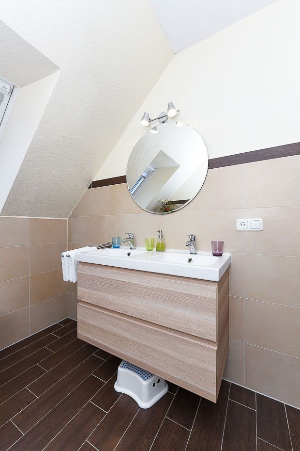 Badezimmer mit Dusche, 2 Waschtischen und WC