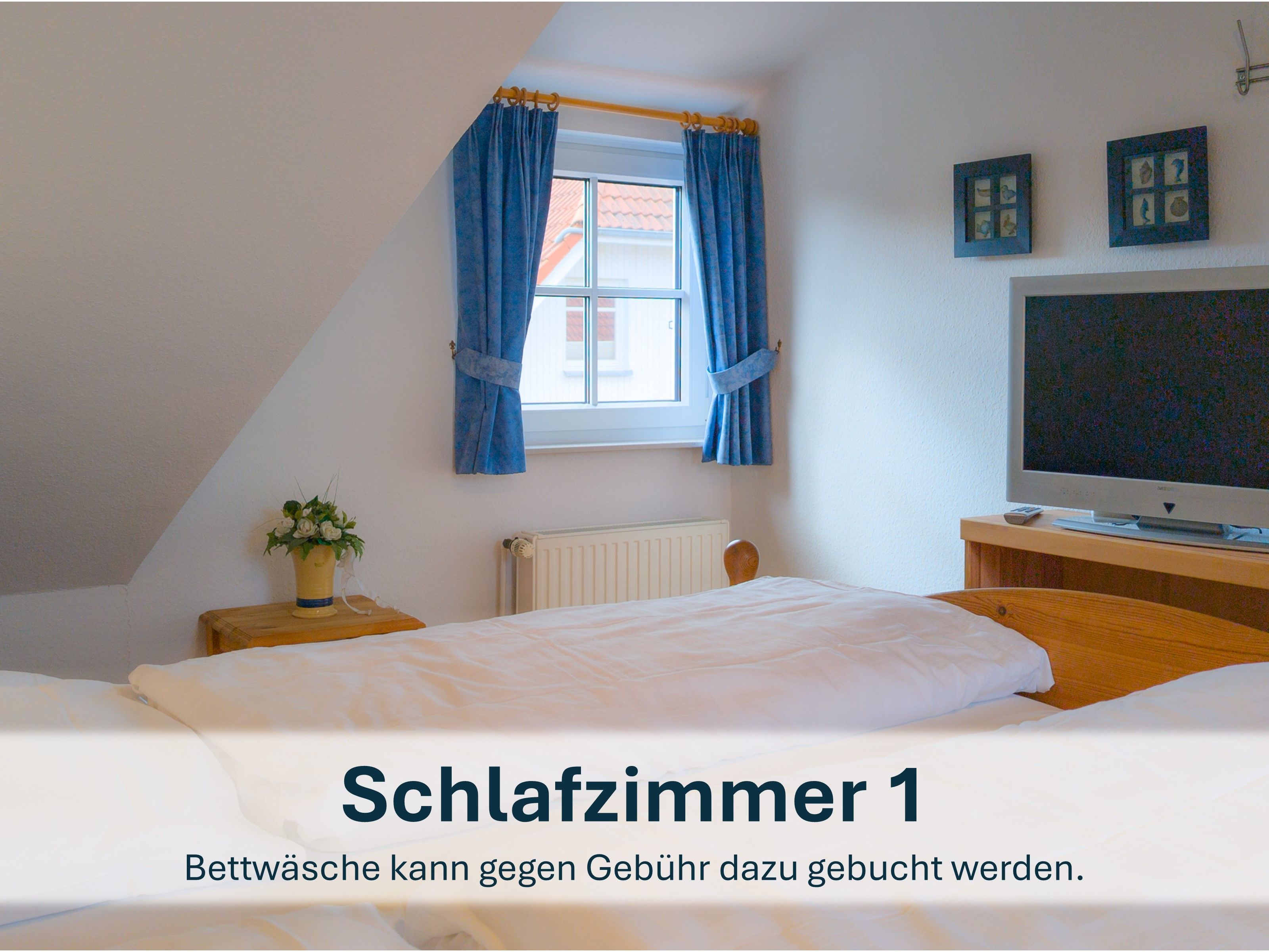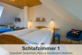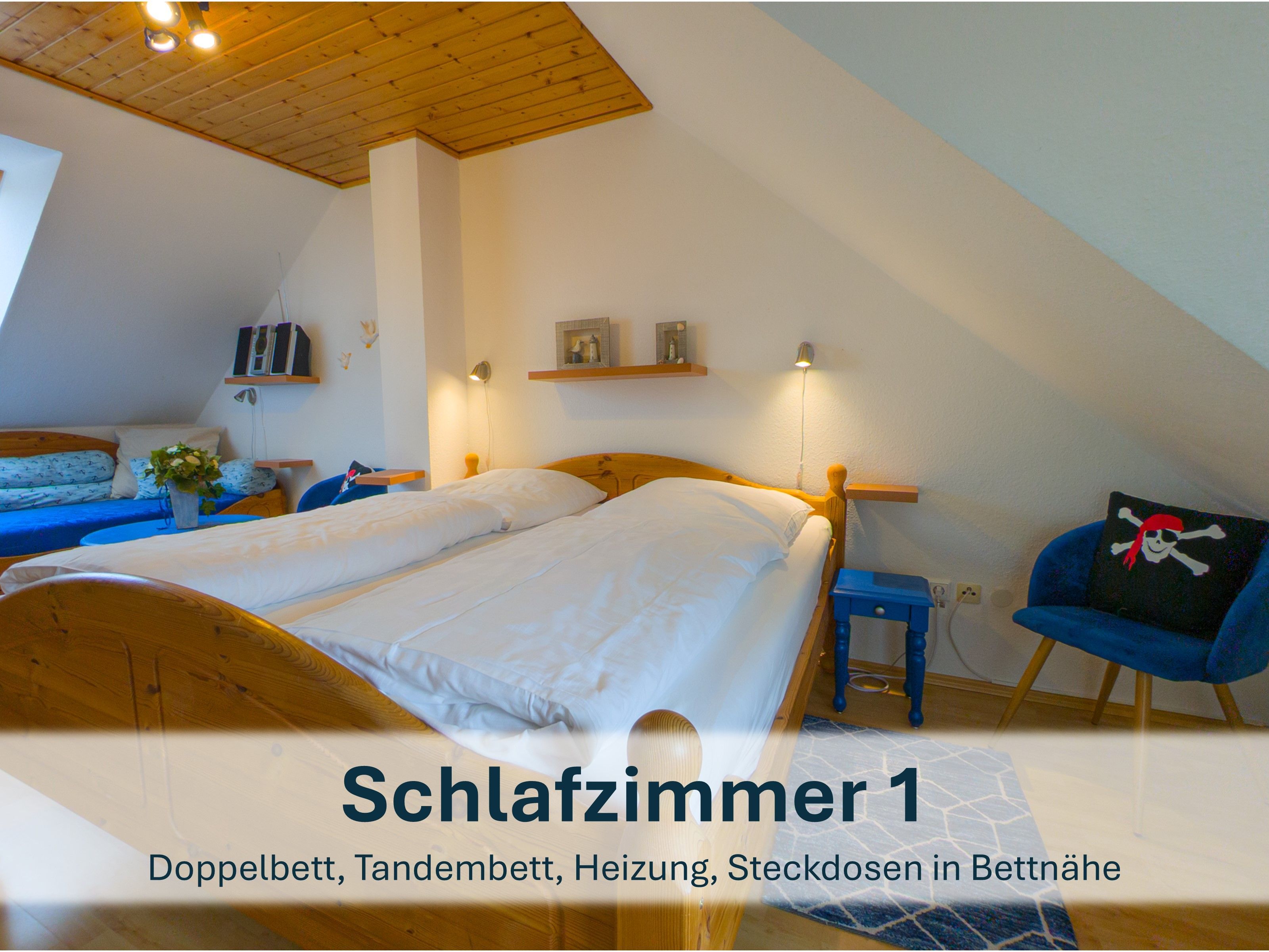 Über die Holztreppe im Flur gelnagen Sie in das Obergeschoss des Hauses.Hier befinden sich zwei weitere Schlafzimmer: ein Kinderzimmer mit zwei Einzelbetten und einem kleinen Schreibtisch, sowie ein Schlafzimmer mit Doppelbett und einer Kommode.