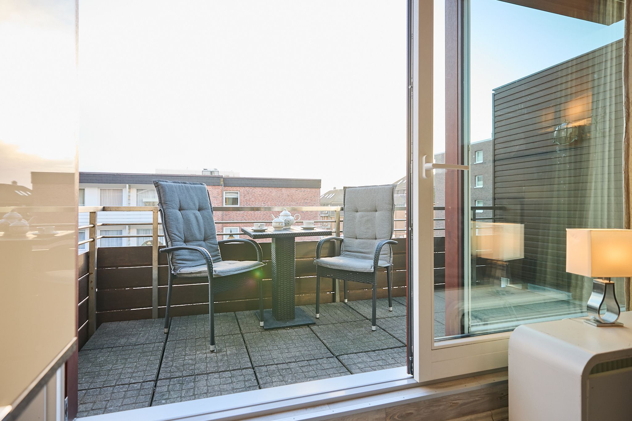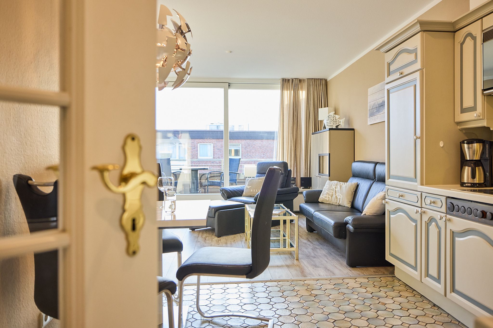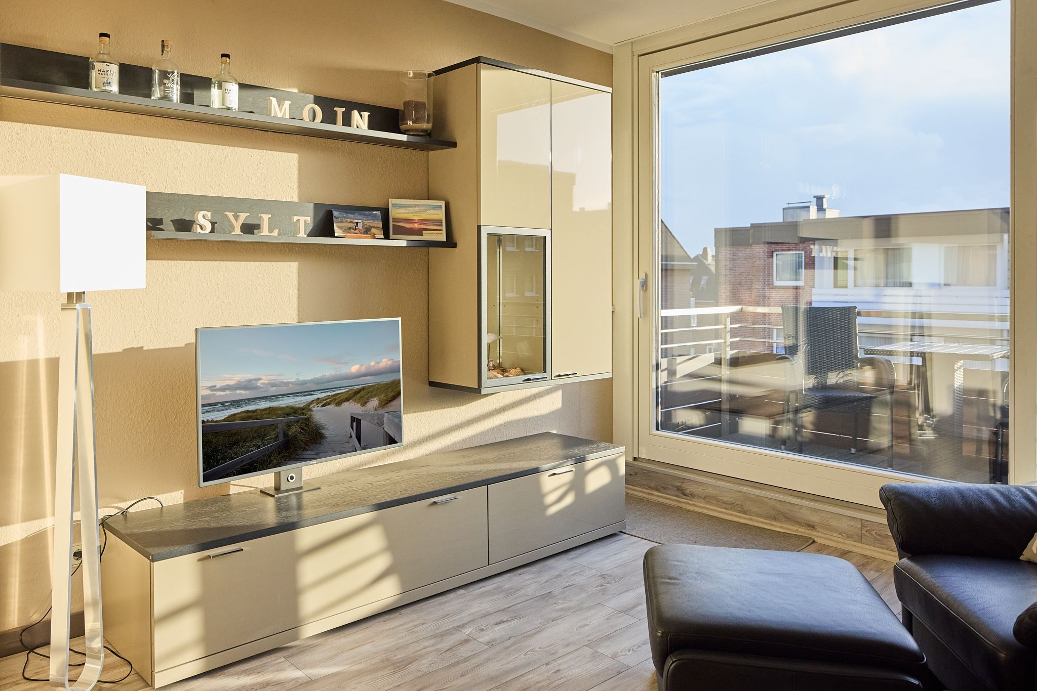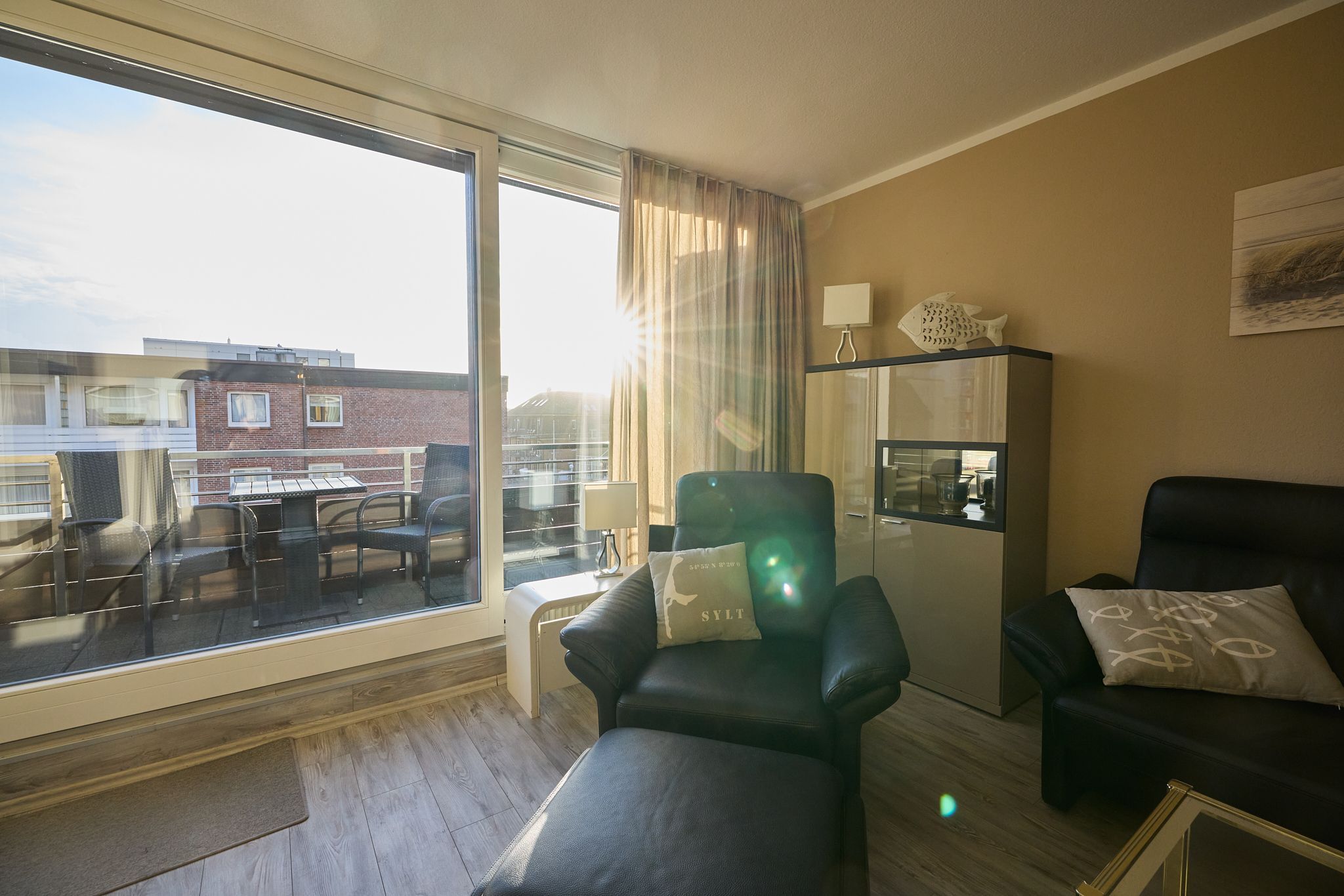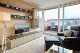 Vor Ihnen liegt nun direkt der helle Wohnbereich mit Lederausstattung und direktem Zugang zum Balkon. Durch die Lage zur Südseite ist die Wohnung, trotz direkter City-Lage, sehr ruhig gelegen. Der Balkon hat Option auf ganztägige Sonne. Ebenfalls im Raum finden Sie eine voll ausgestattete Küchenecke mit einem Essbereich.