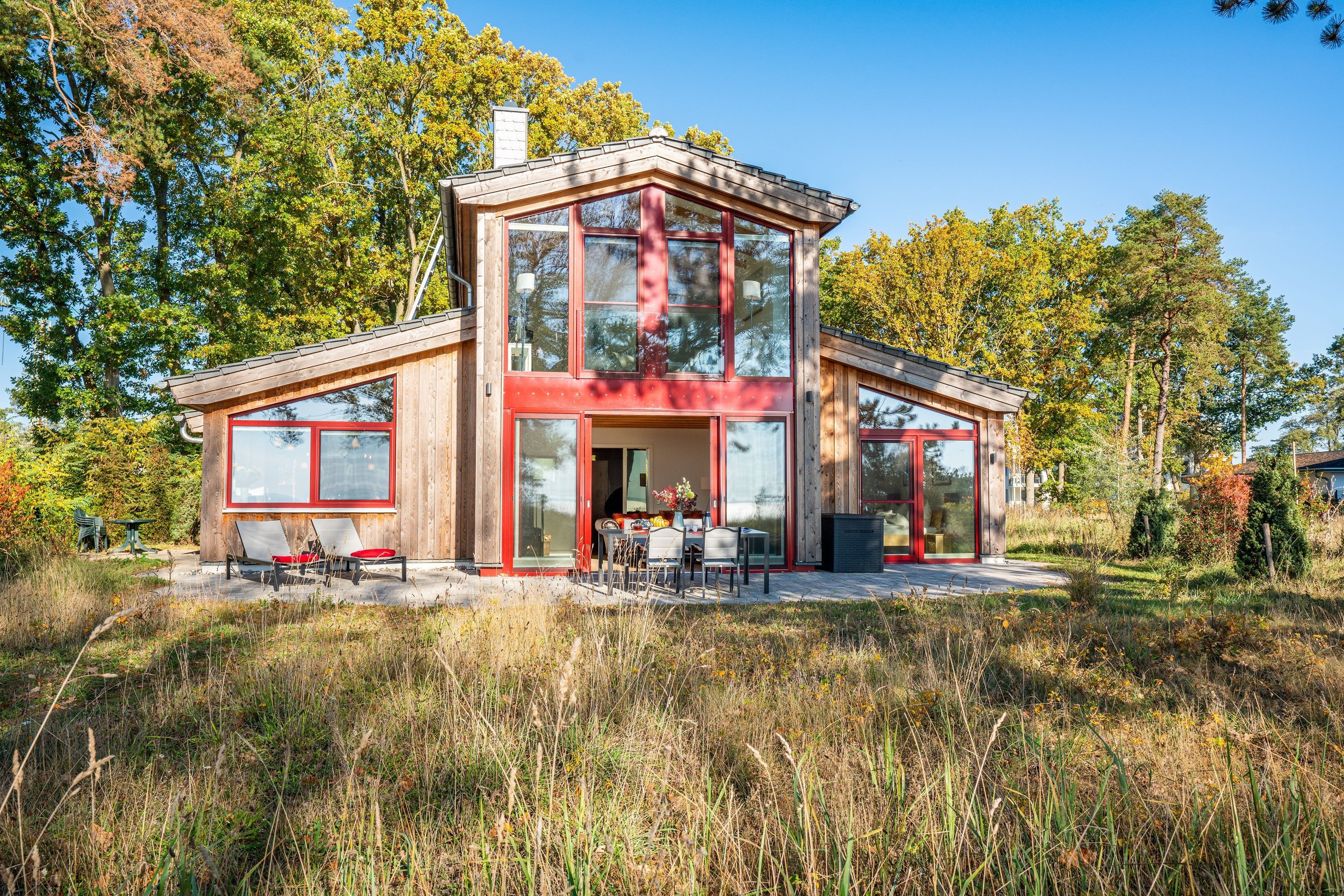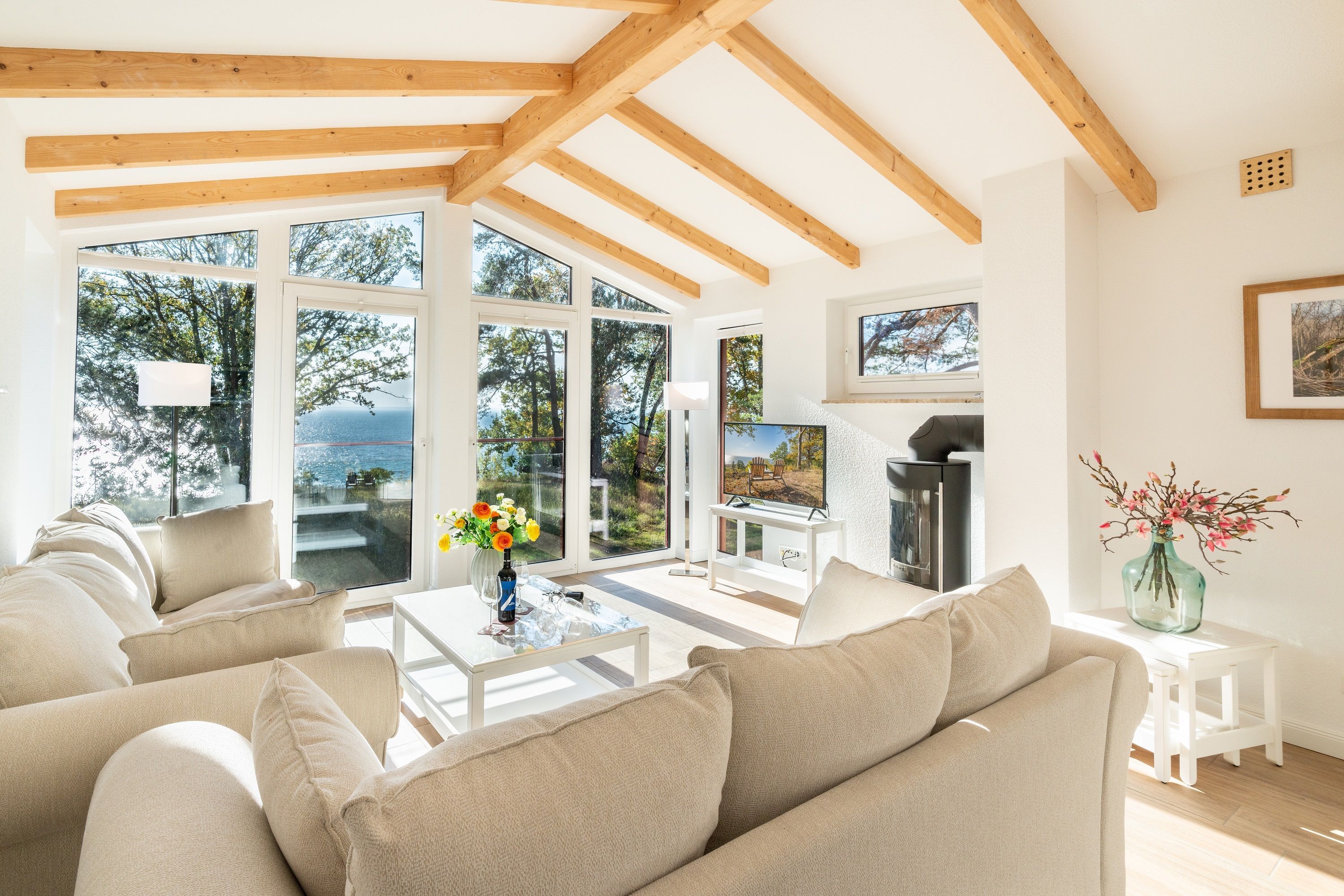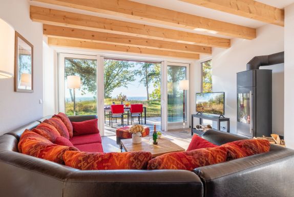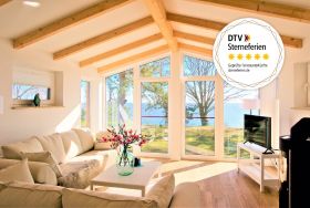 Betreten Sie dieses mit 5 Sternen (DTV) ausgezeichnete Feriendomizil und lassen Sie es auf sich wirken. Warme Sonnenstrahlen fluten durch die nach Süden ausgerichtete Glasfront mit bodentiefen Fenstern und tauchen das komfortabel eingerichtete Wohnzimmer in ein helles Licht. Ganz im Sinne von Baumeister Biber besteht das Gebäude vor allem aus Holz.