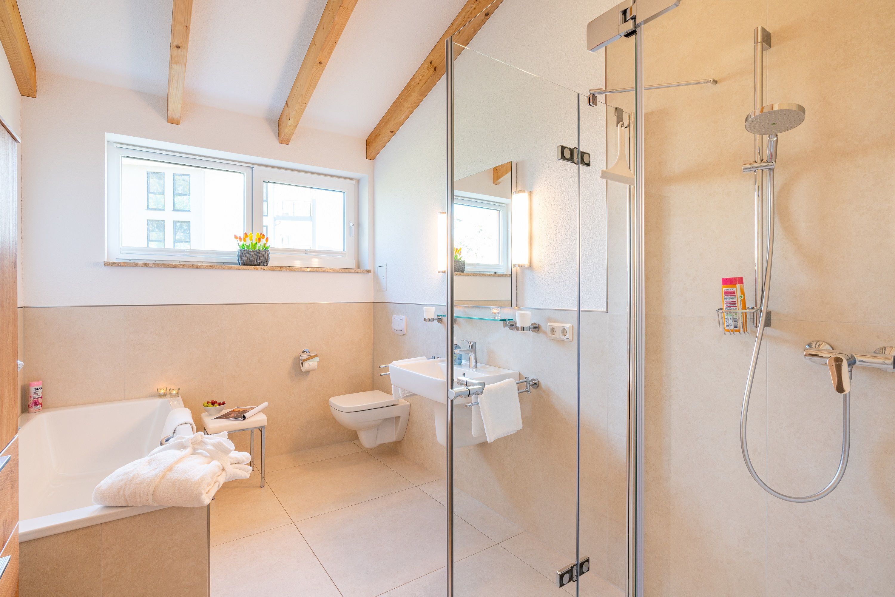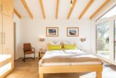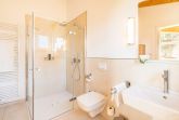 Auf der gegenüberliegenden Seite des Wohnzimmers erreichen Sie das erste Schlafzimmer (Doppelbett 1,80 x 2,00 m, Höhe 56 cm) mit anschließendem Bad, in dem sich eine bodengleiche Dusche (1,20 x 1,20 m) und ein unterfahrbares Waschbecken befinden. Das Erdgeschoss ist bewusst barrierefrei gebaut und somit ein geeignetes Feriendomizil für Rollstuhlfahrerinnen und Rollstuhlfahrer. Das zweite Duschbad mit ebenerdiger Dusche (1,00 x 1,00 m), Badewanne und unterfahrbarem Waschbecken befindet sich ebenfalls im Erdgeschoss. Die Höhe des WCs beträgt 43 cm.