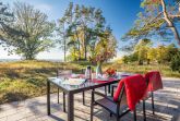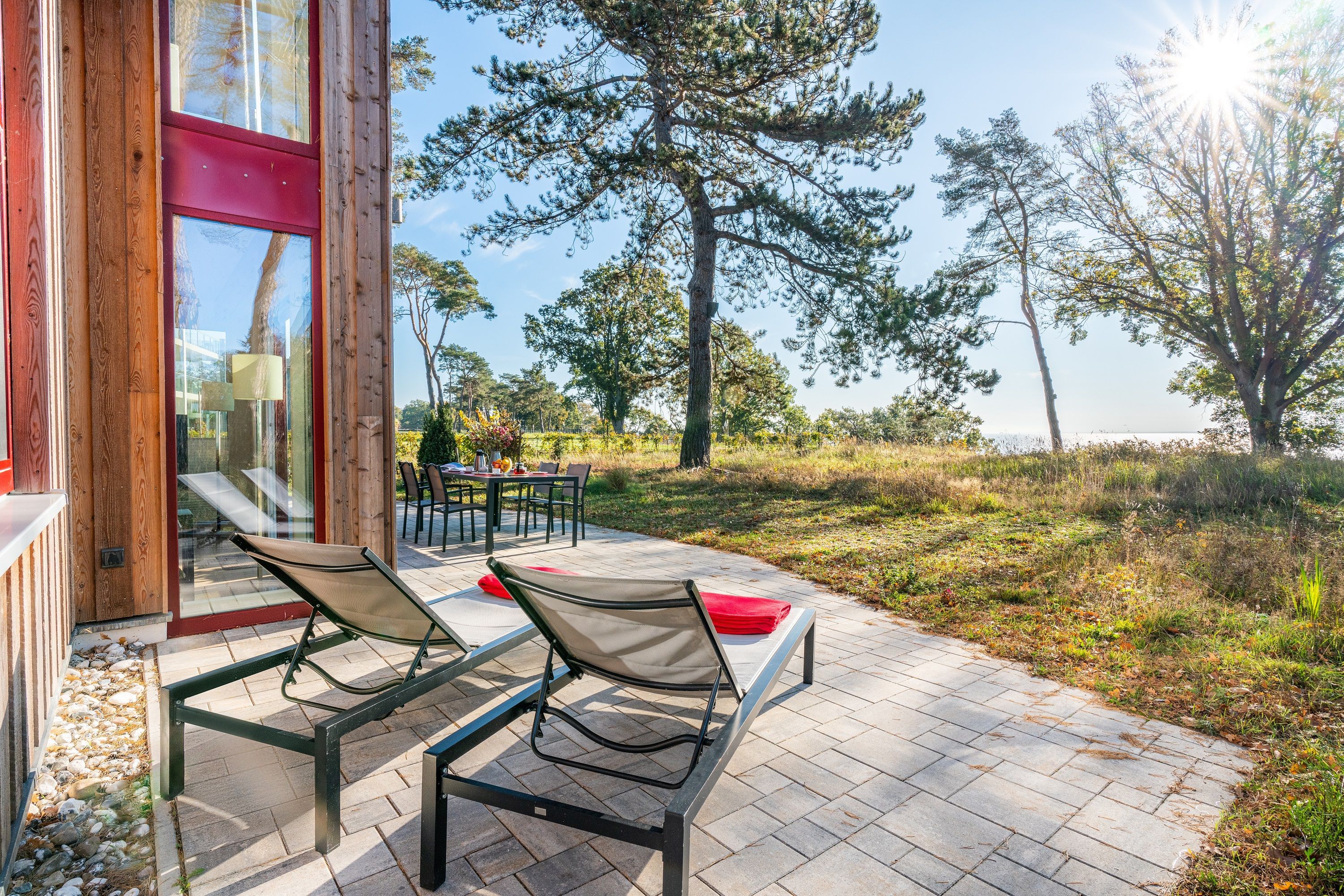 Im Sommer laden Sitzplätze und Sonnenliegen auf der ca. 50 m² großen Südterrasse zum Entspannen ein. Ein Elektrogrill steht für genussvolles Essen zur Verfügung. Traumhafte Sonnenuntergänge genießen Sie am besten bei einem Glas Wein direkt an der Kliffkante. Vom Esszimmer aus betreten Sie die ca. 20 m² große Westterrasse. Somit können Sie je nach Sonnenstand Ihren Aufenthalt im Freien genießen. Das 8.000 m² große und zum Haff nicht gezäunte Grundstück ist weitestgehend naturbelassen (keine Zierrasenfläche) und wird gern von Wild und Vögeln aller Art besucht. Hier darf wachsen, was der Boden hergibt.