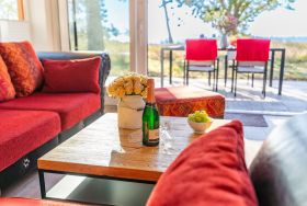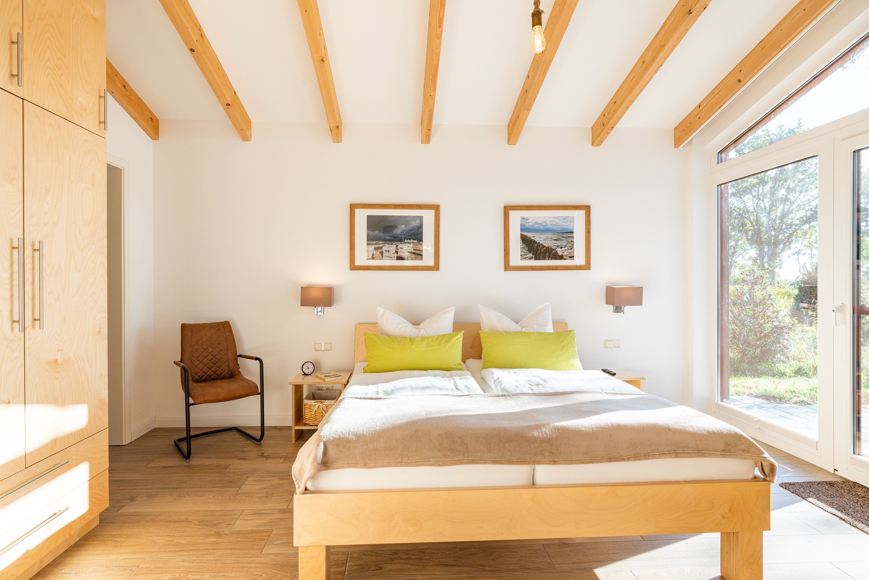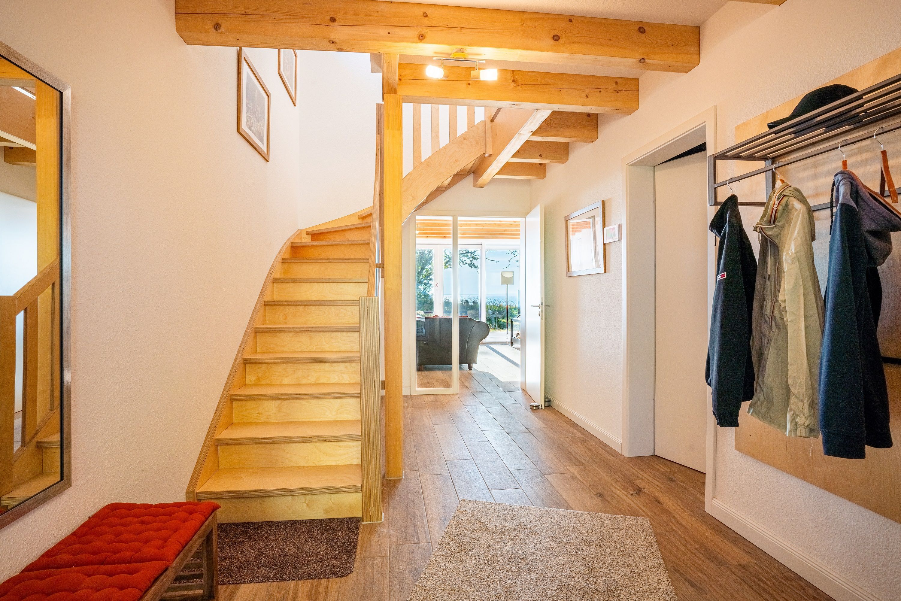 Über die schöne Holztreppe erreichen Sie das Obergeschoss. Hier steht Ihnen ein weiteres Wohnzimmer zur Verfügung. Der großartige Blick auf das Haff durch die bodentiefen Fenster wird Sie jeden Tag verzaubern. Im Obergeschoss befindet sich das zweite Schlafzimmer mit Doppelbett (1,80 x 2,00 m) sowie ein WC.