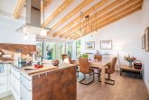 Der große Koch- und Essbereich ist vom Wohnzimmer aus zu betreten und nach Südwesten ausgerichtet. Er verfügt über Geschirrspüler, Induktionskochfeld, Mikrowelle und Kühl-/Gefrierkombination.