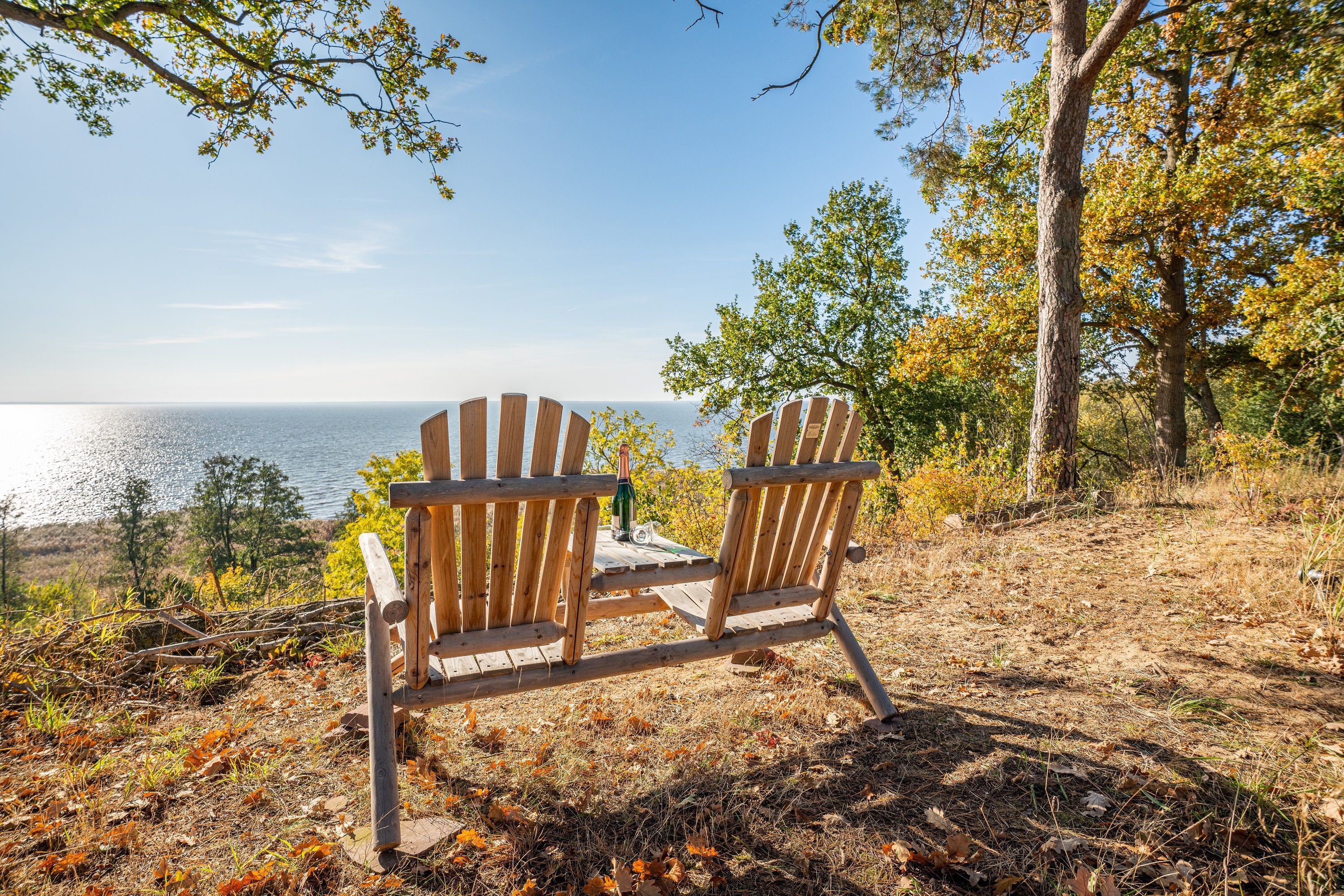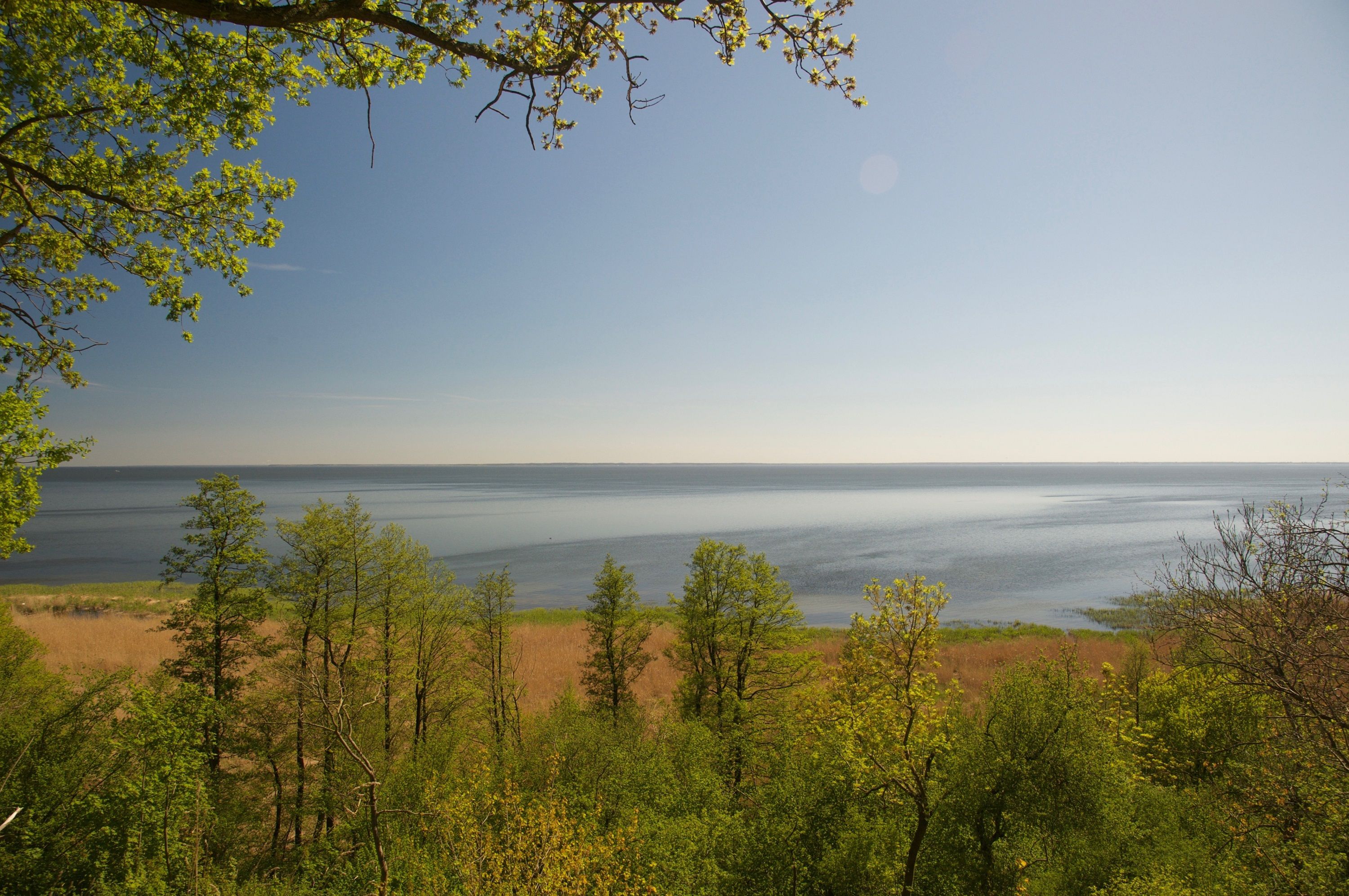 Werfen Sie nun einen Blick nach draußen: Sie haben einen großartigen, durch alte Bäume gerahmten Blick über das Haff, welches sich beinahe bis zum Horizont erstreckt. Im Schilfgürtel verstecken viele Vogelnester und Kinderstuben des Wildes. Hier sind Sie wirklich mitten in der Natur und vielleicht zieht sogar ein Seeadler gerade seine Kreise?
