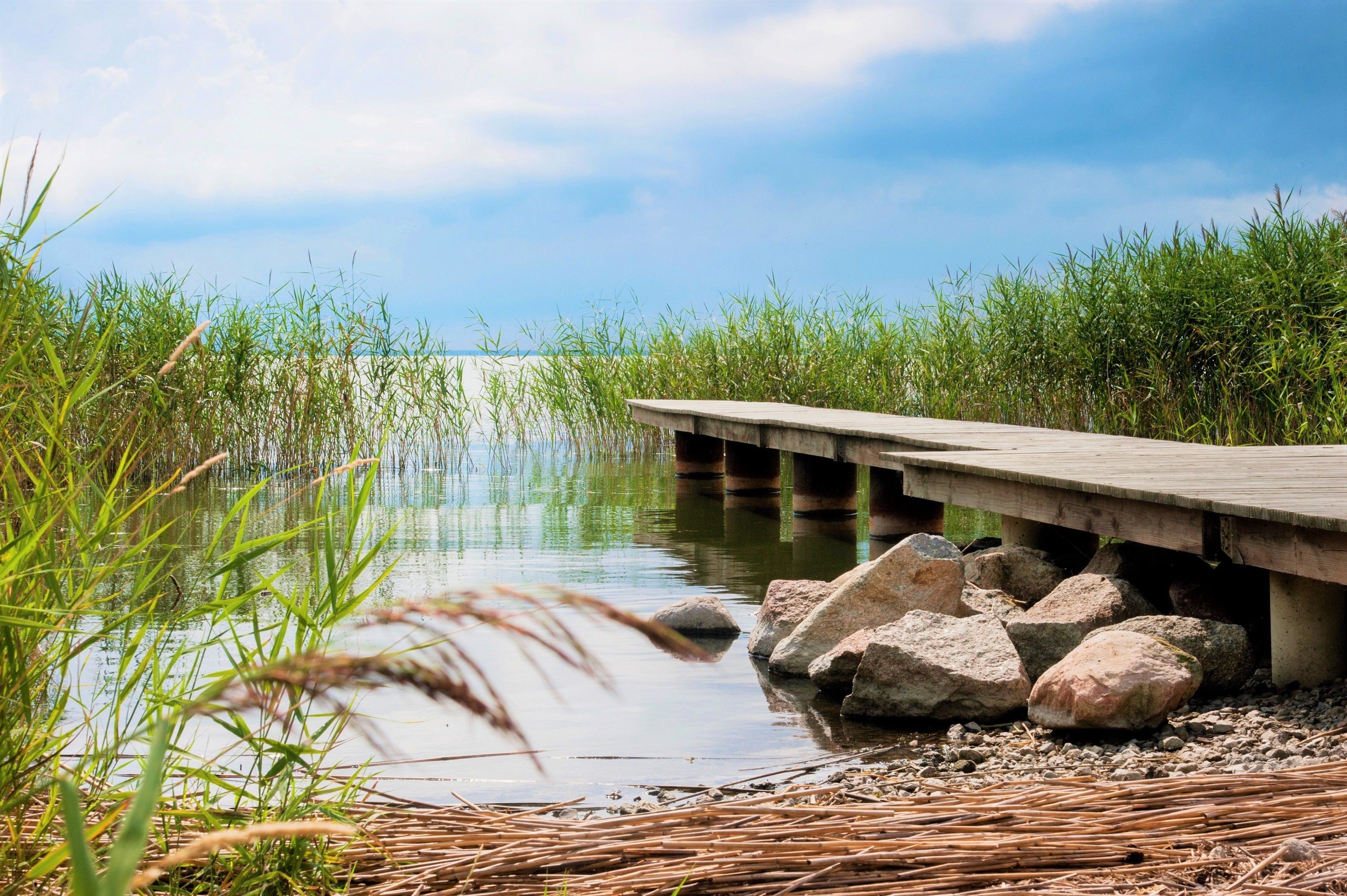 Als Gast des Ferienhauses haben Sie Zugang zu einem privaten Badesteg, der von nur wenigen weiteren Feriengästen gemeinschaftlich genutzt werden kann. Hier hört man nur noch das Rauschen der Wellen und des Schilfs. Den Badesteg erreichen Sie über das benachbarte Grundstück.