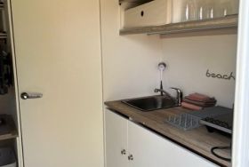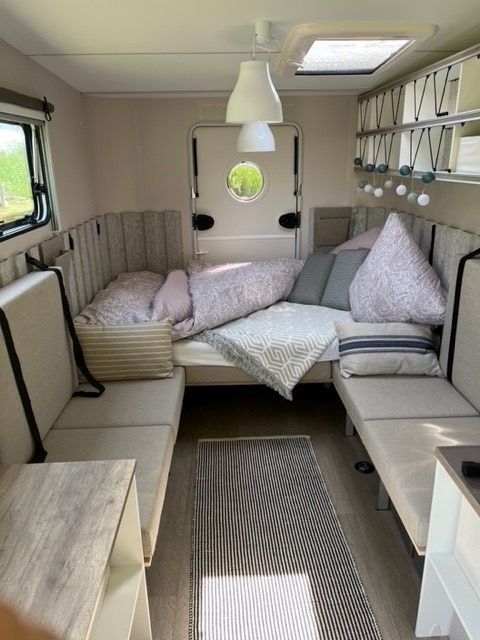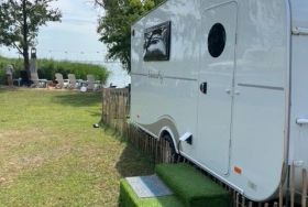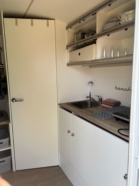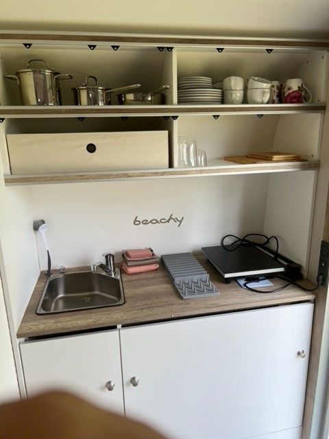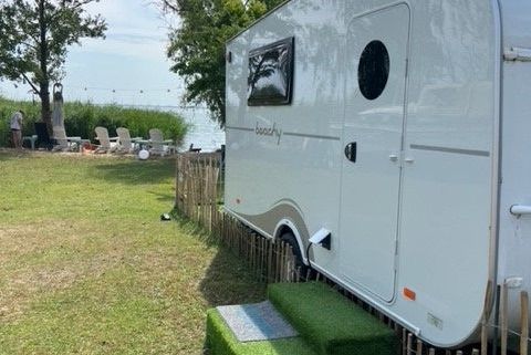 Der schnuckelige und absolut modern ausgestattete Beachy-Wohnwagen bietet Platz für zwei Personen und ist mit Sitzmöglichkeiten, Flat-TV, Doppelbett (1,60m x2,00m) und einer Küchenzeile ausgestattet.
