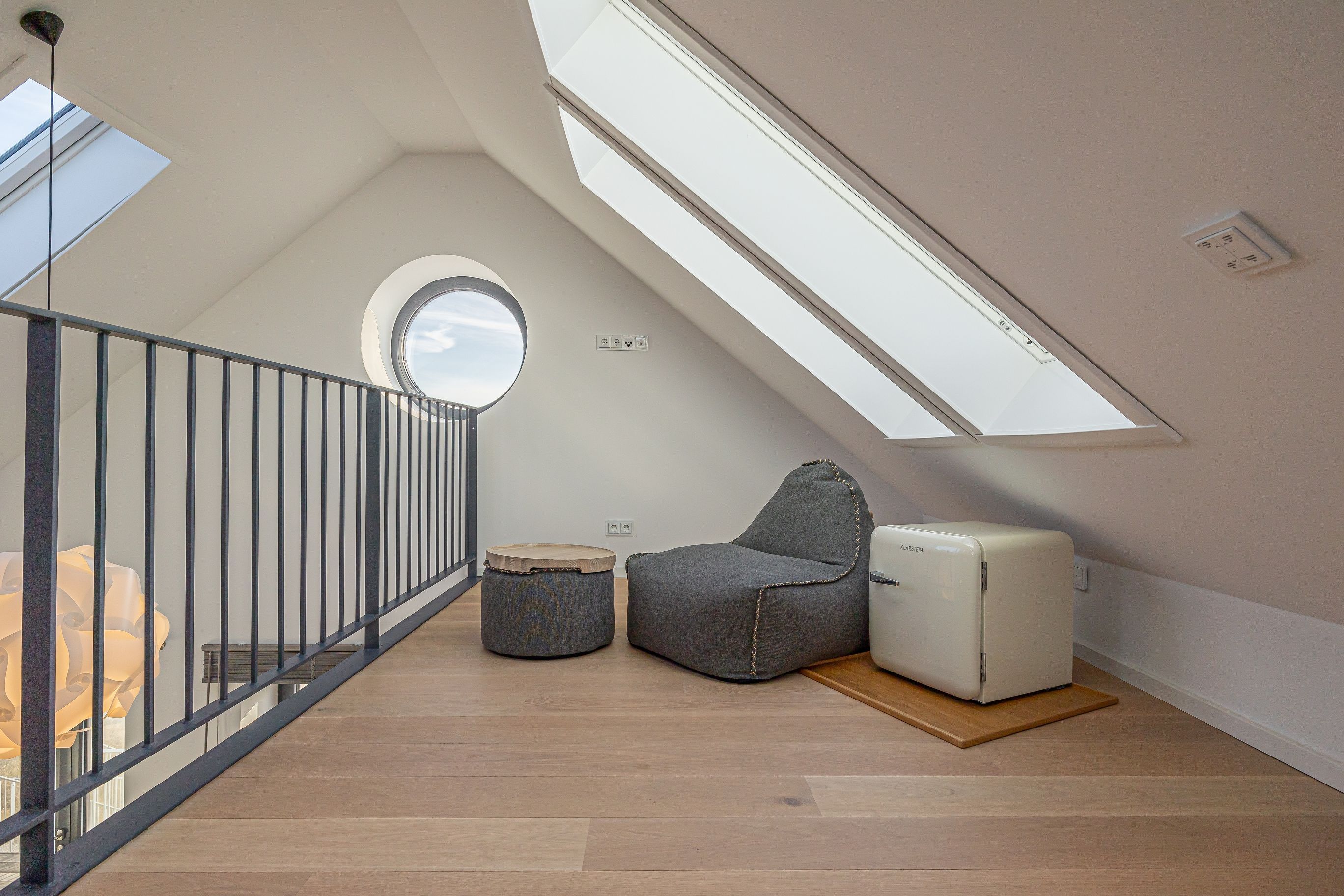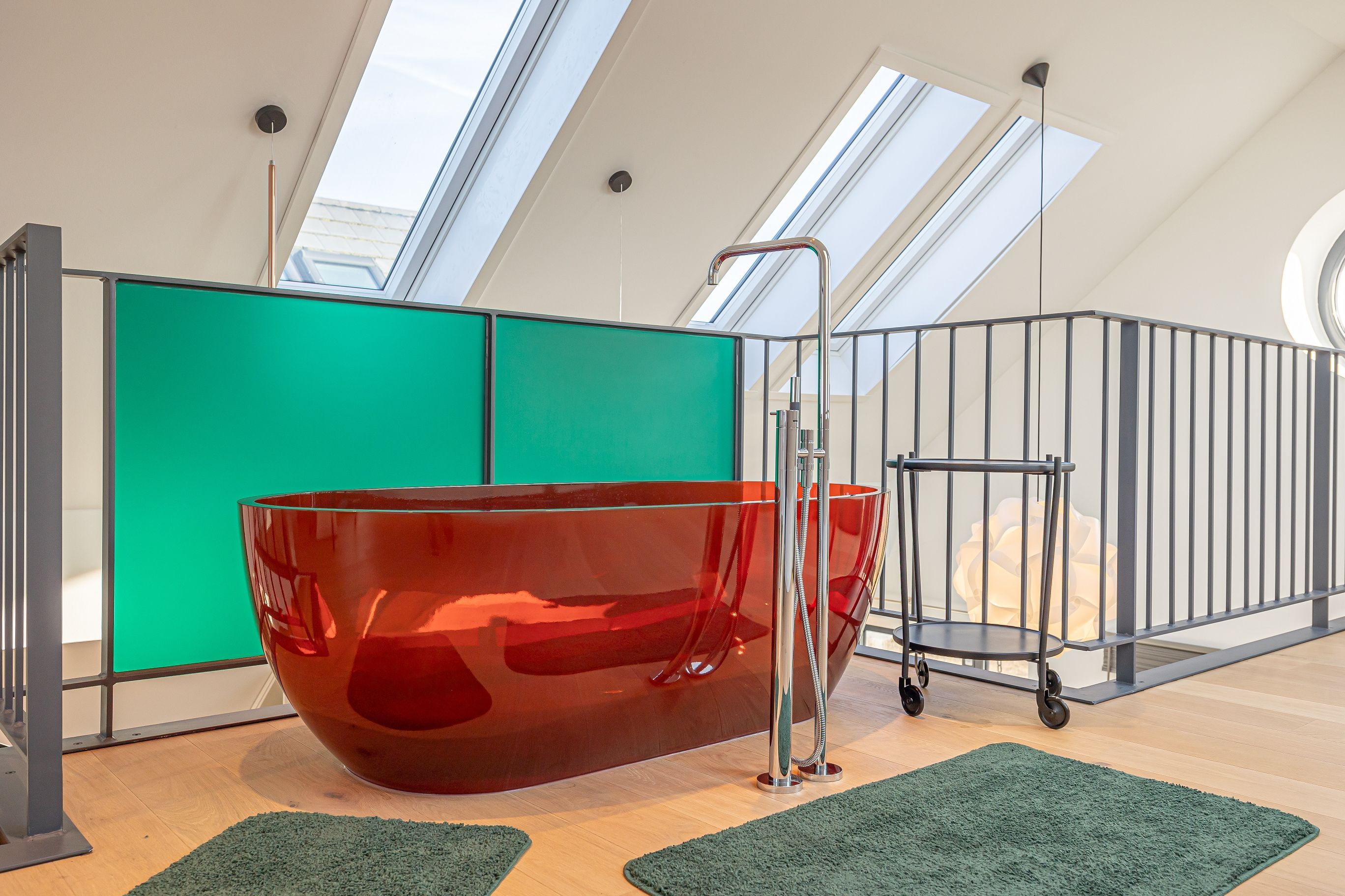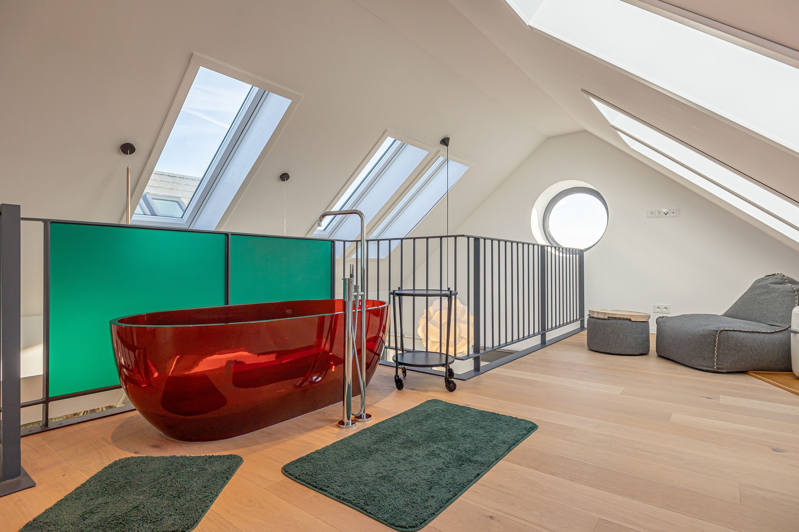 Das obere Stockwerk ist ein weiteres Highlight der Wohnung: Hier finden Sie eine freistehende Badewanne, die ein luxuriöses Badeerlebnis verspricht, sowie eine zweite Schlafmöglichkeit. Von hier aus genießen Sie atemberaubende Ausblicke, die den Raum zu etwas ganz Besonderem machen.