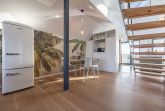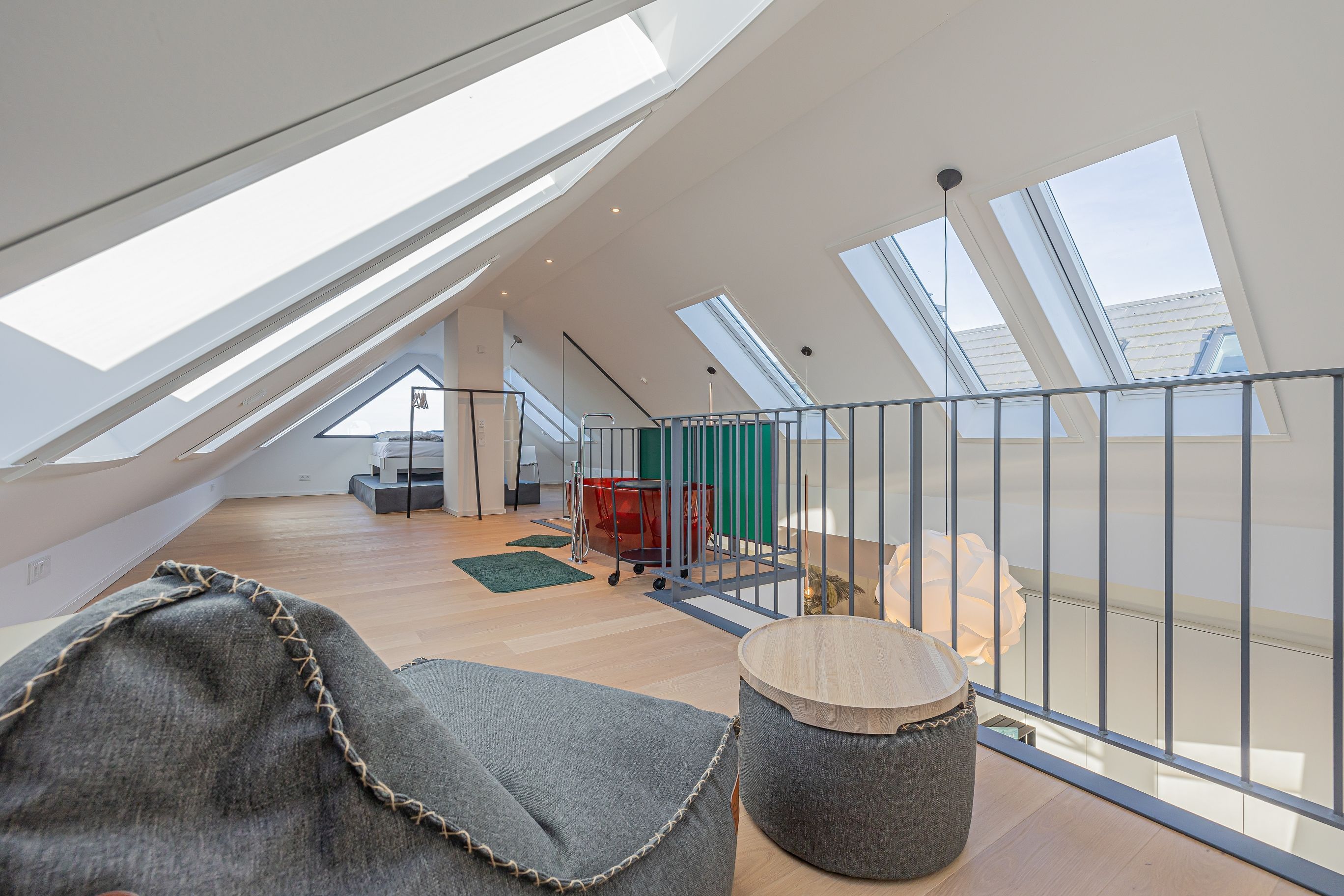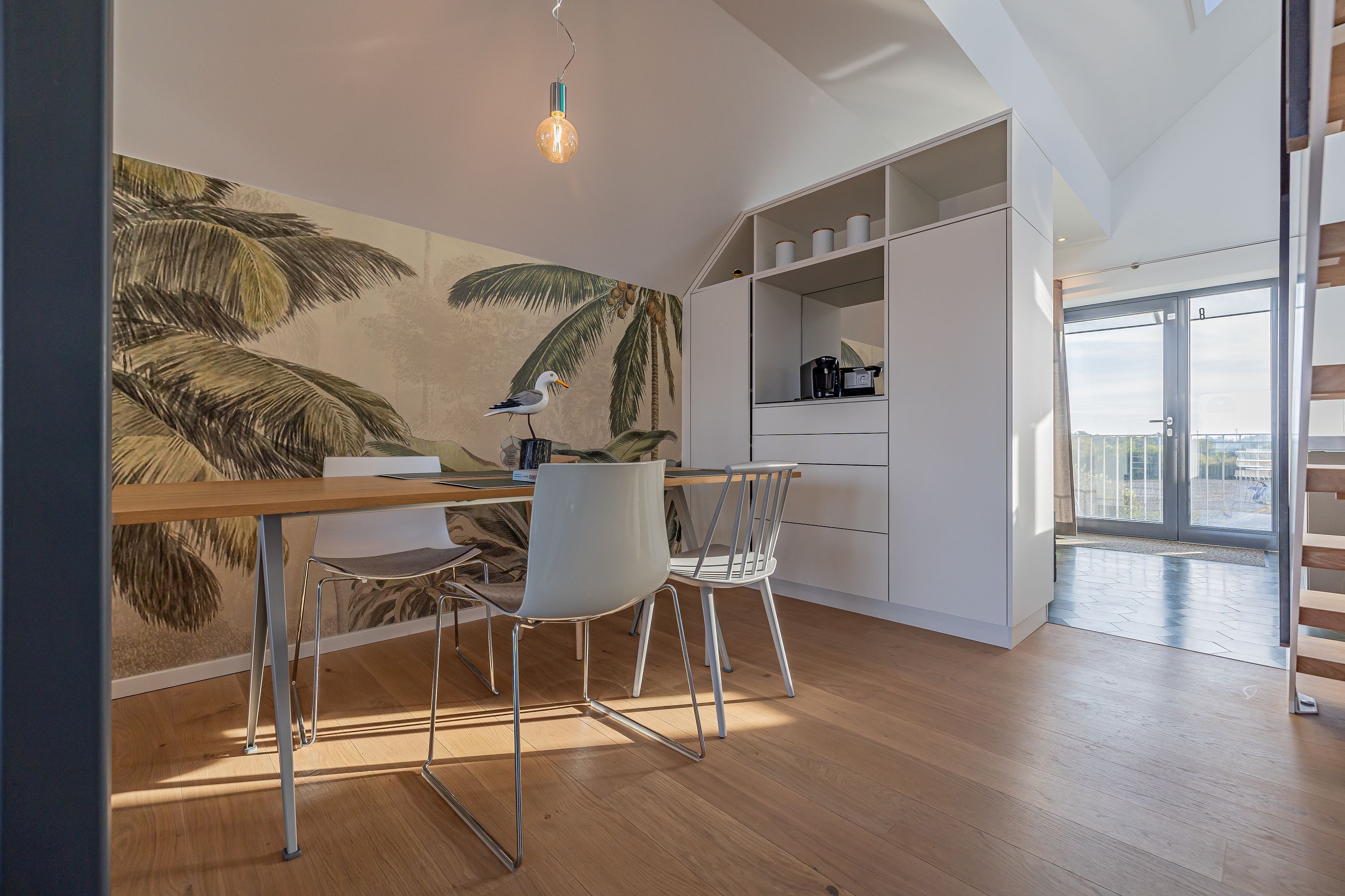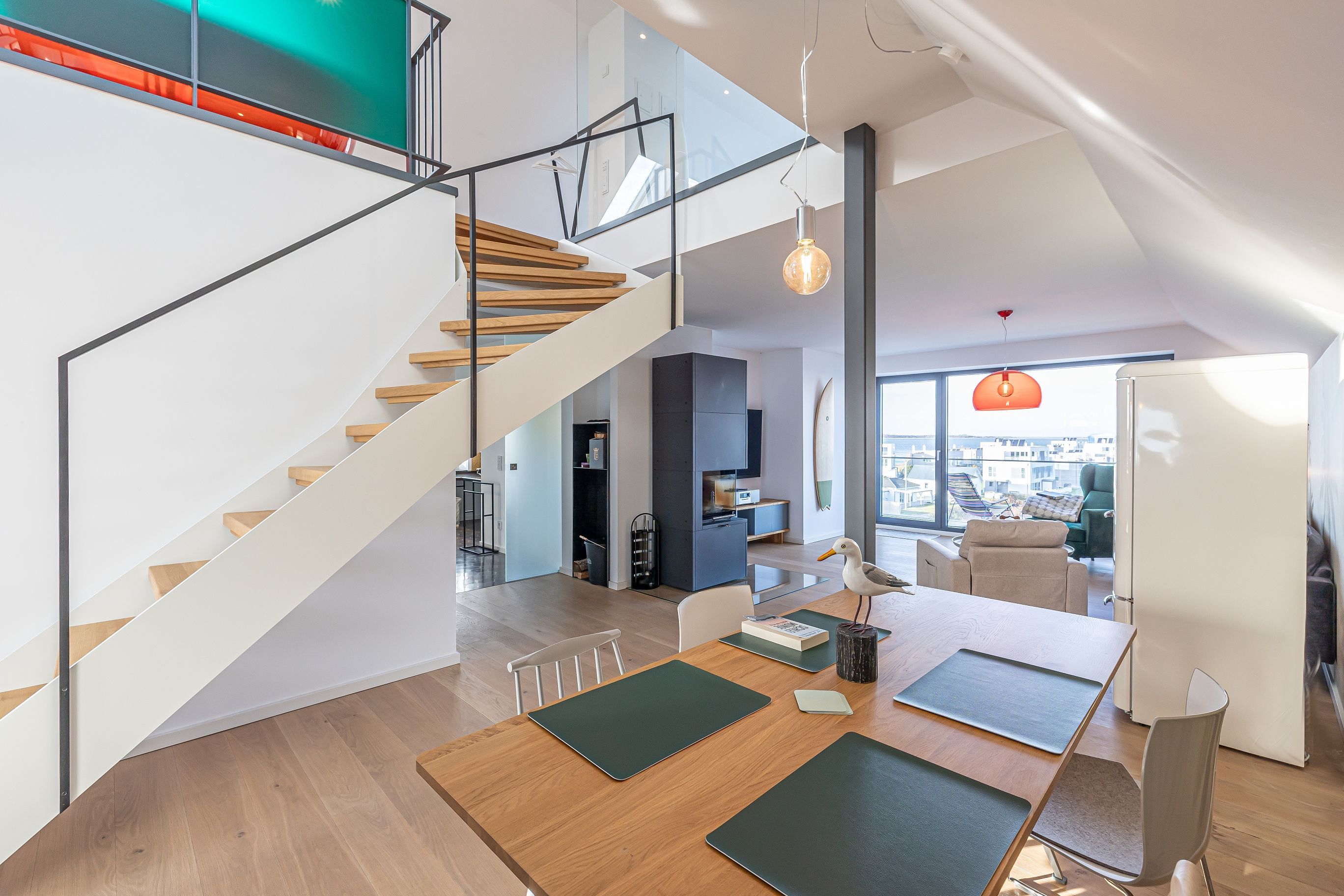 Das obere Stockwerk ist ein weiteres Highlight der Wohnung: Hier finden Sie eine freistehende Badewanne, die ein luxuriöses Badeerlebnis verspricht, sowie eine zweite Schlafmöglichkeit. Von hier aus genießen Sie atemberaubende Ausblicke, die den Raum zu etwas ganz Besonderem machen.